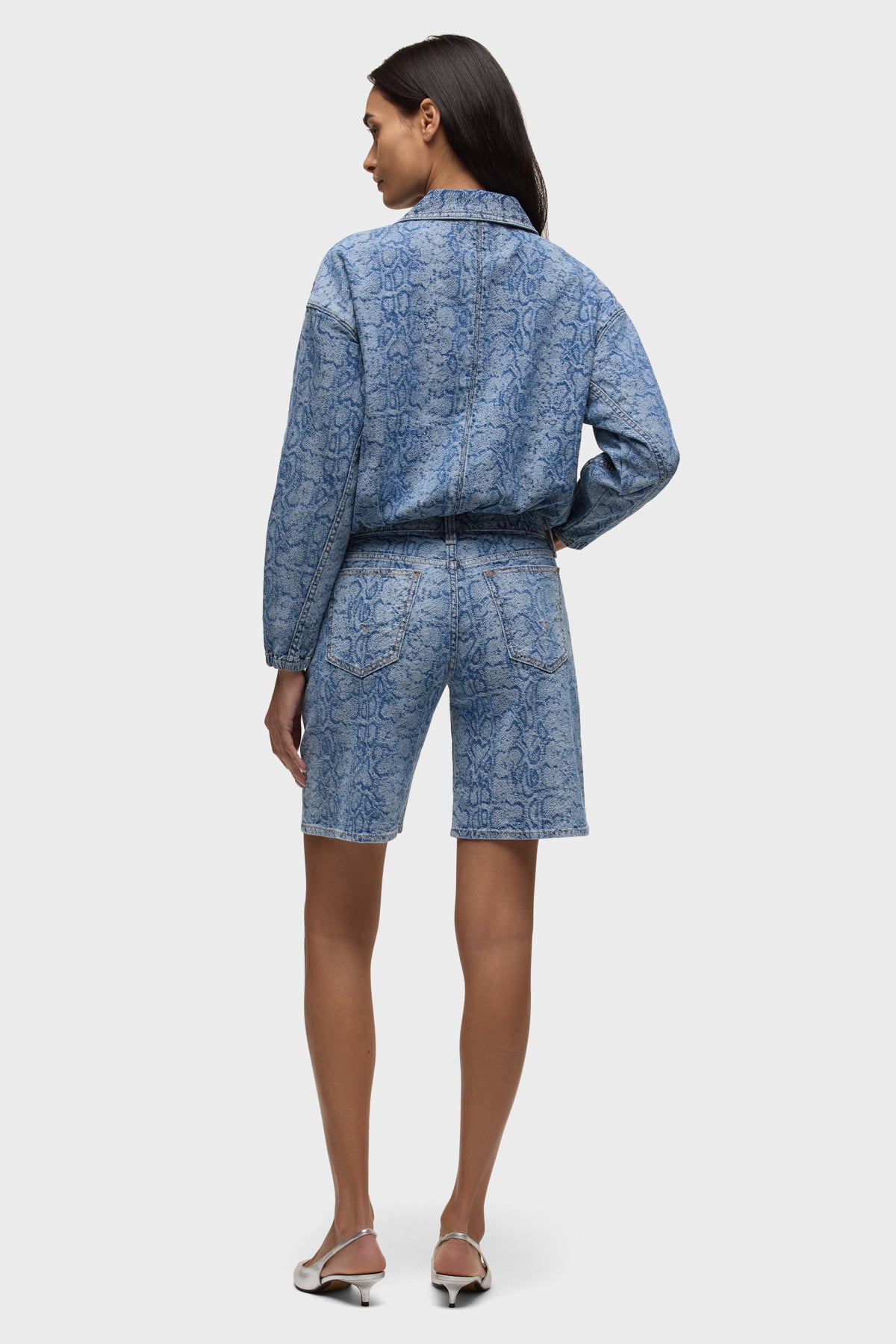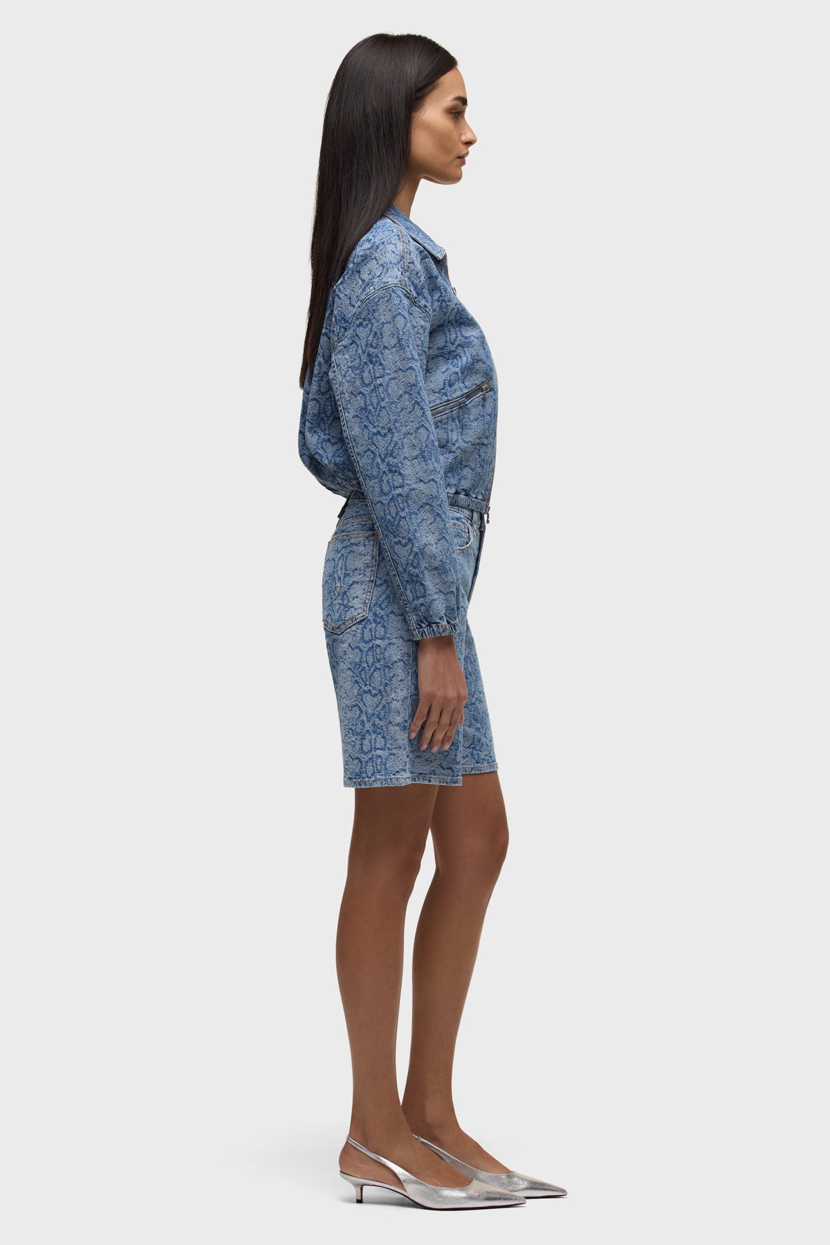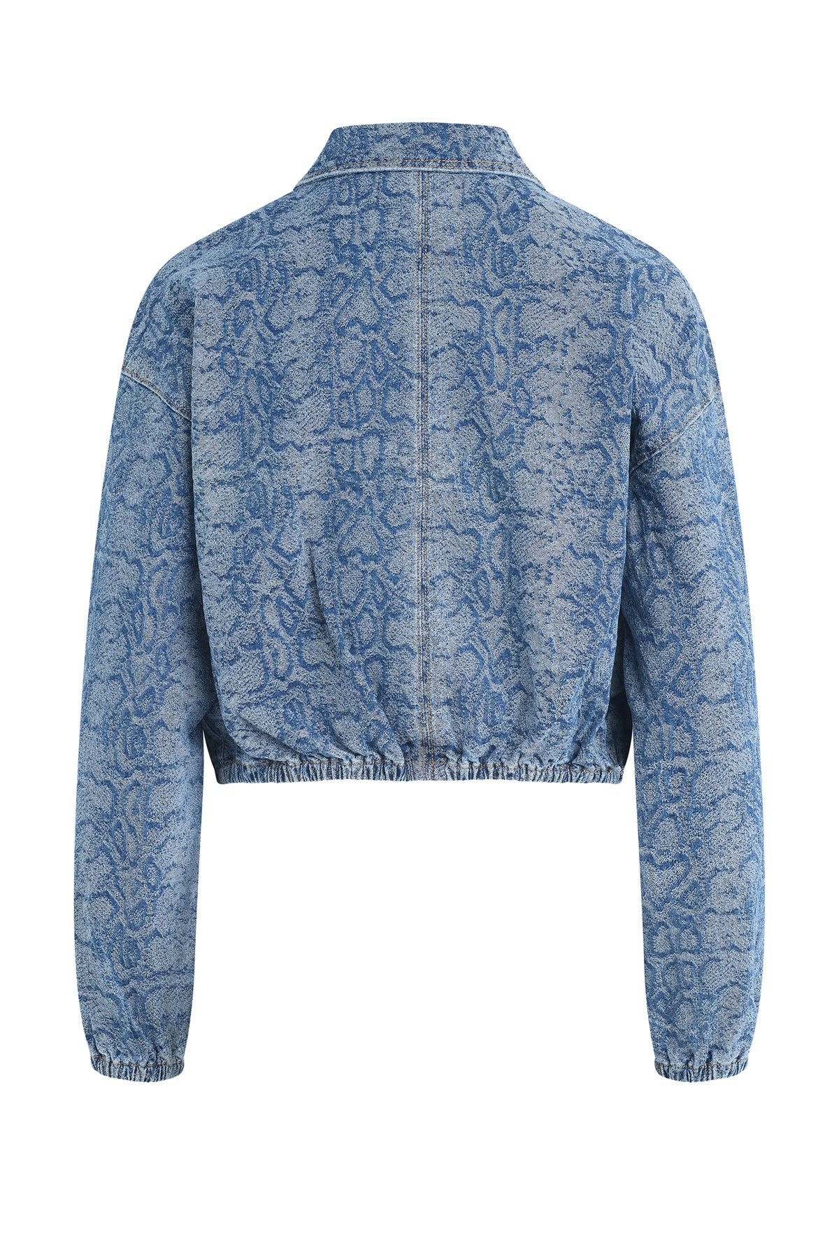 The Cropped Zip-Up Jacket in Venom is a bomber-inspired unlined jacket. The star of this style is the snake jacquard in a medium indigo wash on slightly stretchy denim. It is finished with a two-way zipper at the center front with zipper pockets. -
