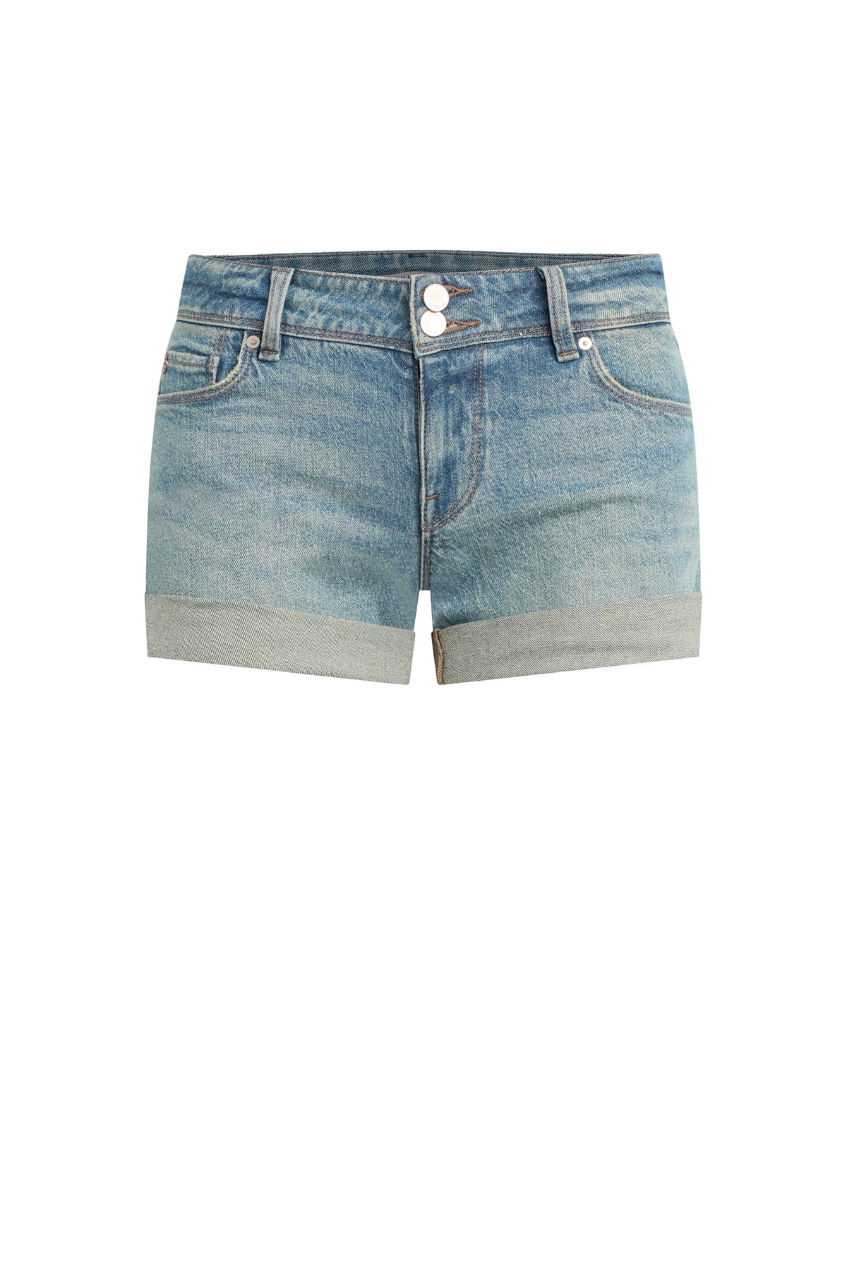 Featuring our signature original flap pocket with the Union Jack flag, the Croxley Mid-Rise Short in Snow Drops features a rolled-hem staple that hits right above mid-thigh. This pair is cut from comfort stretch denim made of recycled cotton in a vintage-inspired light indigo wash. -