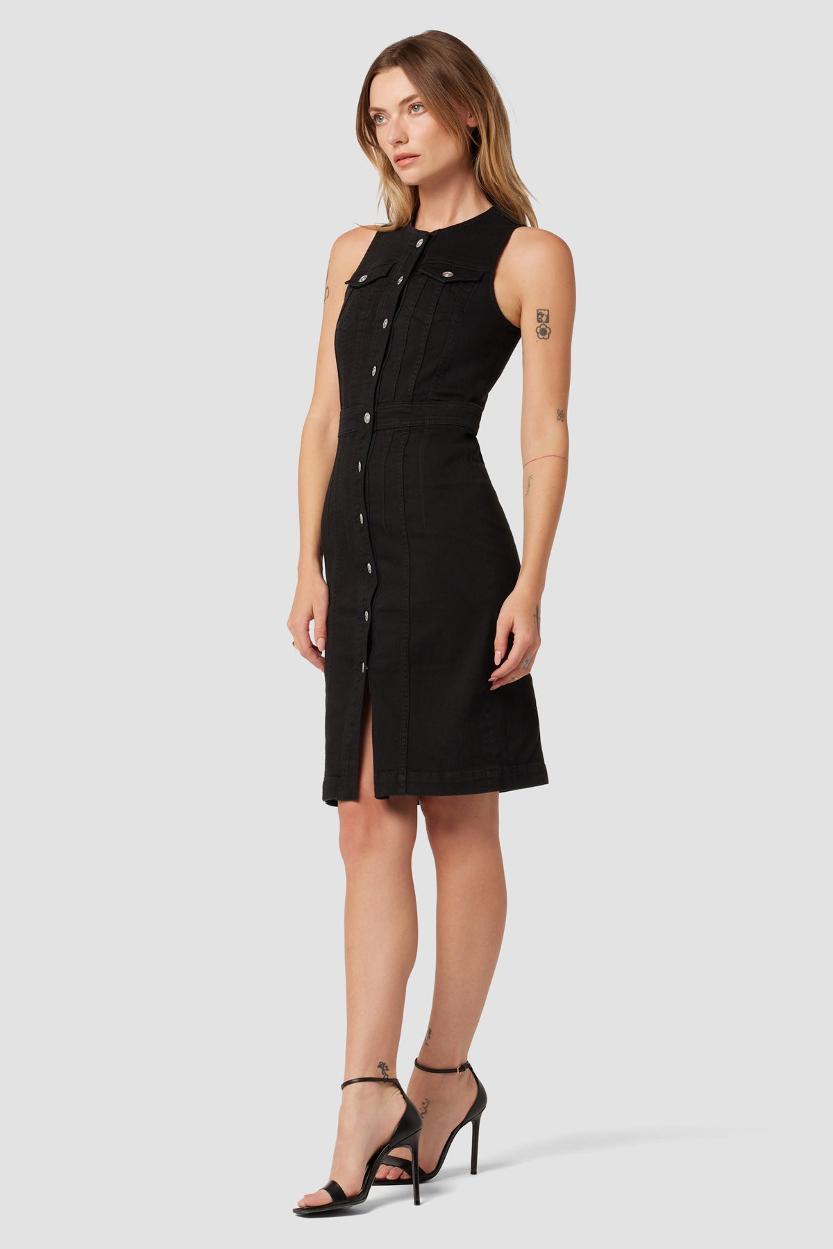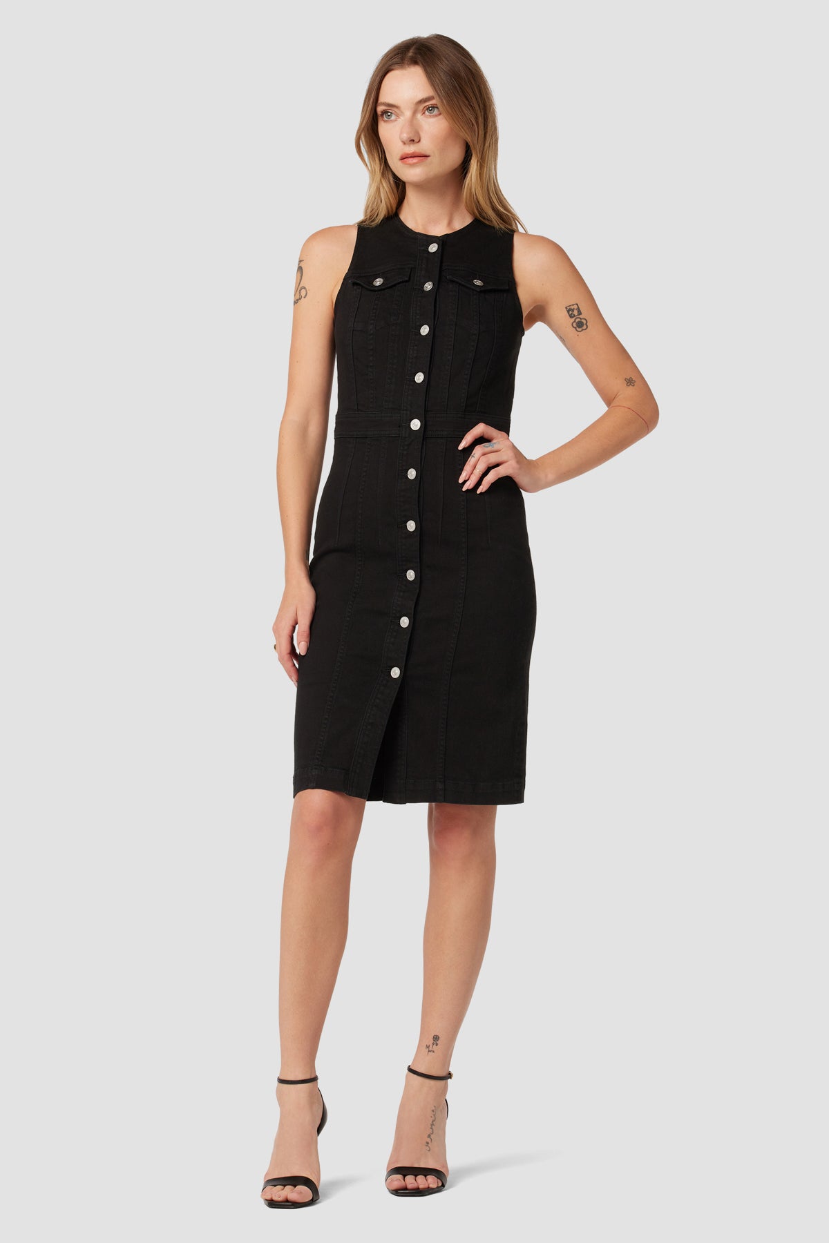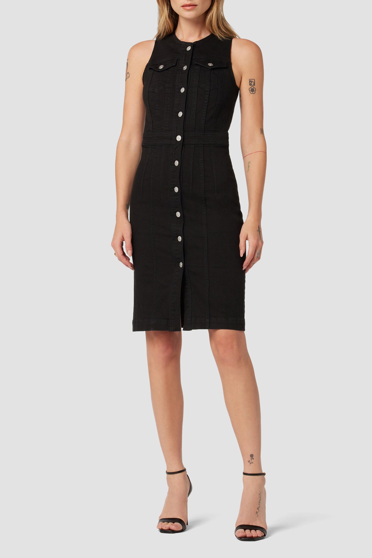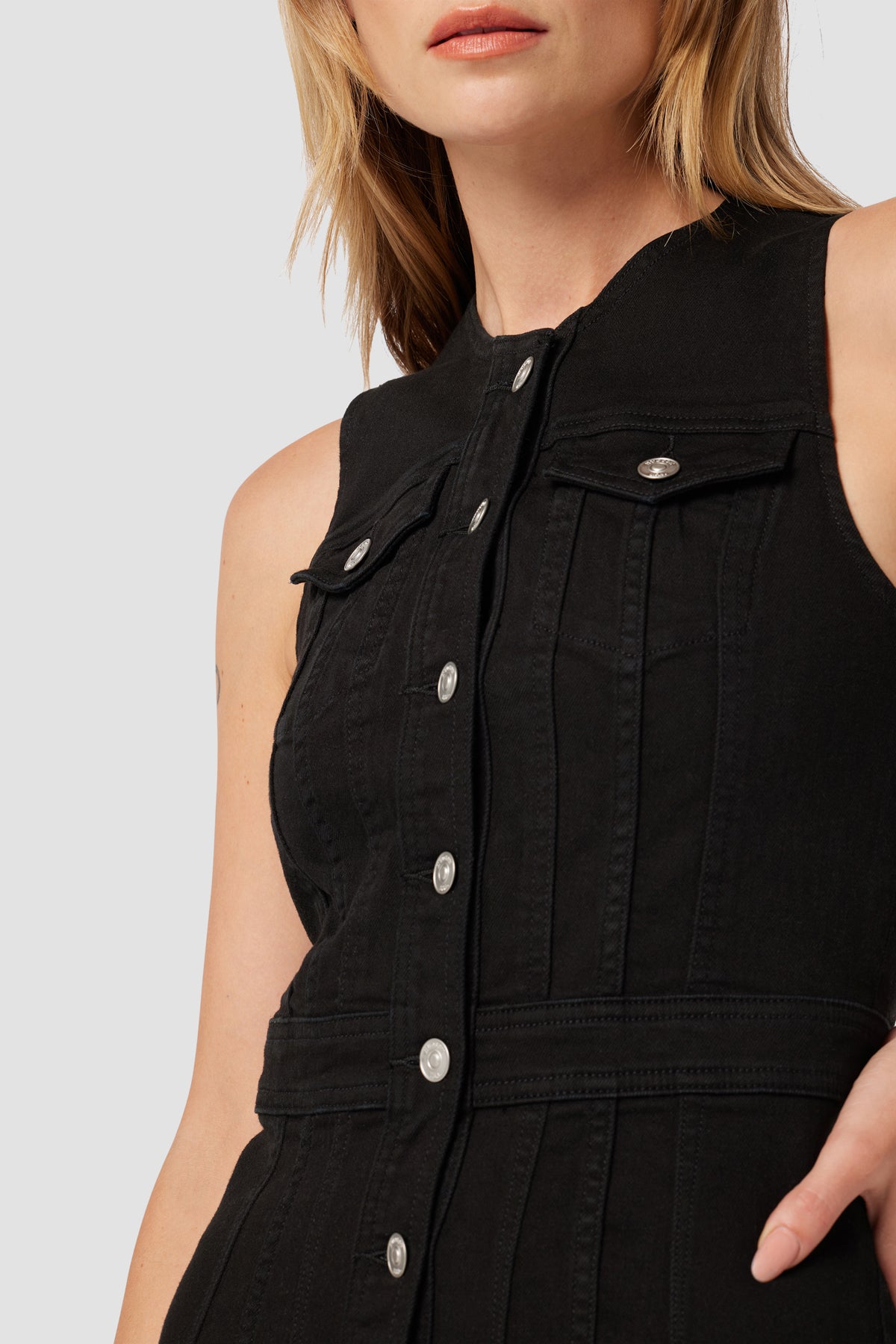 Our Cut In Denim Midi Dress in Black is a sleeveless standout made from premium comfort stretch denim with two chest pockets and button front closure. -