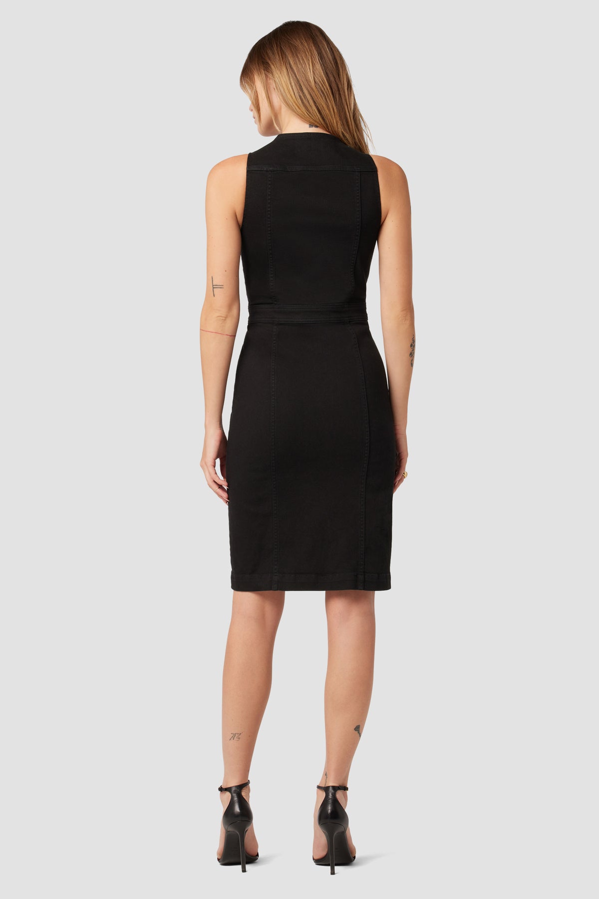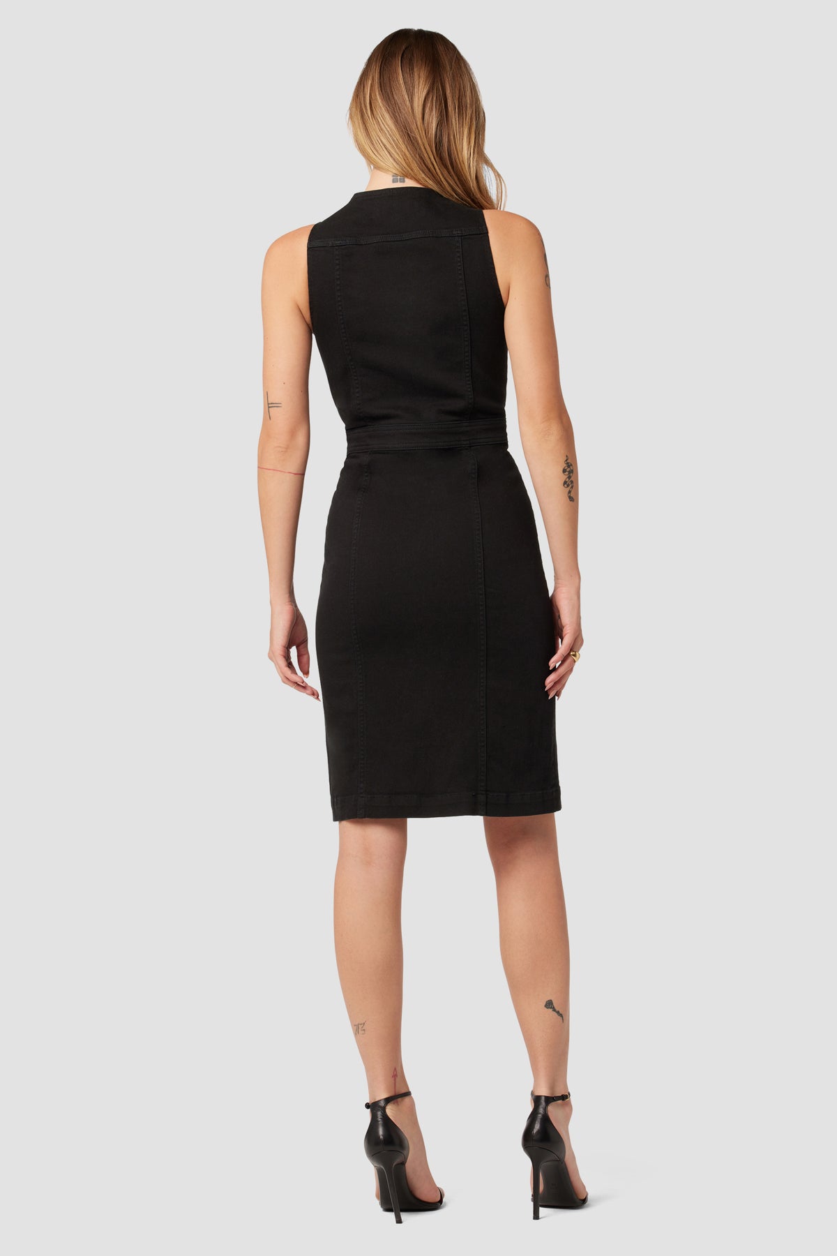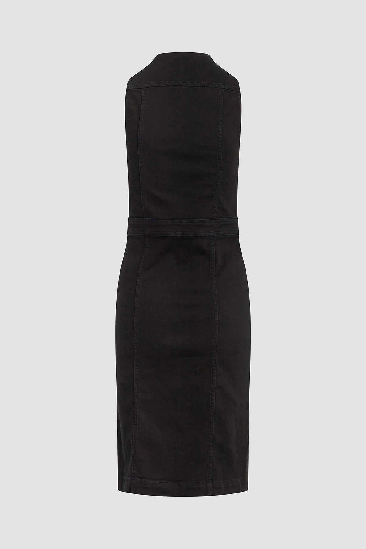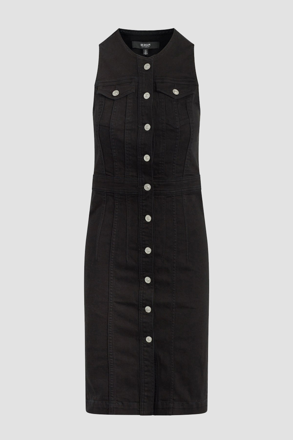 Our Cut In Denim Midi Dress in Black is a sleeveless standout made from premium comfort stretch denim with two chest pockets and button front closure. -
