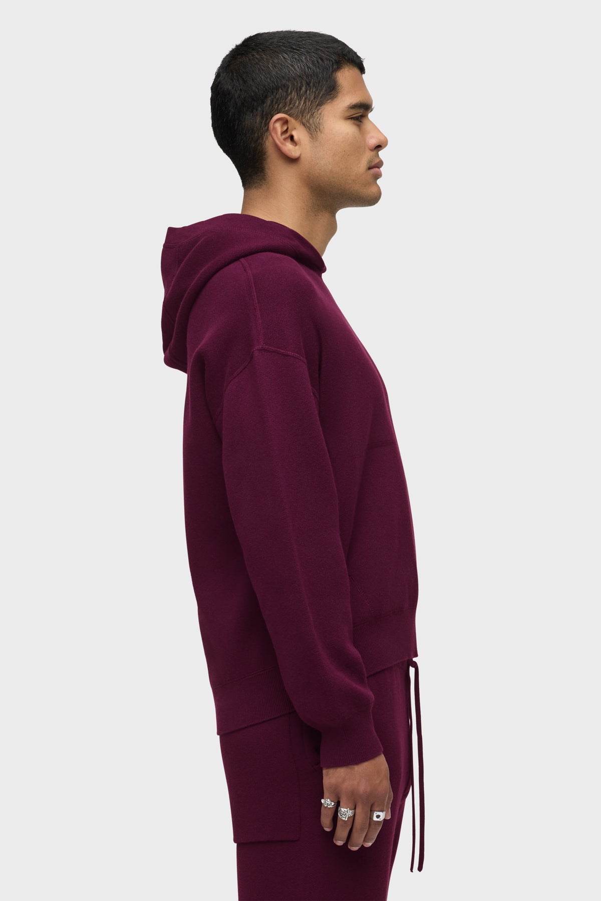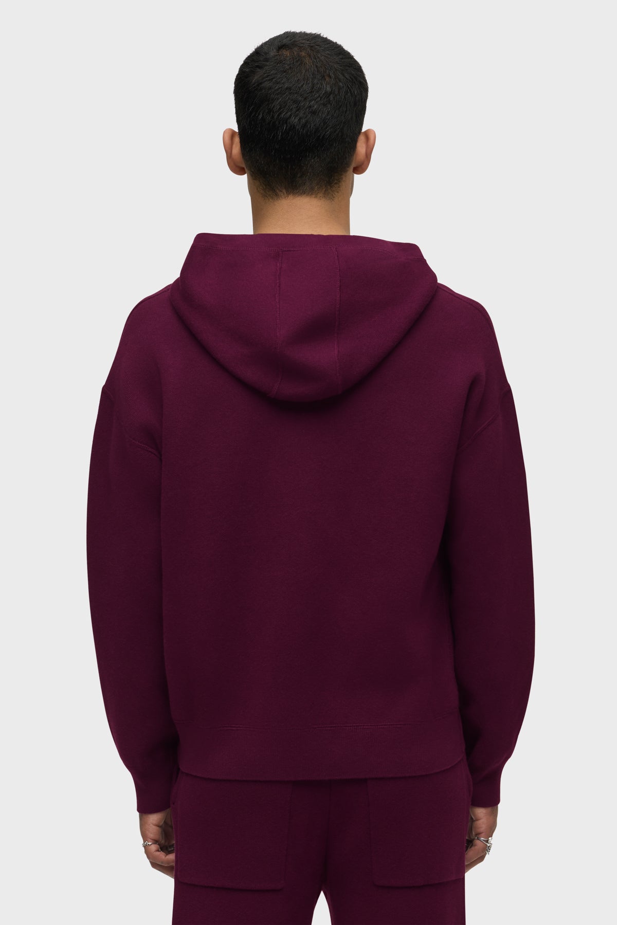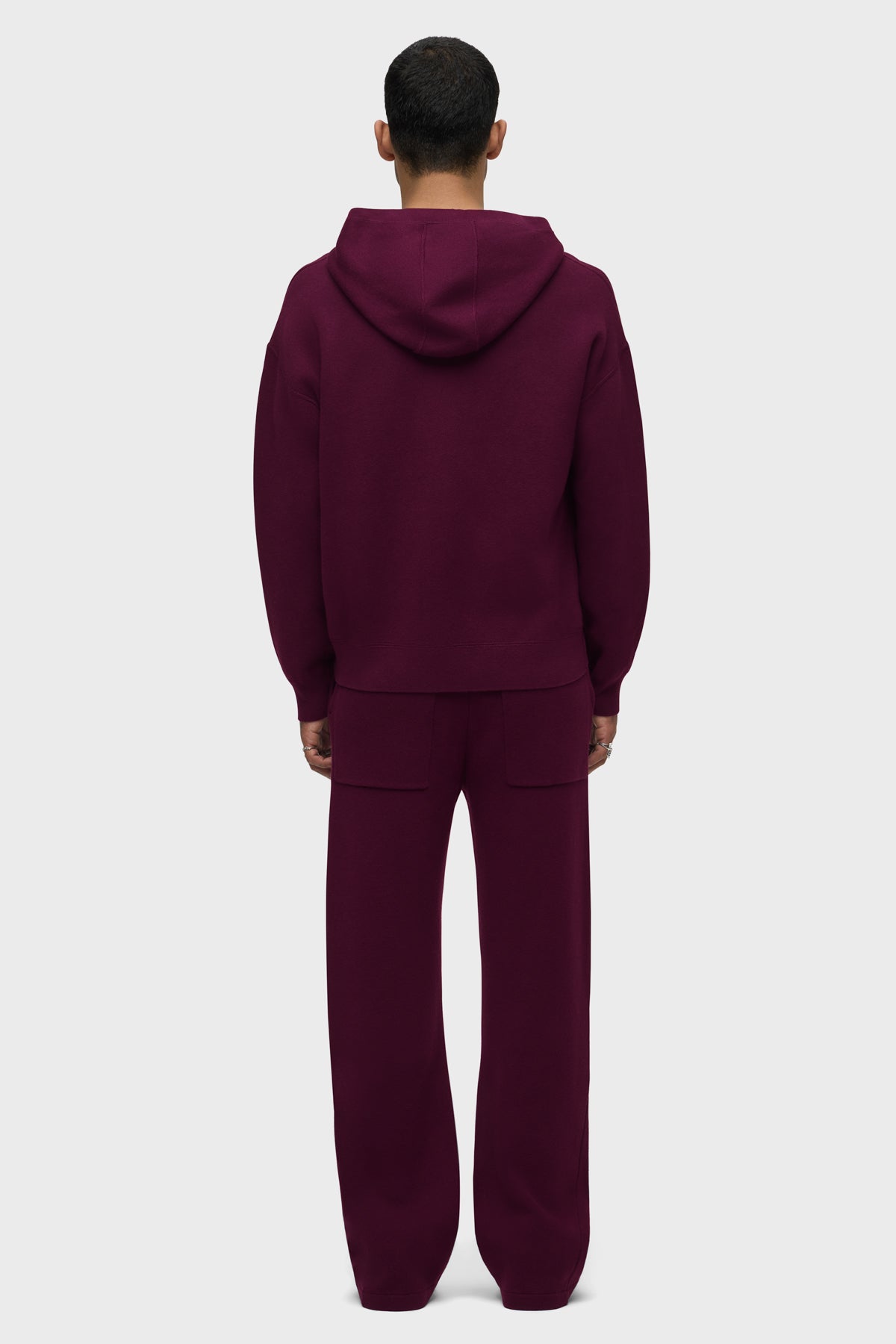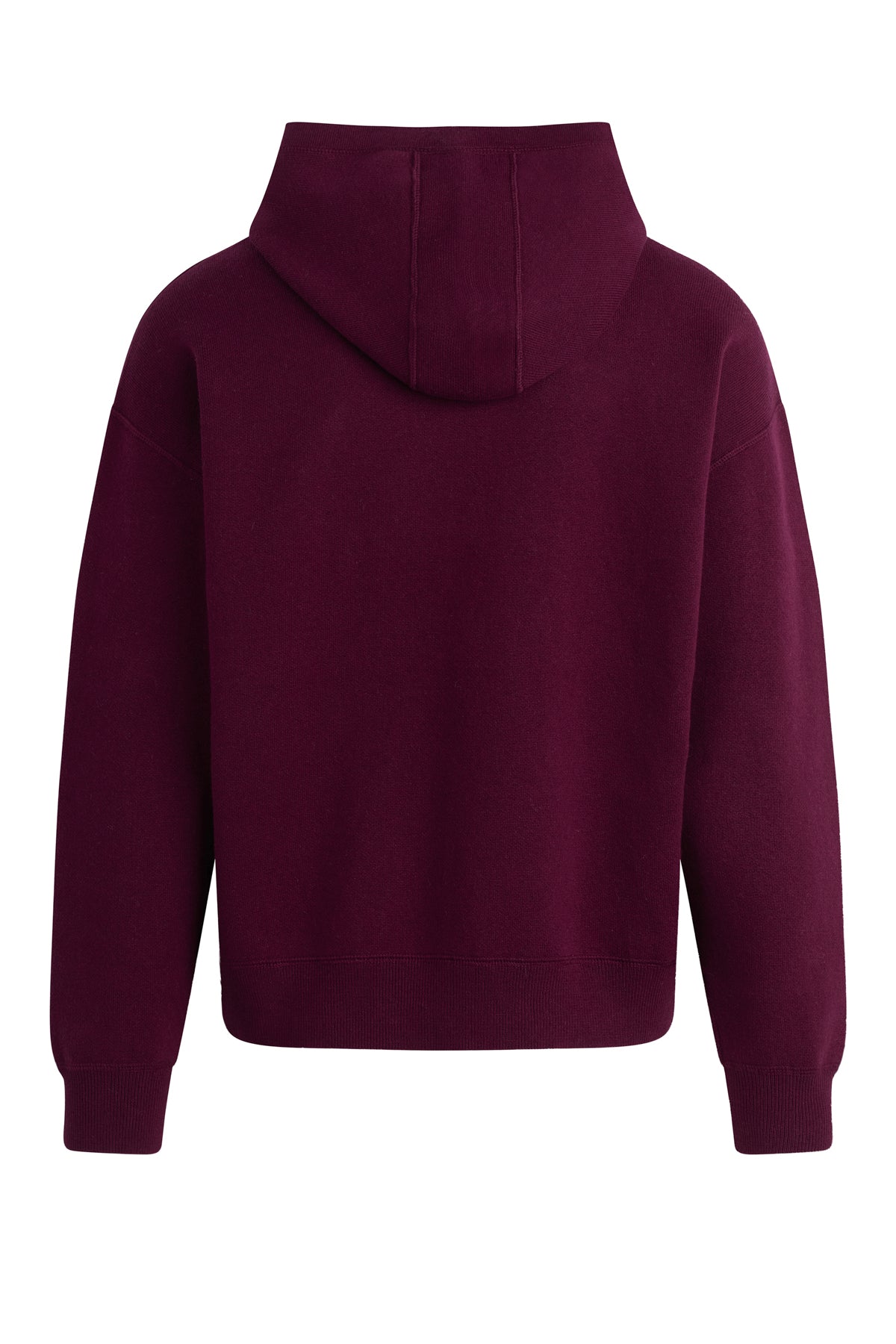The new Double Knit Hoodie in Bordeaux is designed with a relaxed fit and drop shoulders. Made from a soft cotton-cashmere blend, the hoodie is finished with reverse stitch details, ribbing at the hem and cuff, and a signature embossed logo at the back neckline. Pair this hoodie with our coordinating Double Knit Flare to make it a complete set. -