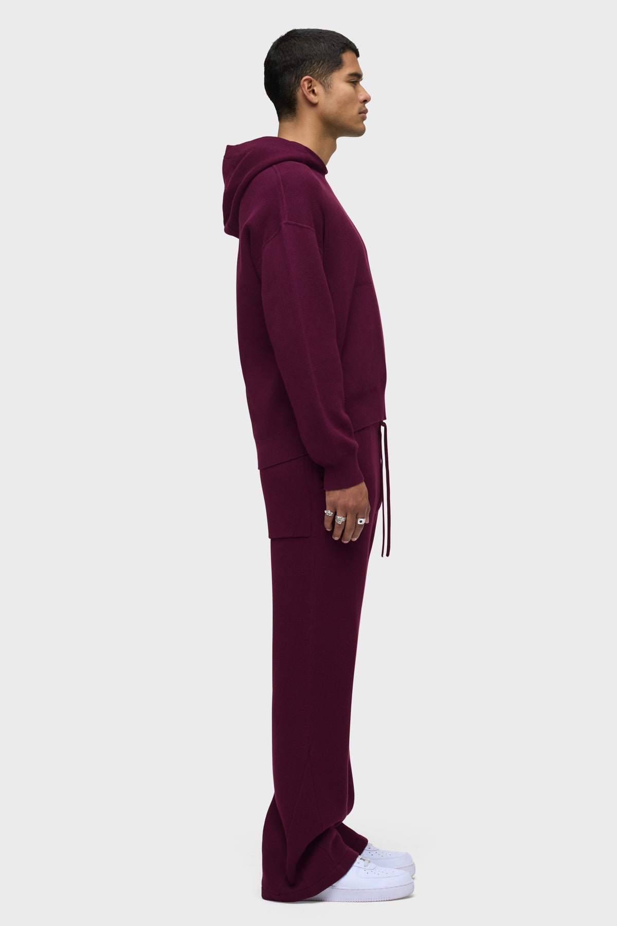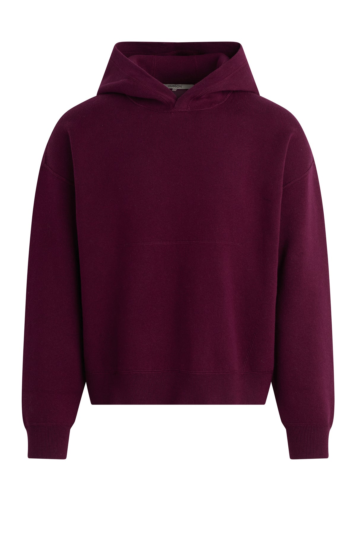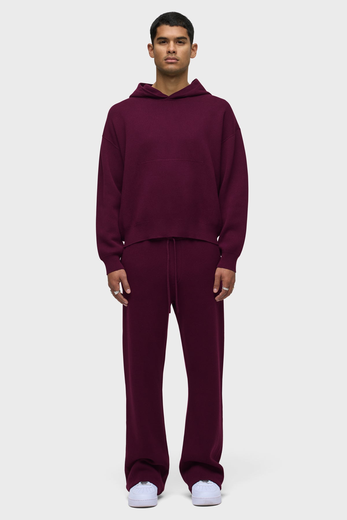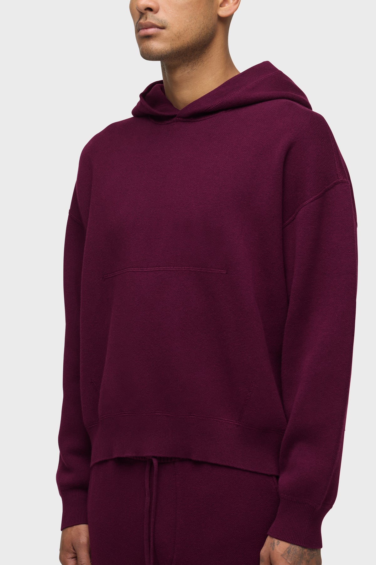 The new Double Knit Hoodie in Bordeaux is designed with a relaxed fit and drop shoulders. Made from a soft cotton-cashmere blend, the hoodie is finished with reverse stitch details, ribbing at the hem and cuff, and a signature embossed logo at the back neckline. Pair this hoodie with our coordinating Double Knit Flare to make it a complete set. -