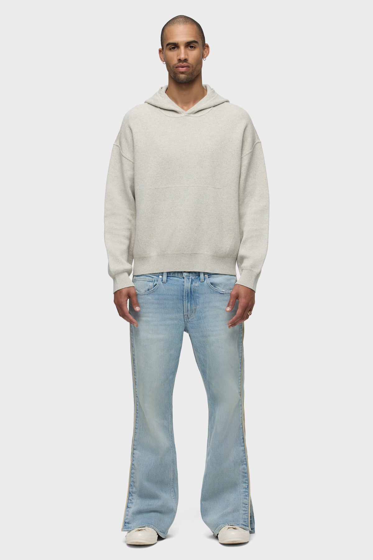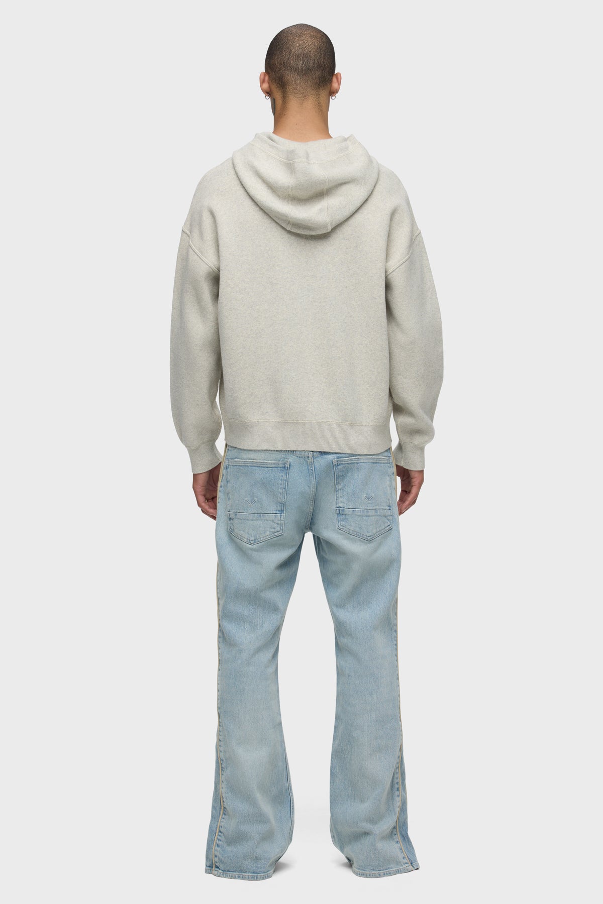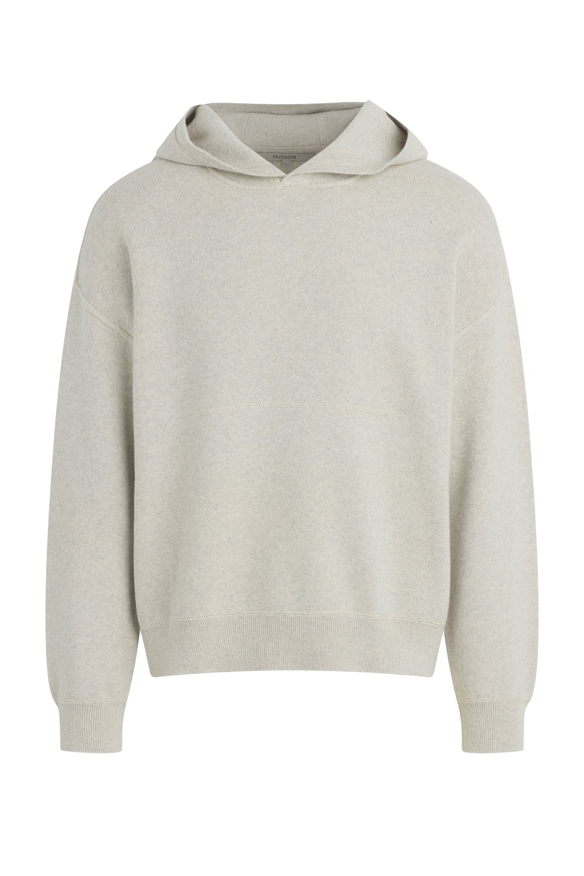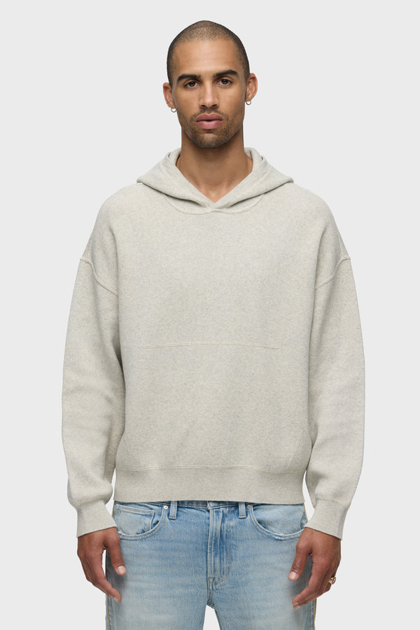 The new Double Knit Hoodie in Oatmeal is designed for a relaxed fit with drop shoulders. Made from a soft, cotton-cashmere blend, the hoodie is finished with reverse stitch details, ribbing at the hem and cuff along with signature embossed logo at the back neckline. Pair as a set with the coordinating Double Knit Flare. -