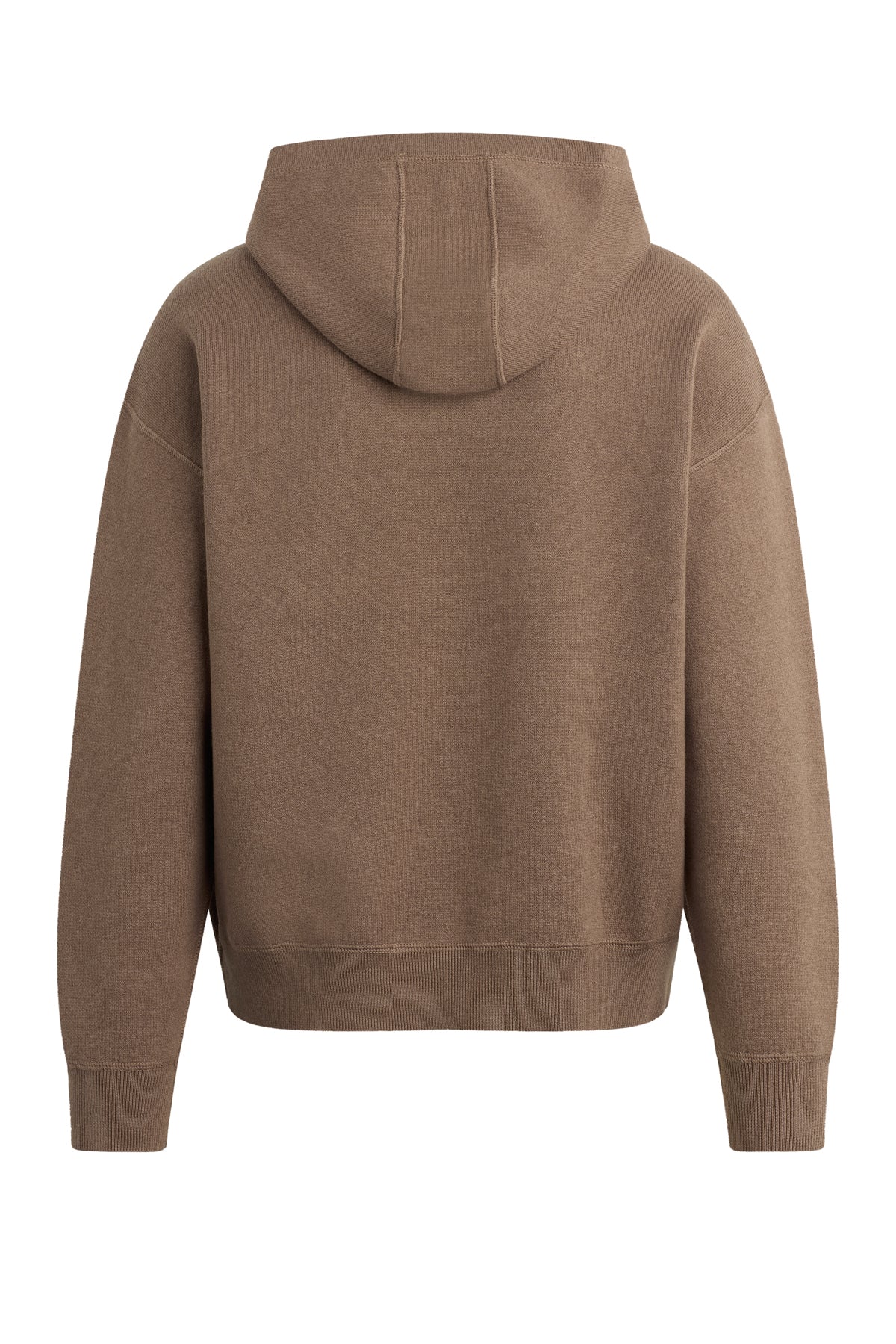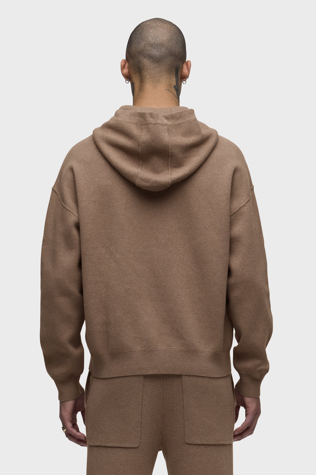The Double Knit Hoodie in Taupe is designed for a relaxed fit with drop shoulders. Made from a soft, cotton-cashmere blend, the hoodie is finished with reverse stitch details, ribbing at the hem and cuff along with a signature embossed logo at the back neckline. Pair it with the coordinating Double Knit Flare for a complete look. -