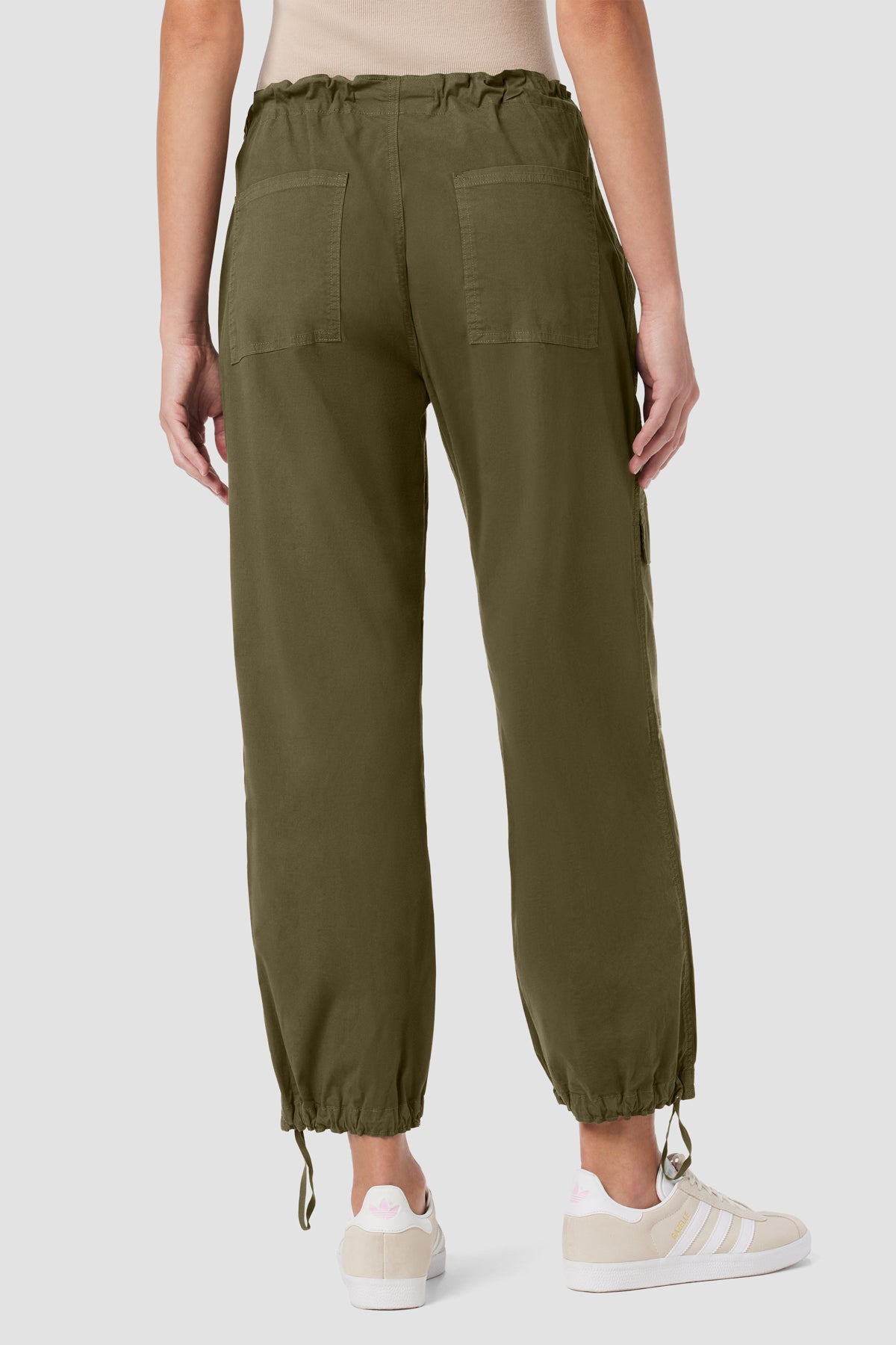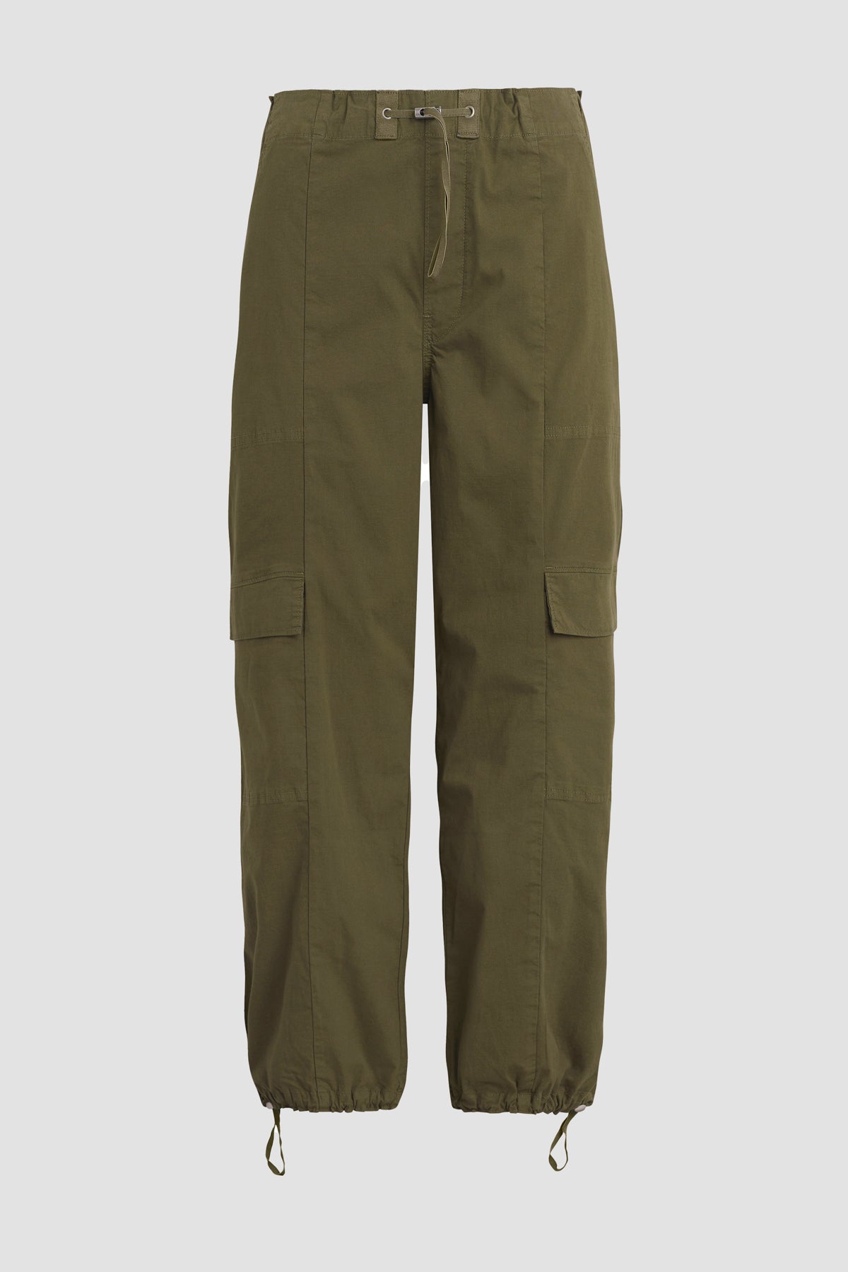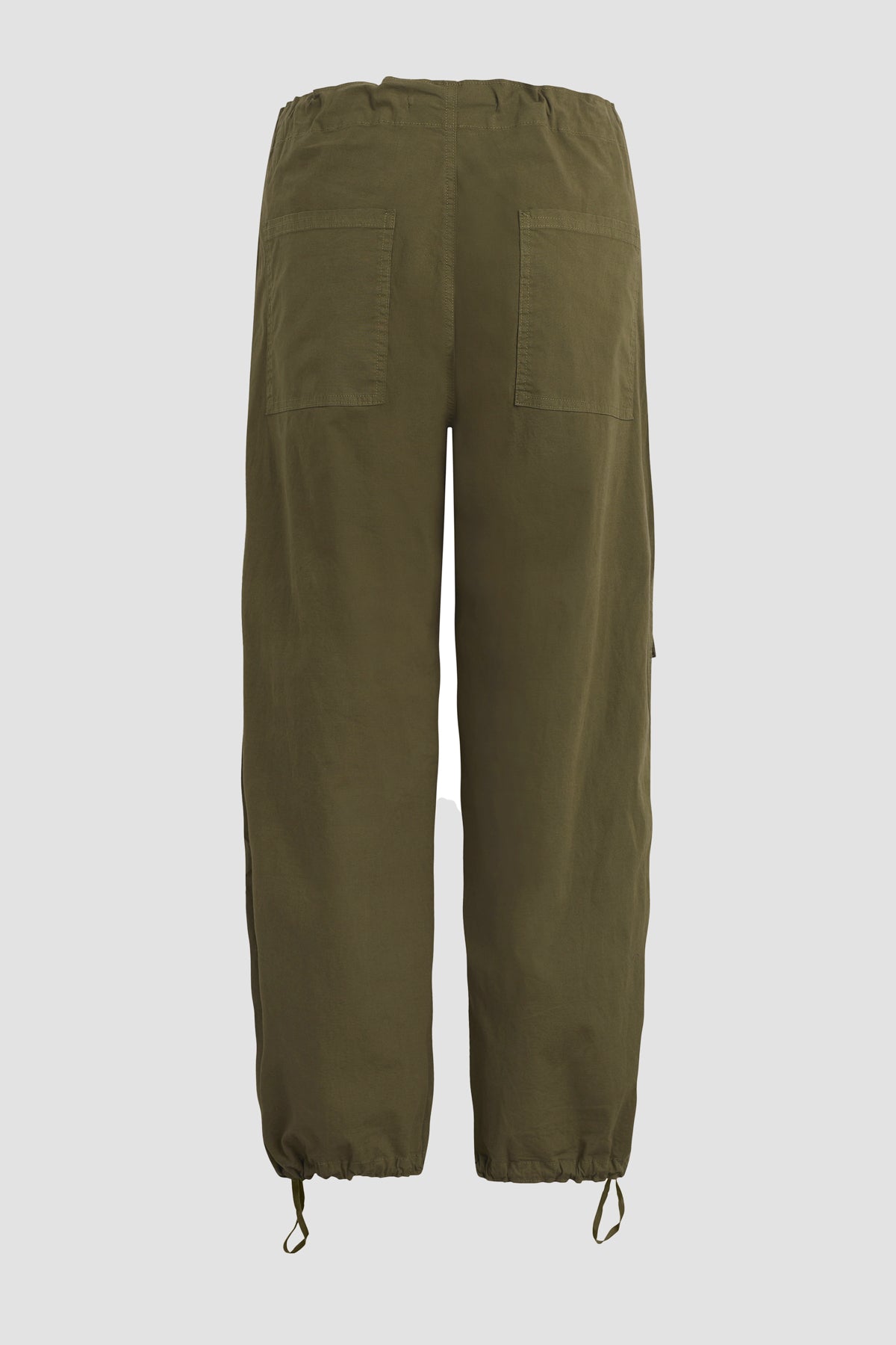 The Drawstring Cargo Parachute Pant is a nod to Y2K revival with drawstring detailing at waist and hem, an ideal ankle length and cargo pockets. Over-dyed in Cypress color, it is the season's denim alternative. -