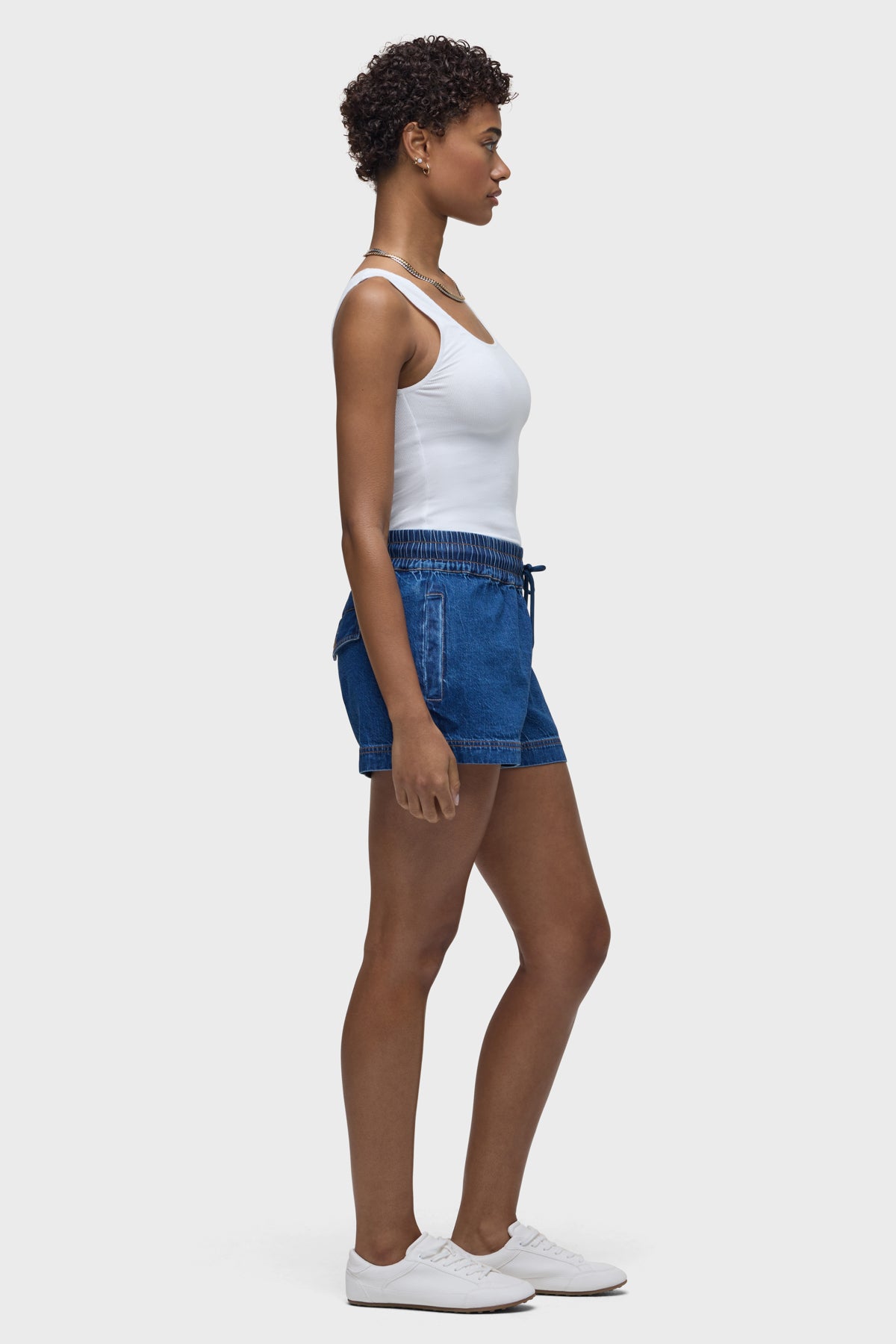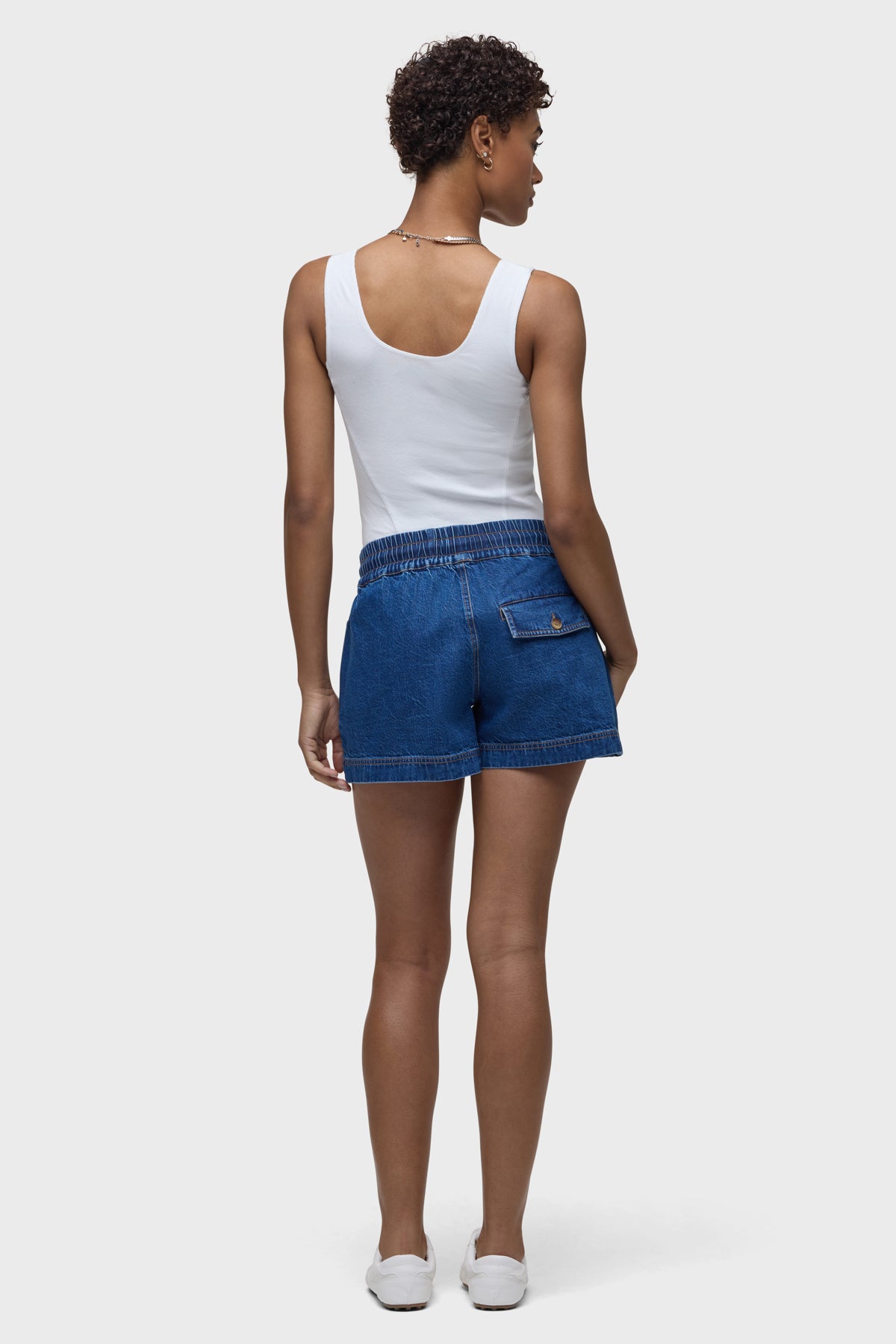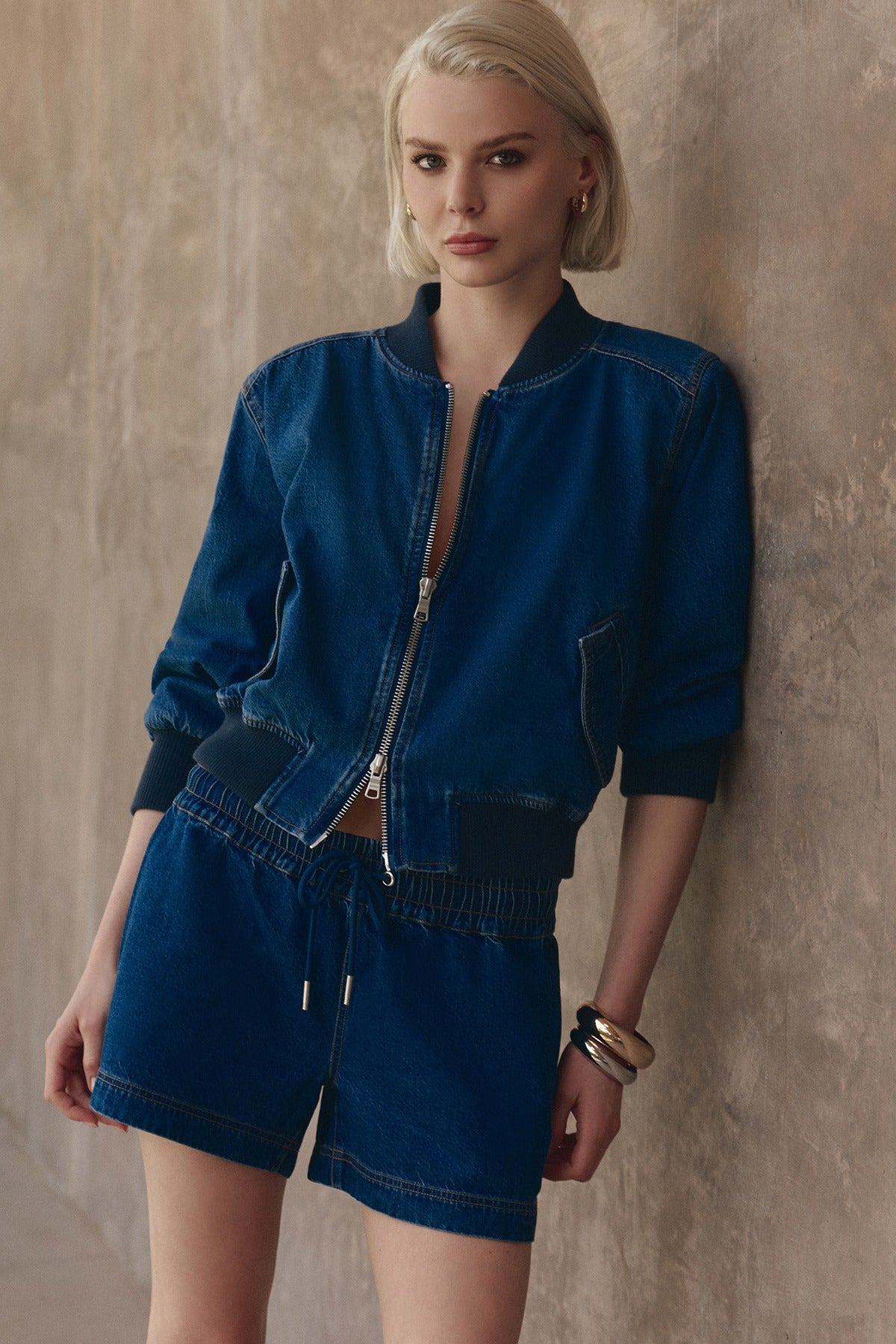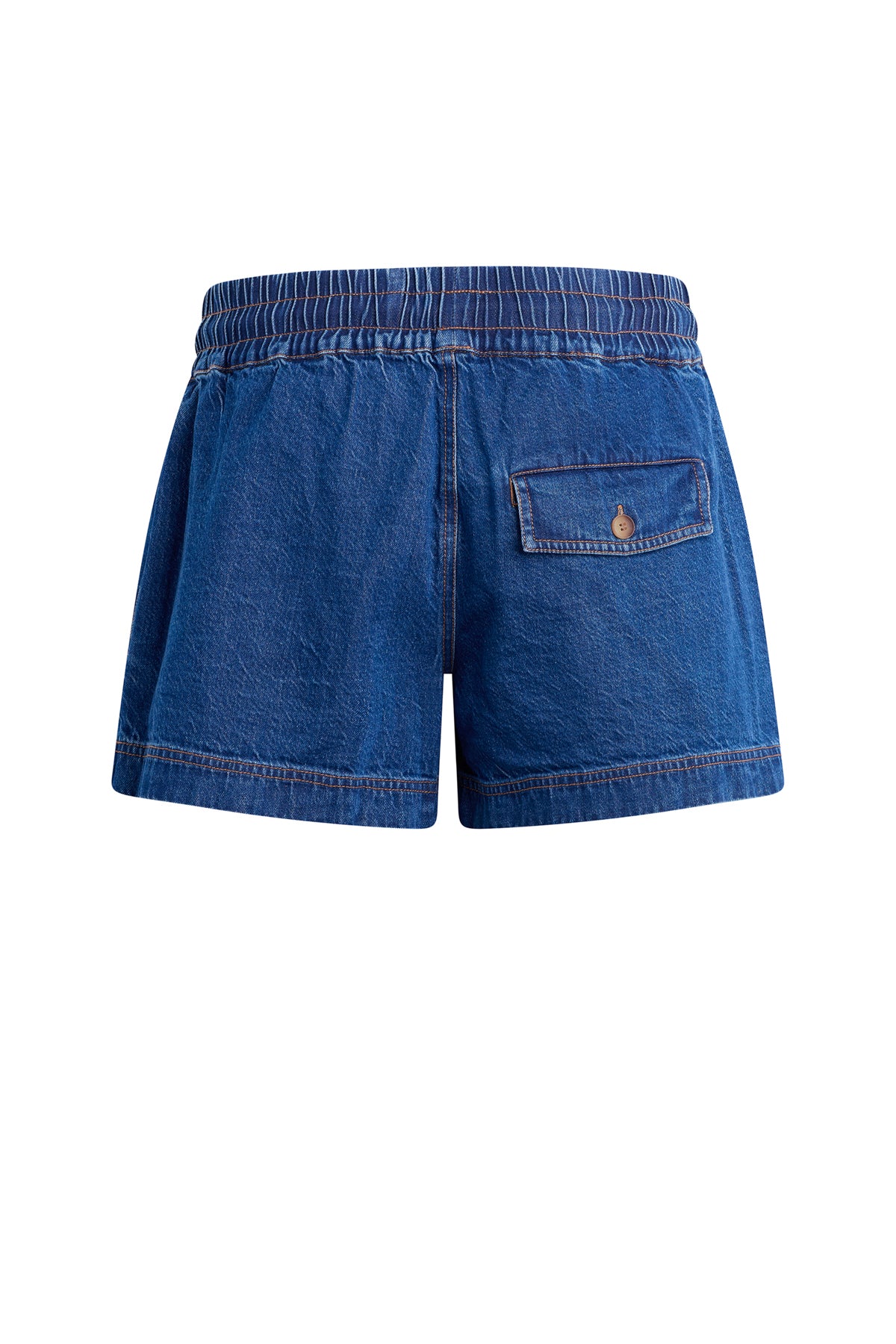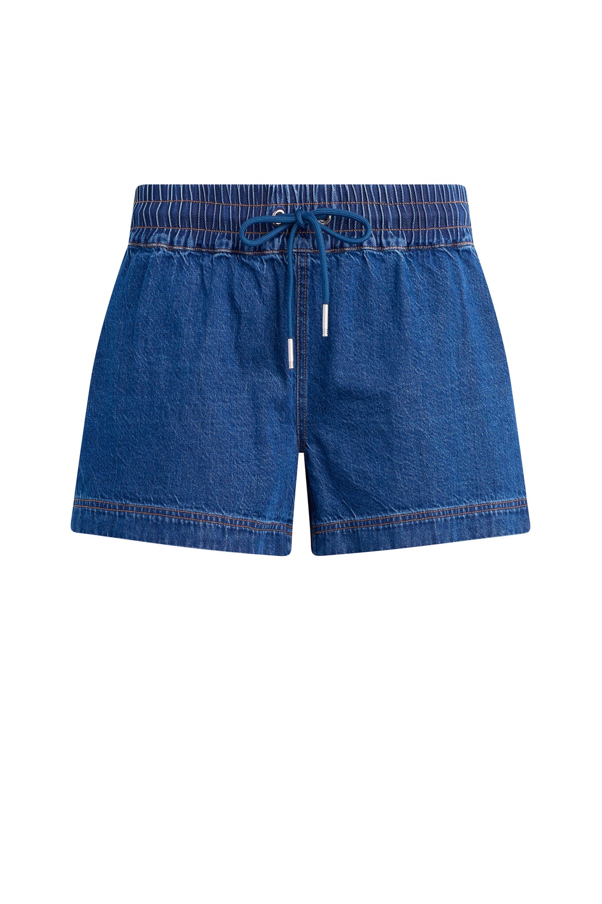 The Drawstring Short in Lottery is an easy denim short with a drawstring elastic waistband and clean-finished hem. This pair is made of lightweight, rigid denim in a medium-dark indigo wash. Pair it with our matching Denim Bomber Jacket for a complete look. -