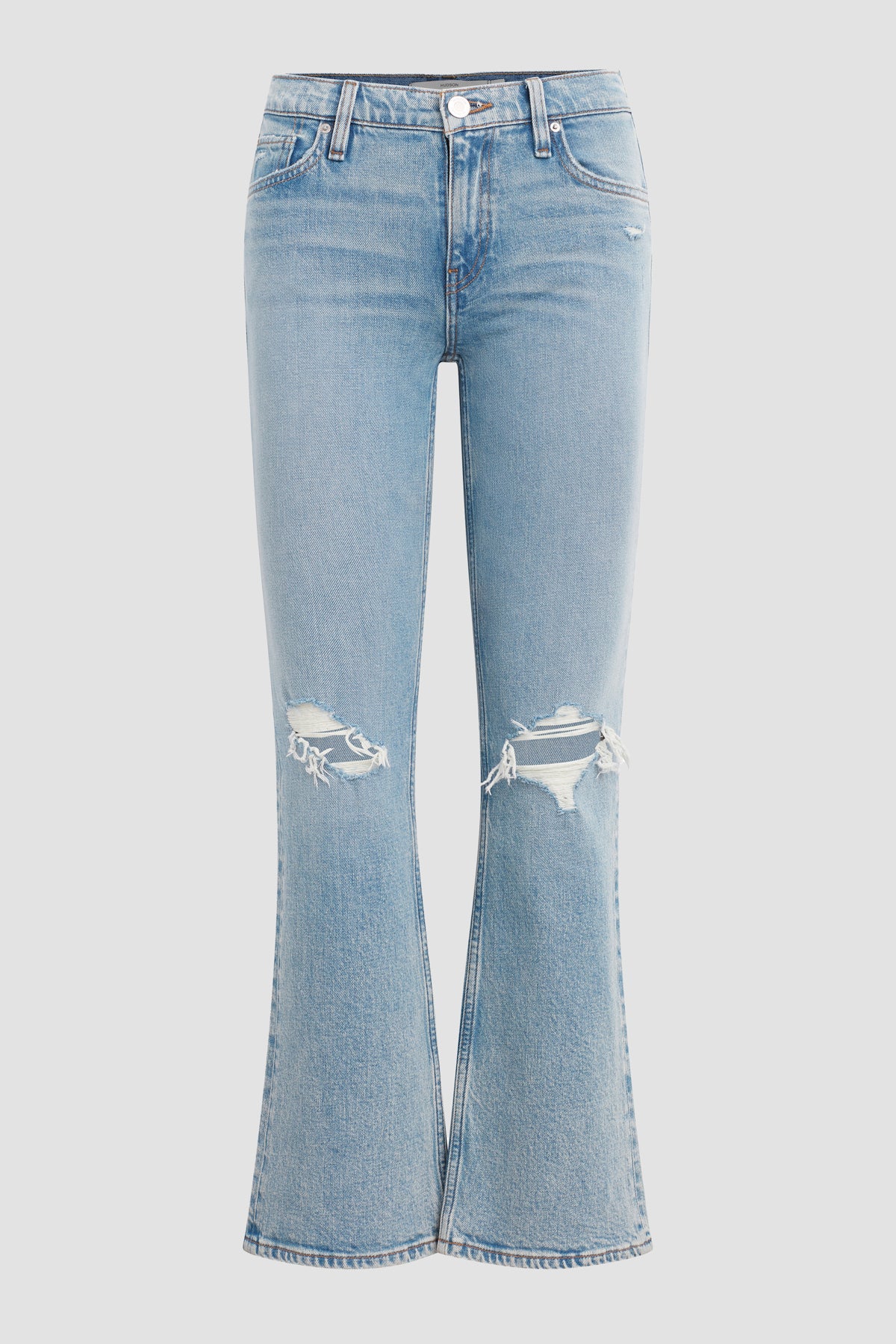 Our Farrah Mid-Rise Barefoot Bootcut Jean in Ice Blue Destructed is styled with a slightly shorter length from our Legacy, comfort stretch Italian premium denim. The medium-light indigo wash is expertly destructed and finished with clean hems. -