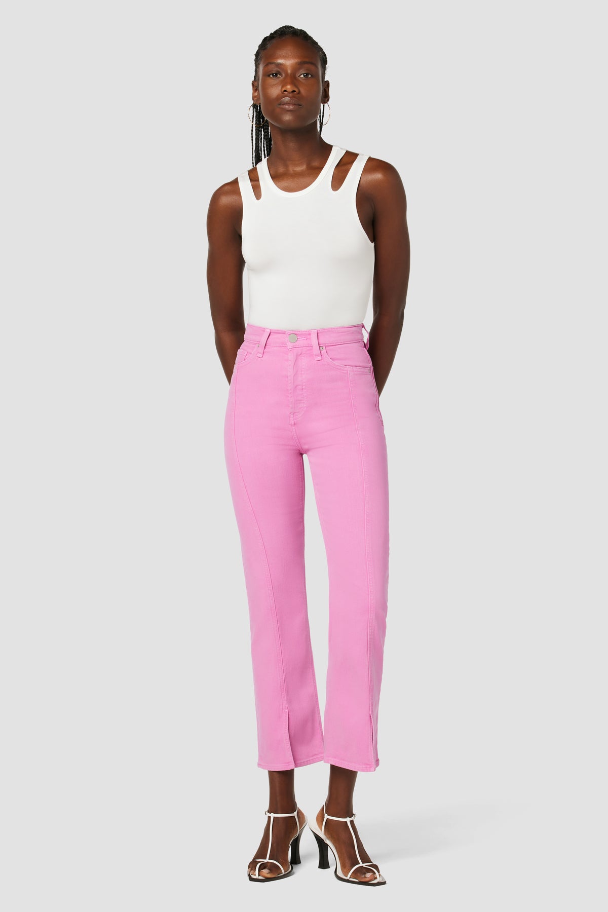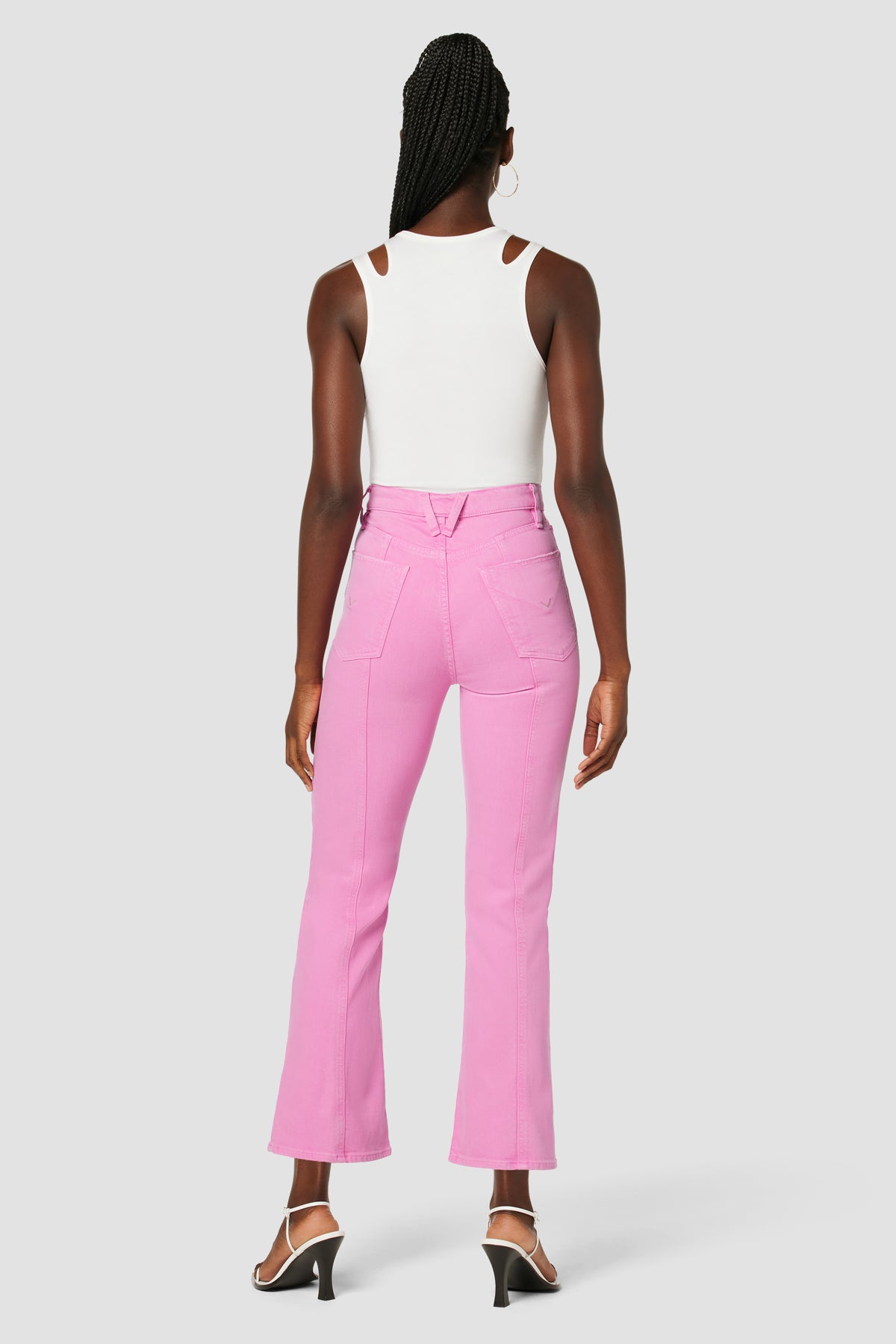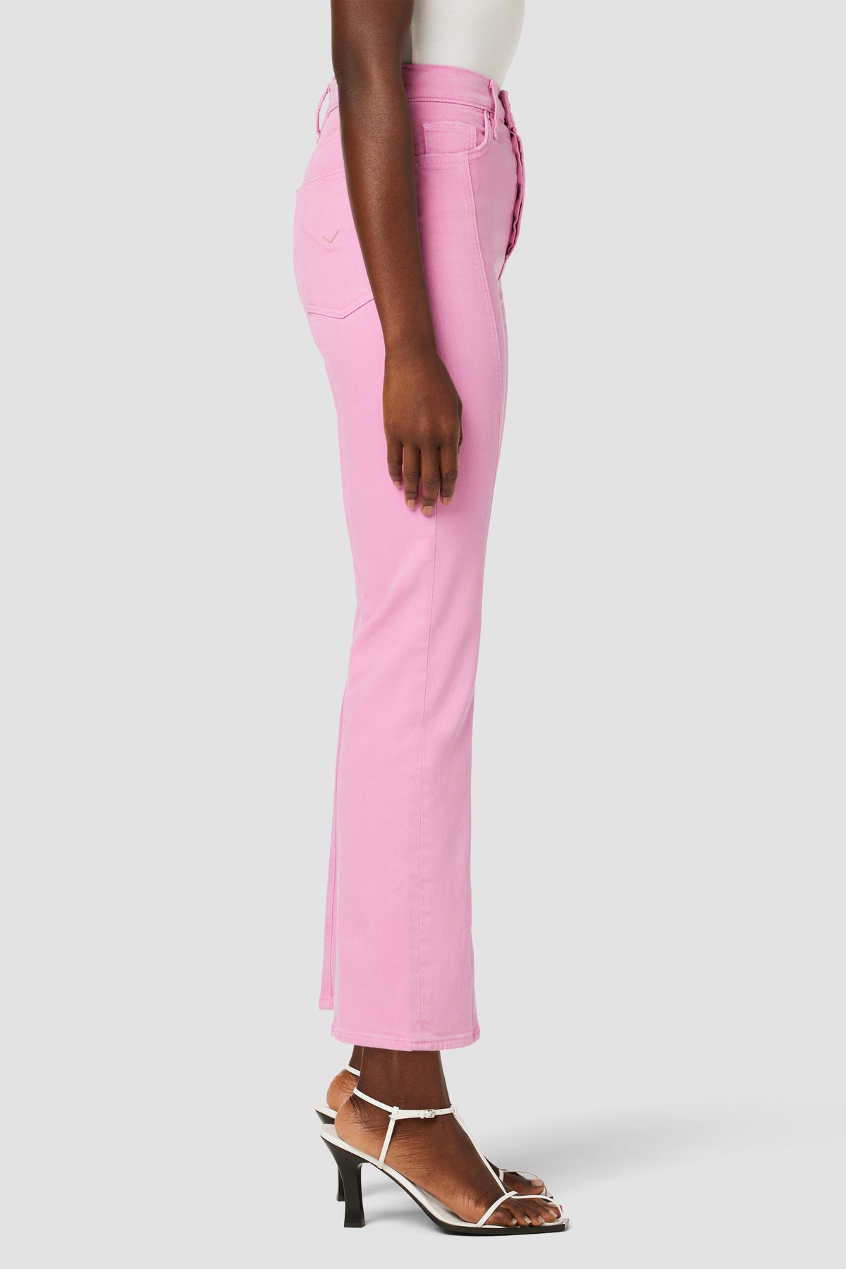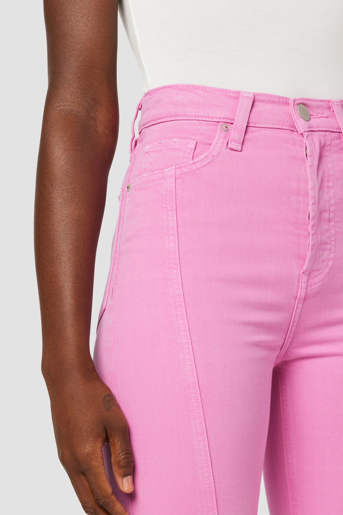 Our Faye Ultra High-Rise Bootcut Crop Jean in Fuchsia Pink is cut from premium comfort stretch denim with a holds-you-in waistline and fitted leg that breaks at the knee. -