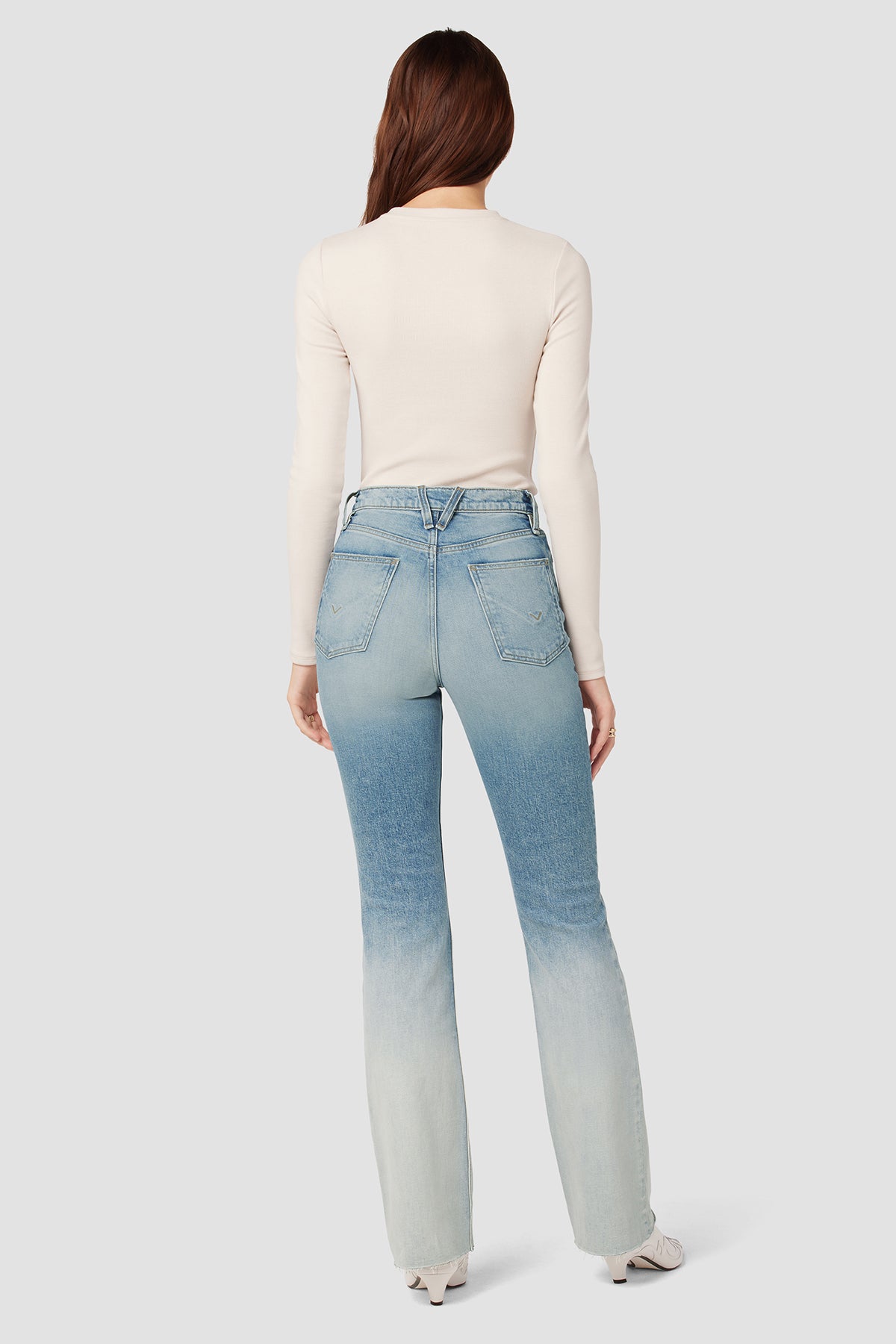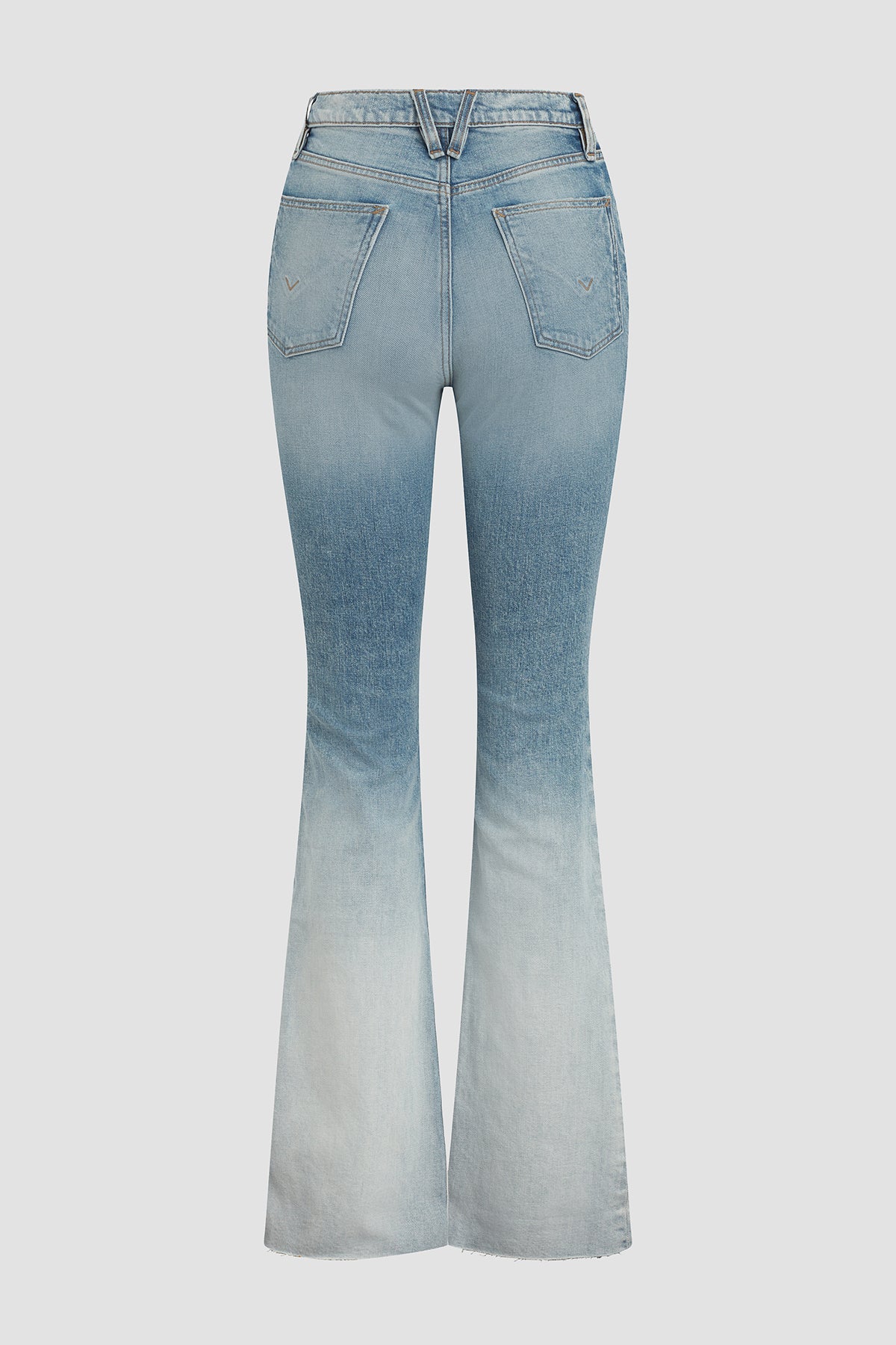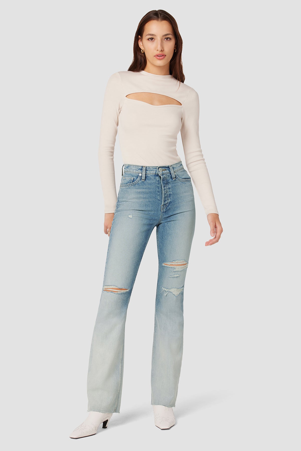 Our Faye Ultra High-Rise Bootcut Jean in light indigo Bleach Dip is cut from premium comfort stretch denim with a holds-you-in waistline and fitted leg that breaks at the knee. -