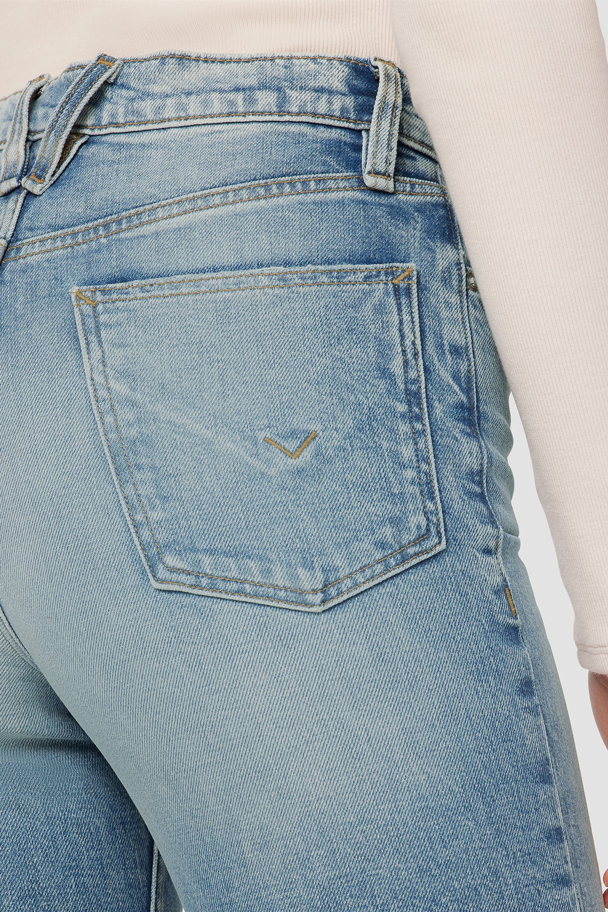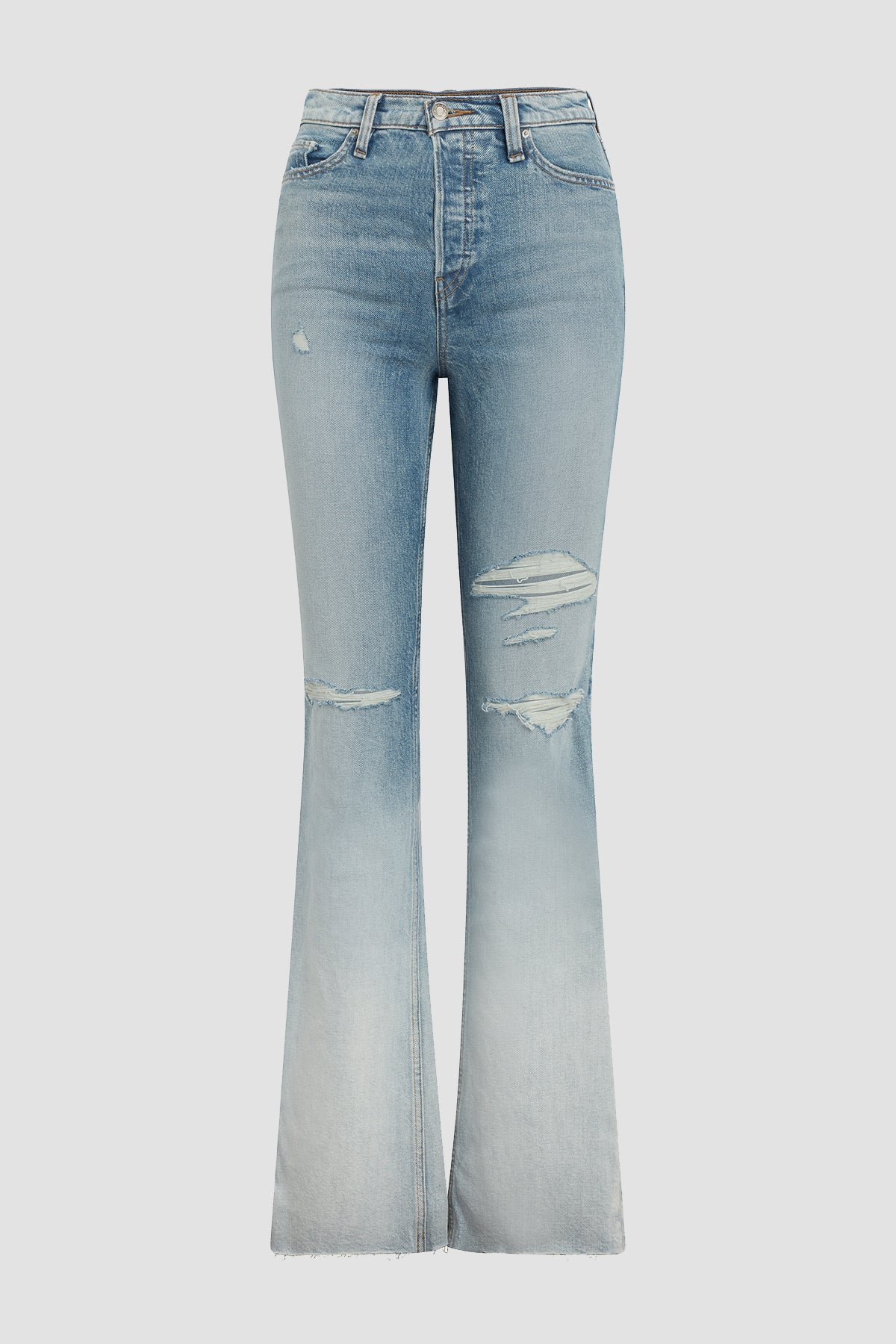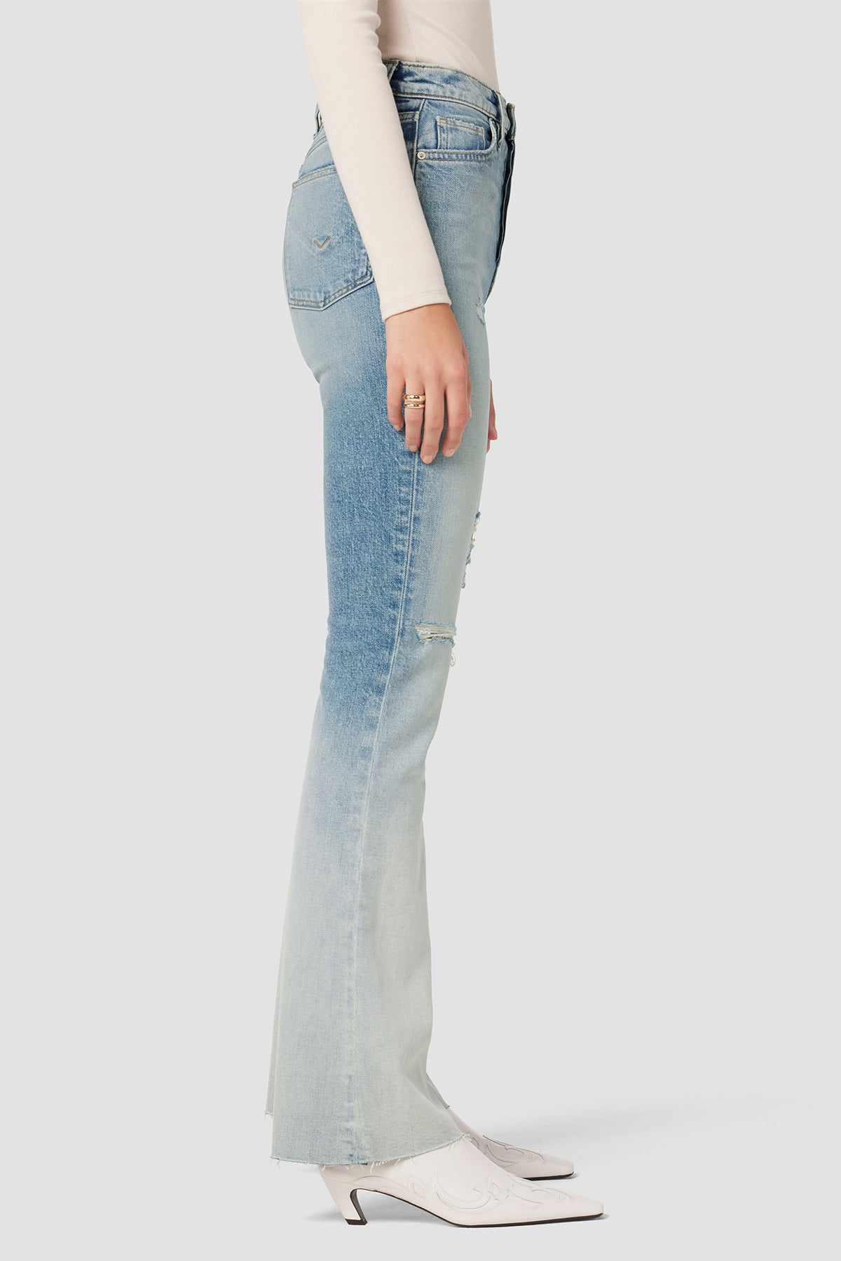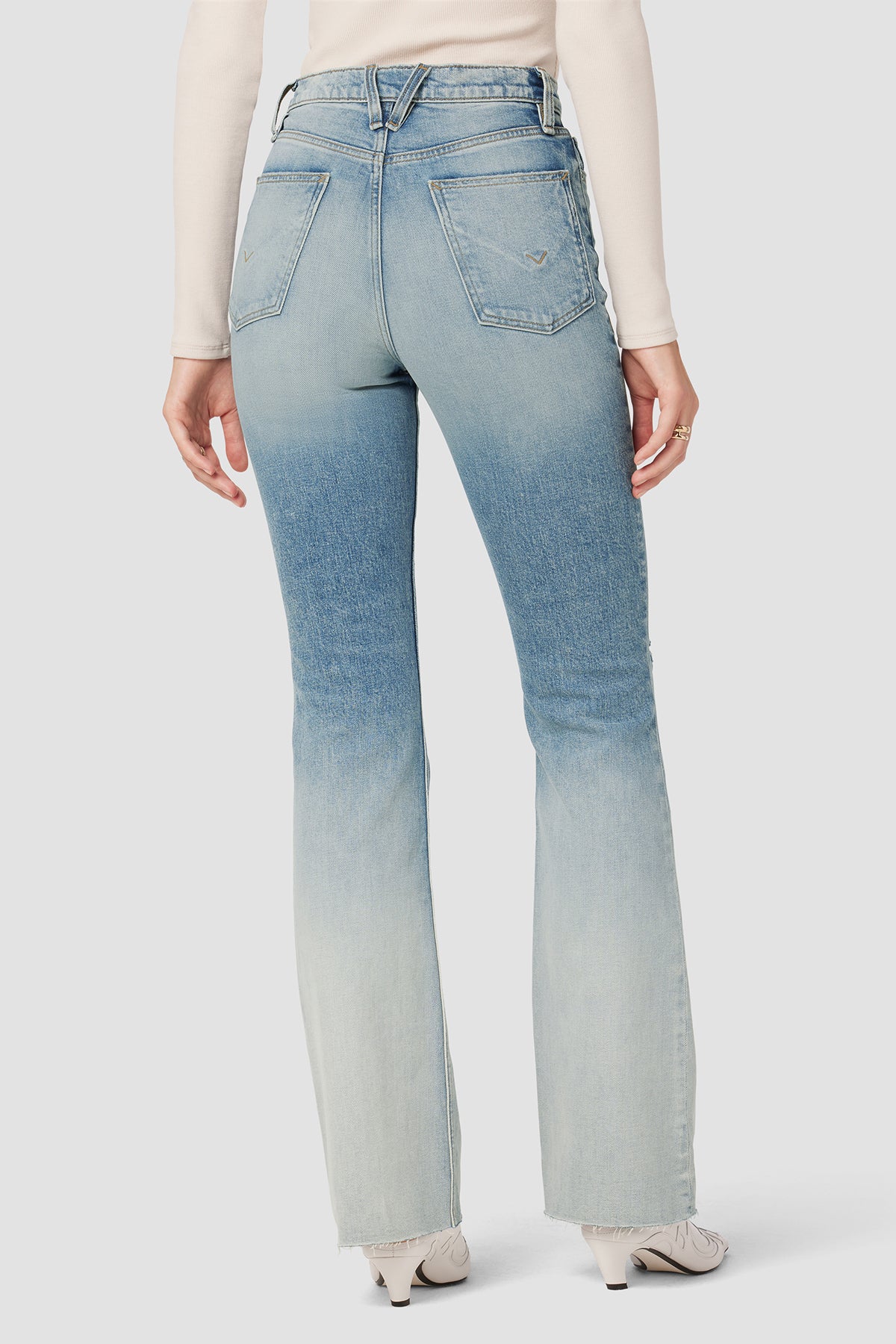 Our Faye Ultra High-Rise Bootcut Jean in light indigo Bleach Dip is cut from premium comfort stretch denim with a holds-you-in waistline and fitted leg that breaks at the knee. -