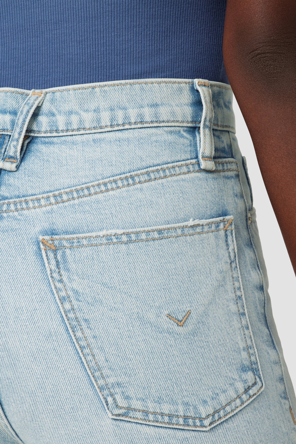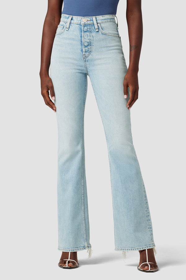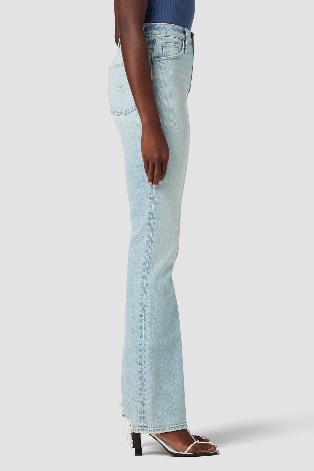 Our Faye Ultra High-Rise Bootcut Jean in light indigo Isla is cut from Italian premium comfort stretch denim with a holds-you-in waistline, a fitted leg that breaks at the knee and chewed back hem. -