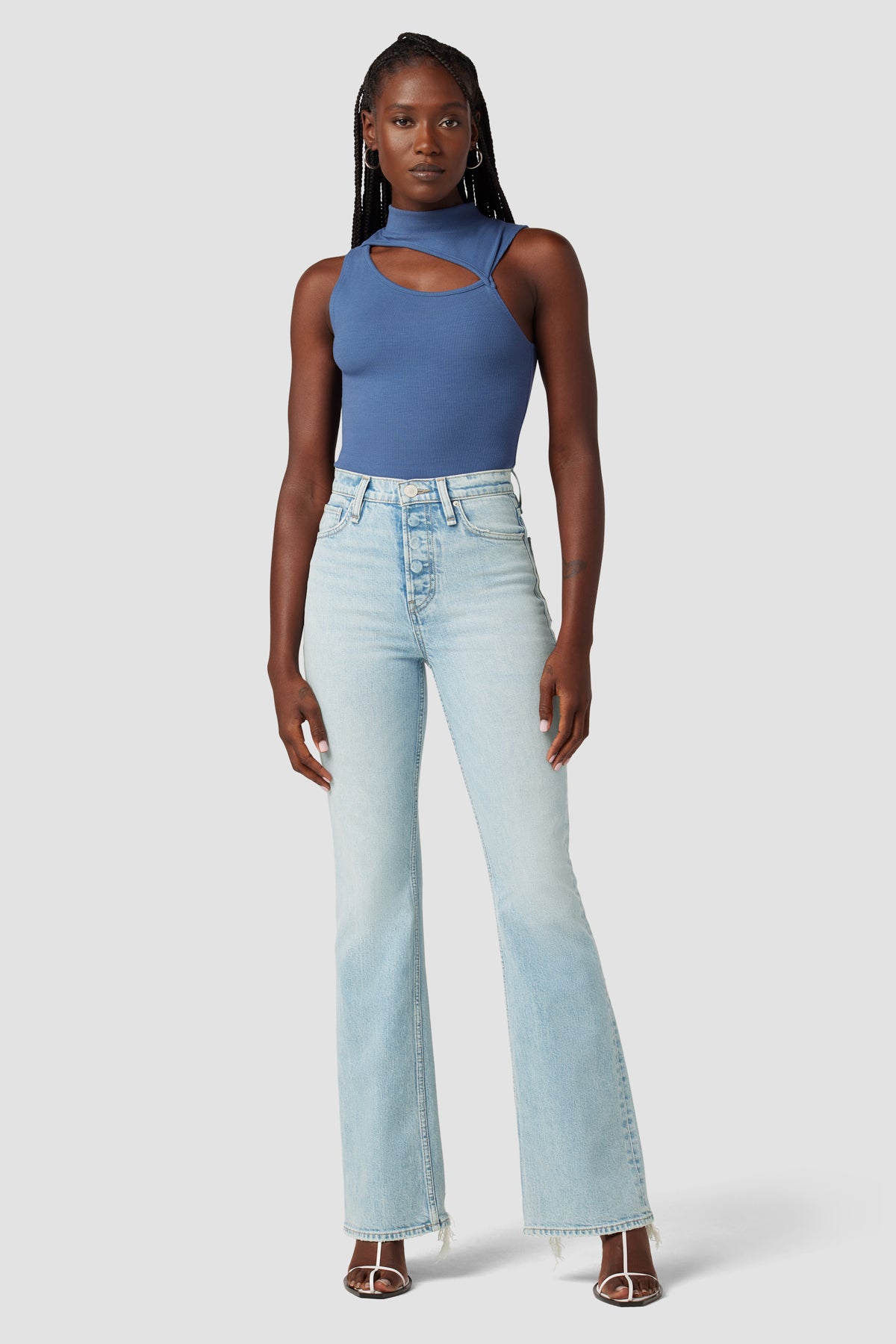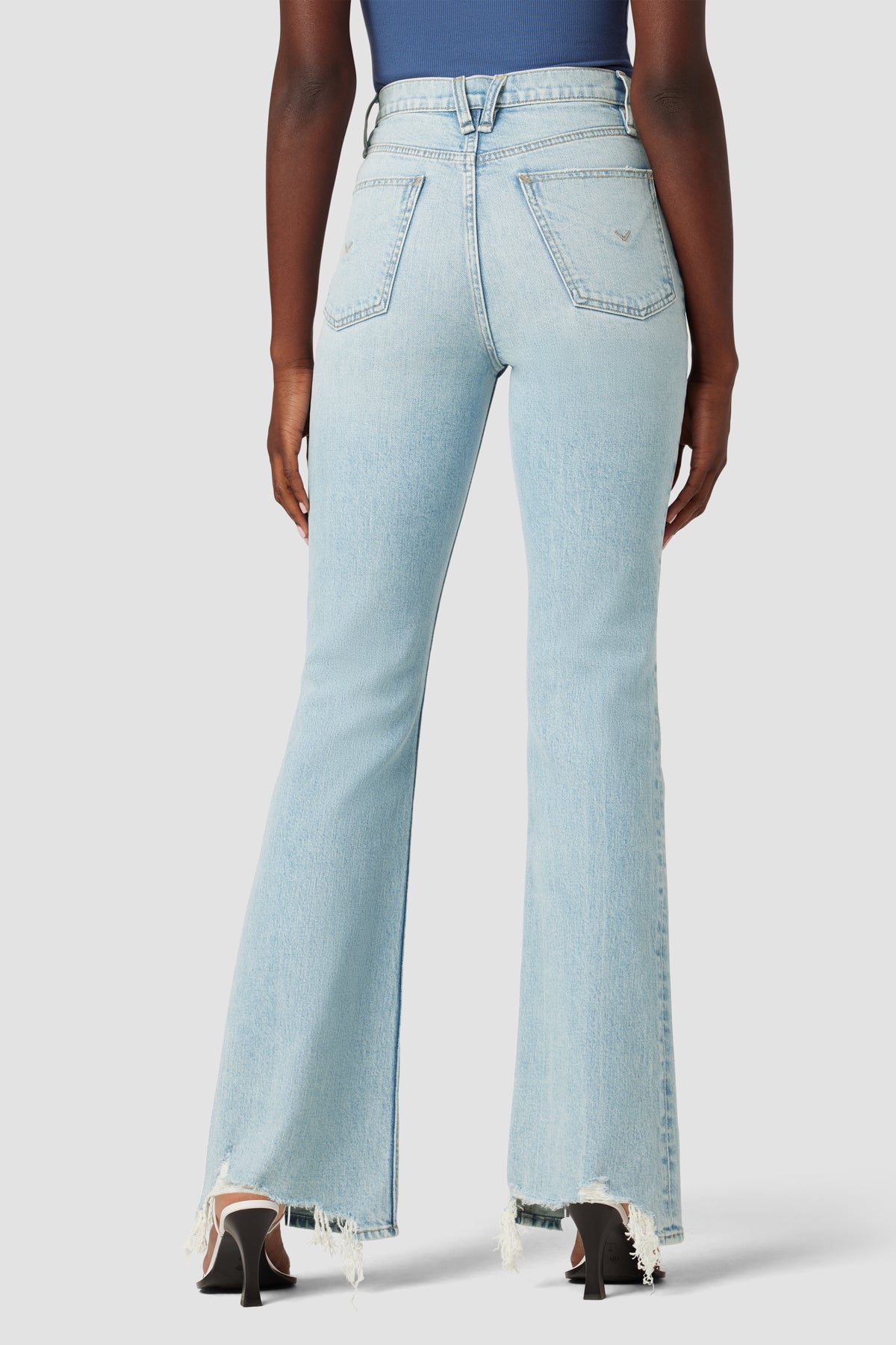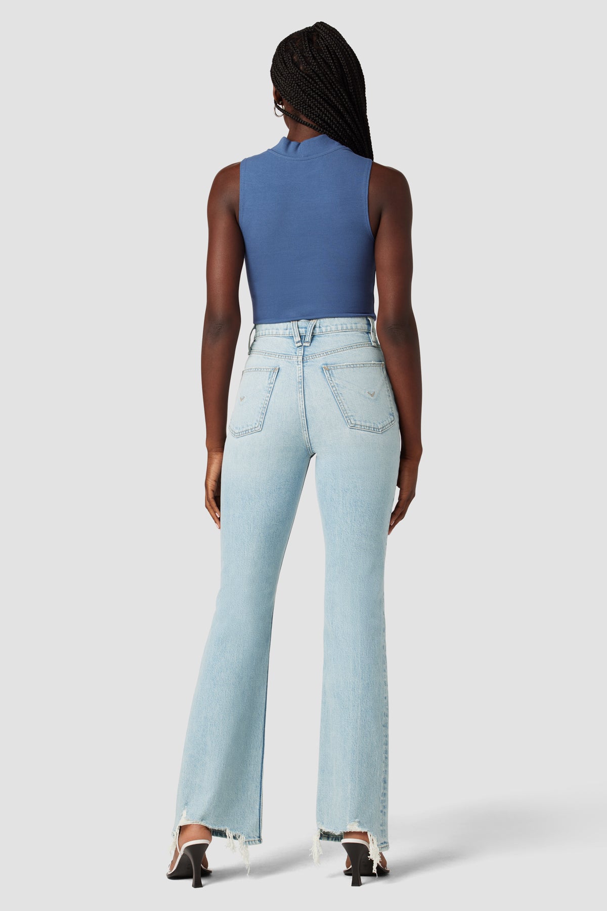 Our Faye Ultra High-Rise Bootcut Jean in light indigo Isla is cut from Italian premium comfort stretch denim with a holds-you-in waistline, a fitted leg that breaks at the knee and chewed back hem. -