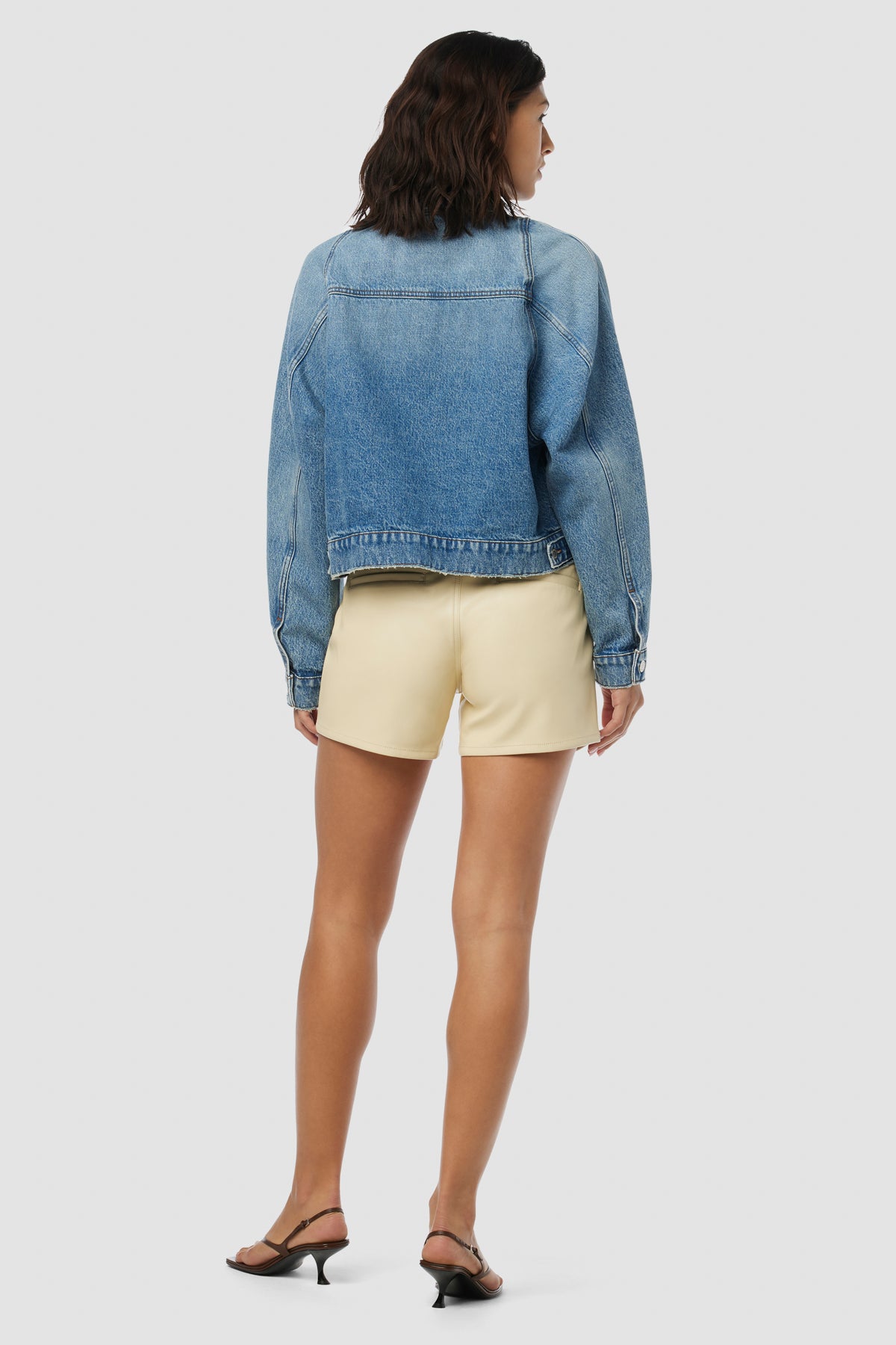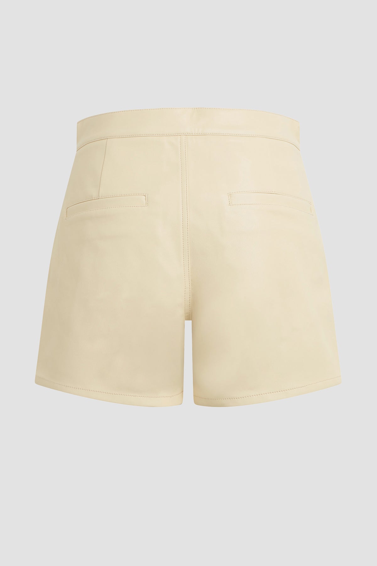 The Front Yoke Pleated Short in beige Cameo Moth is cut from luxe Illusion vegan leather. Features front pleats and trouser pockets for an elevated look. Makes a matching set paired with Oversized Crop Button Down. -