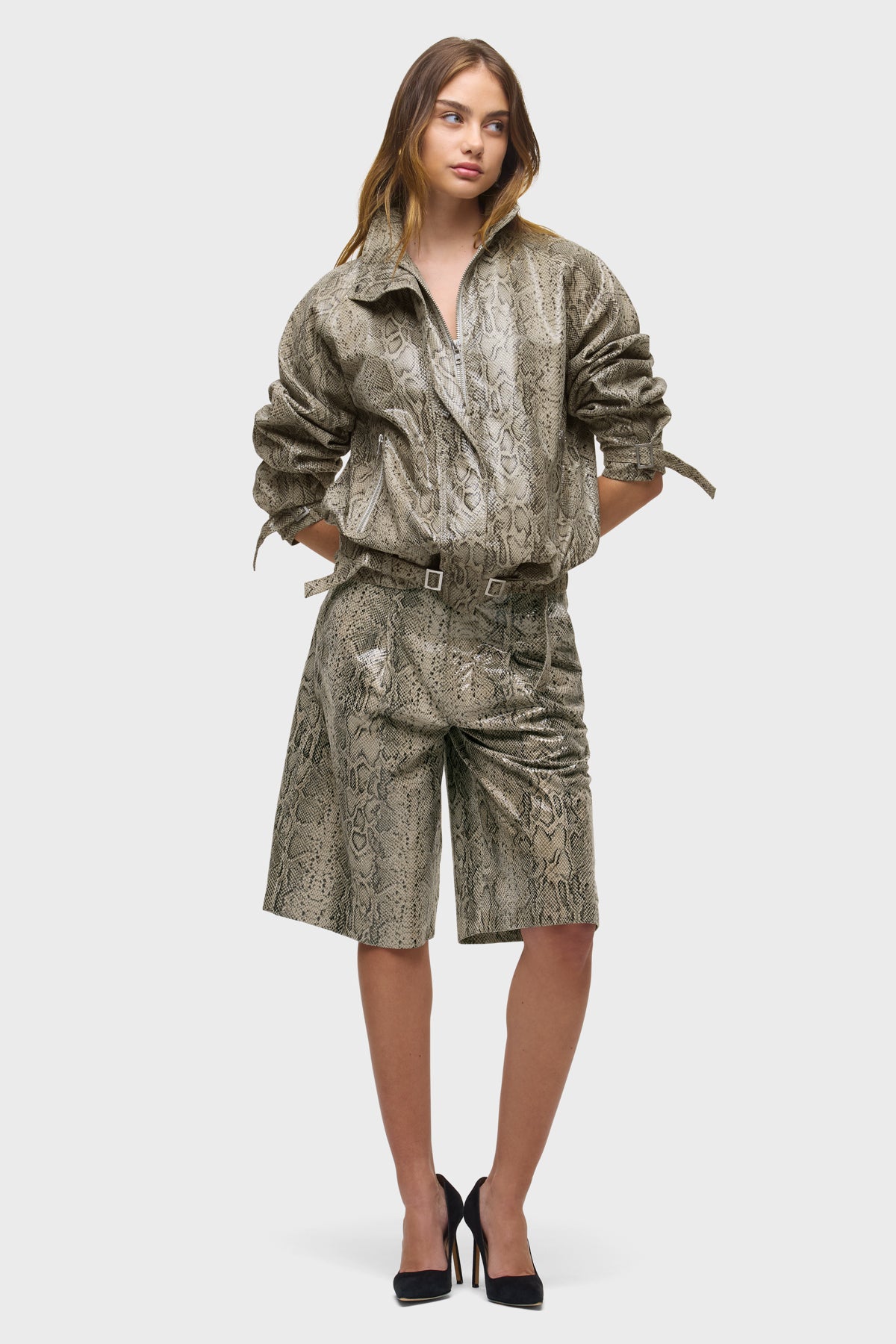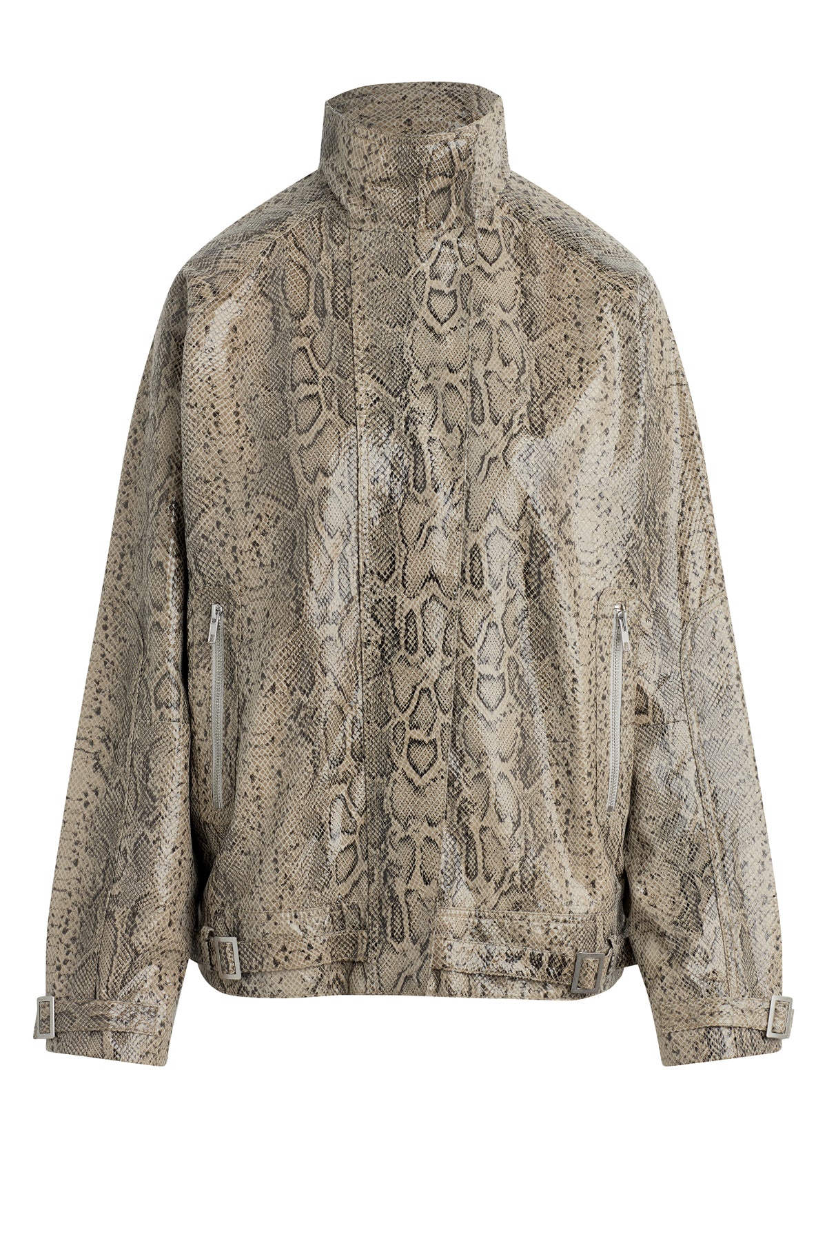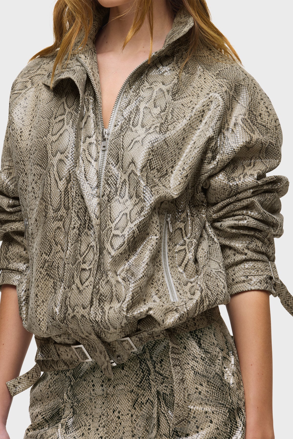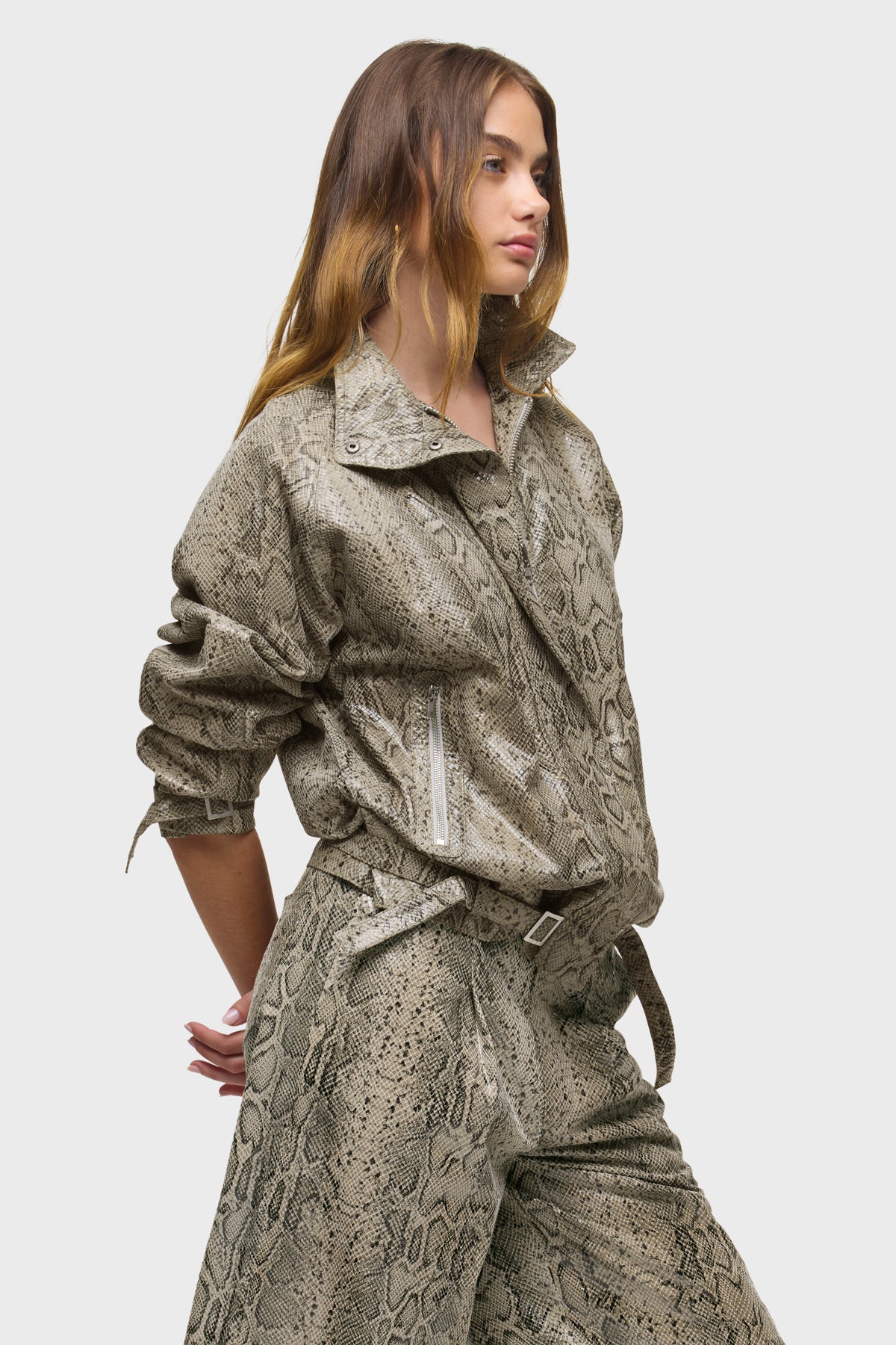 The Funnel Collar Jacket in Taupe Snake has a relaxed fit and is made of snake-printed foil on genuine leather. It is finished with side zip pockets and adjustable sliders at the sleeve opening and front waistband. -