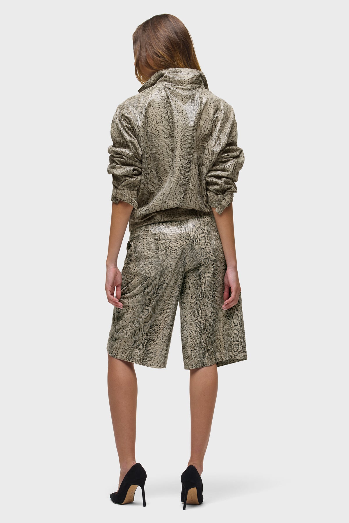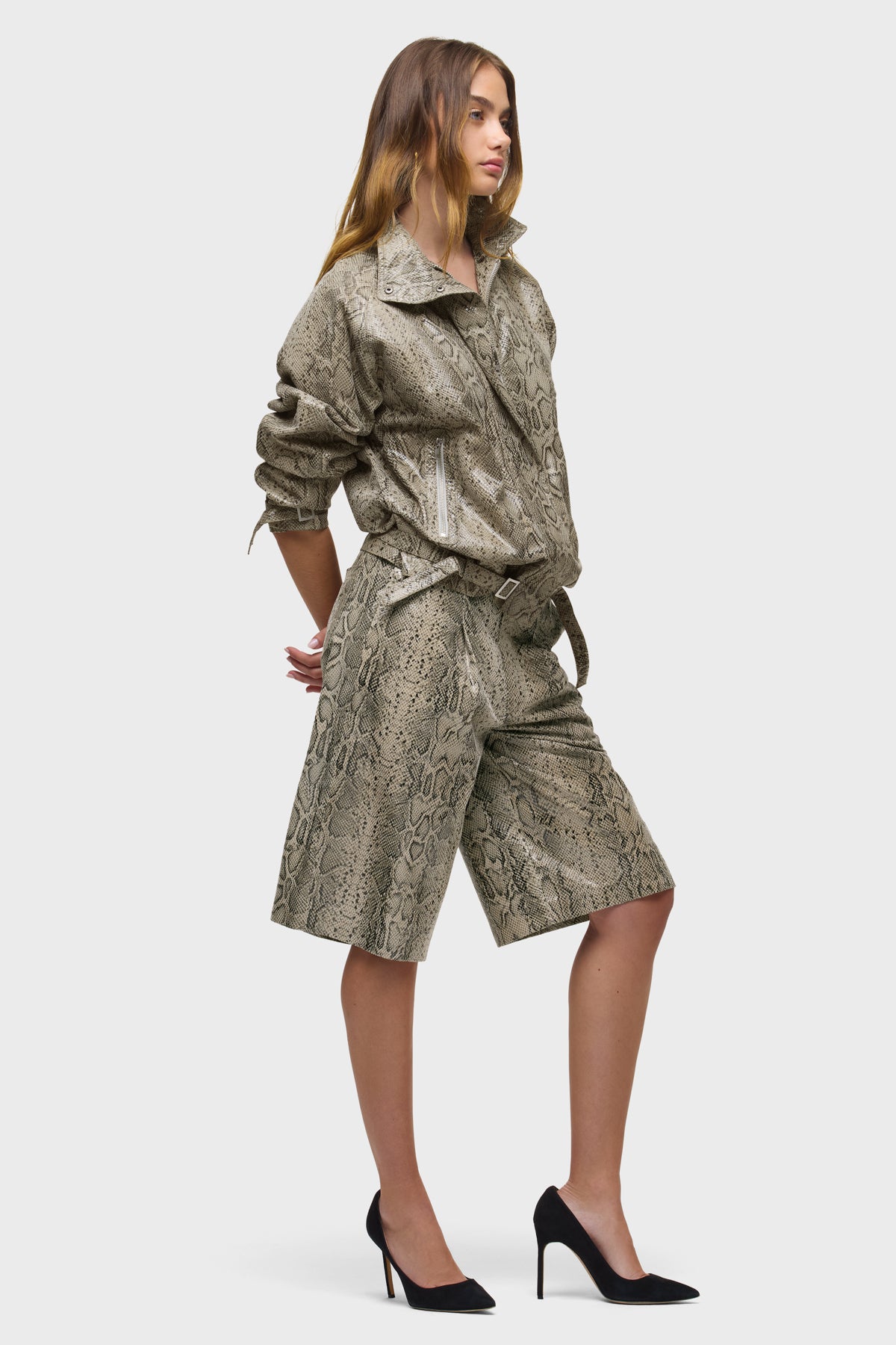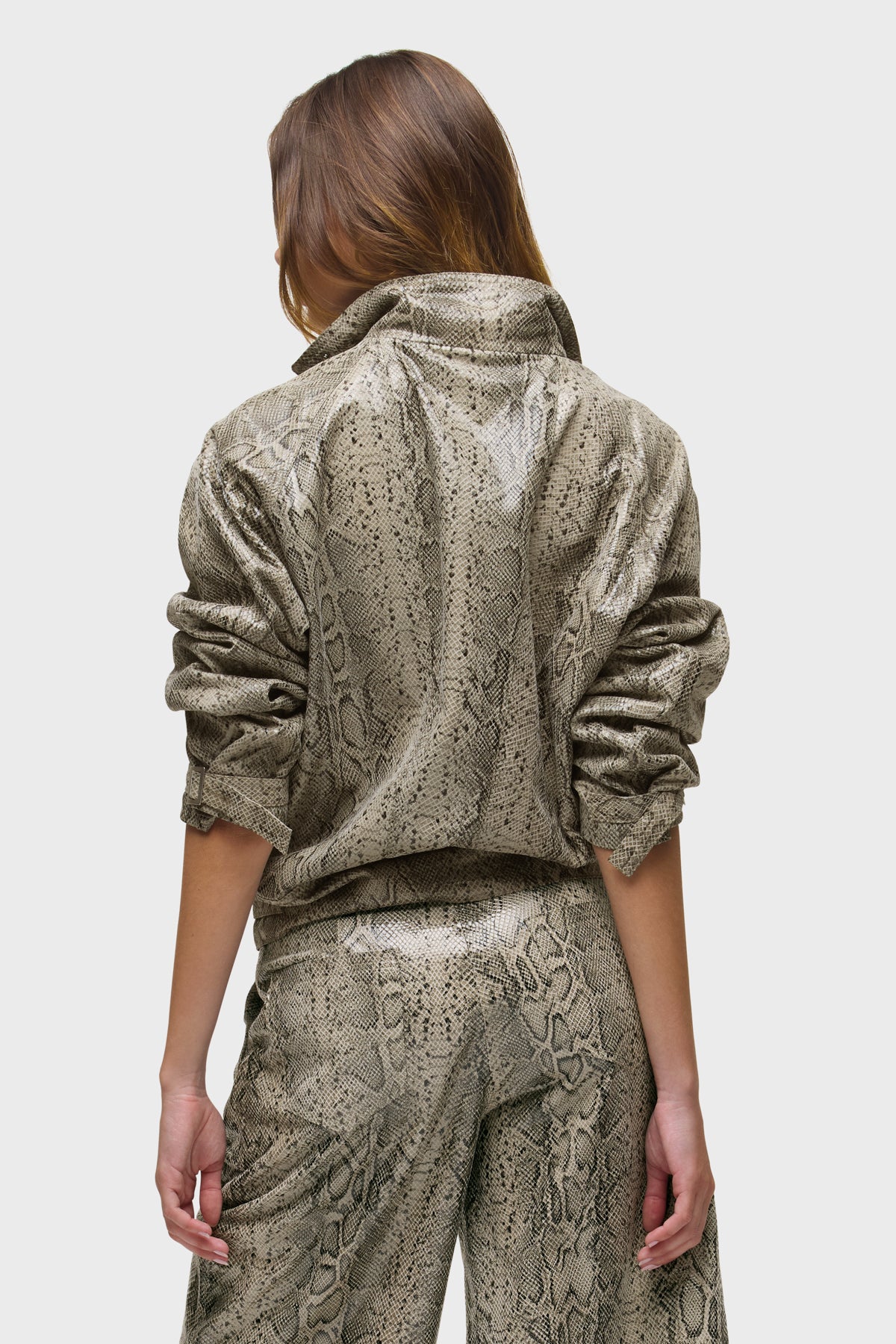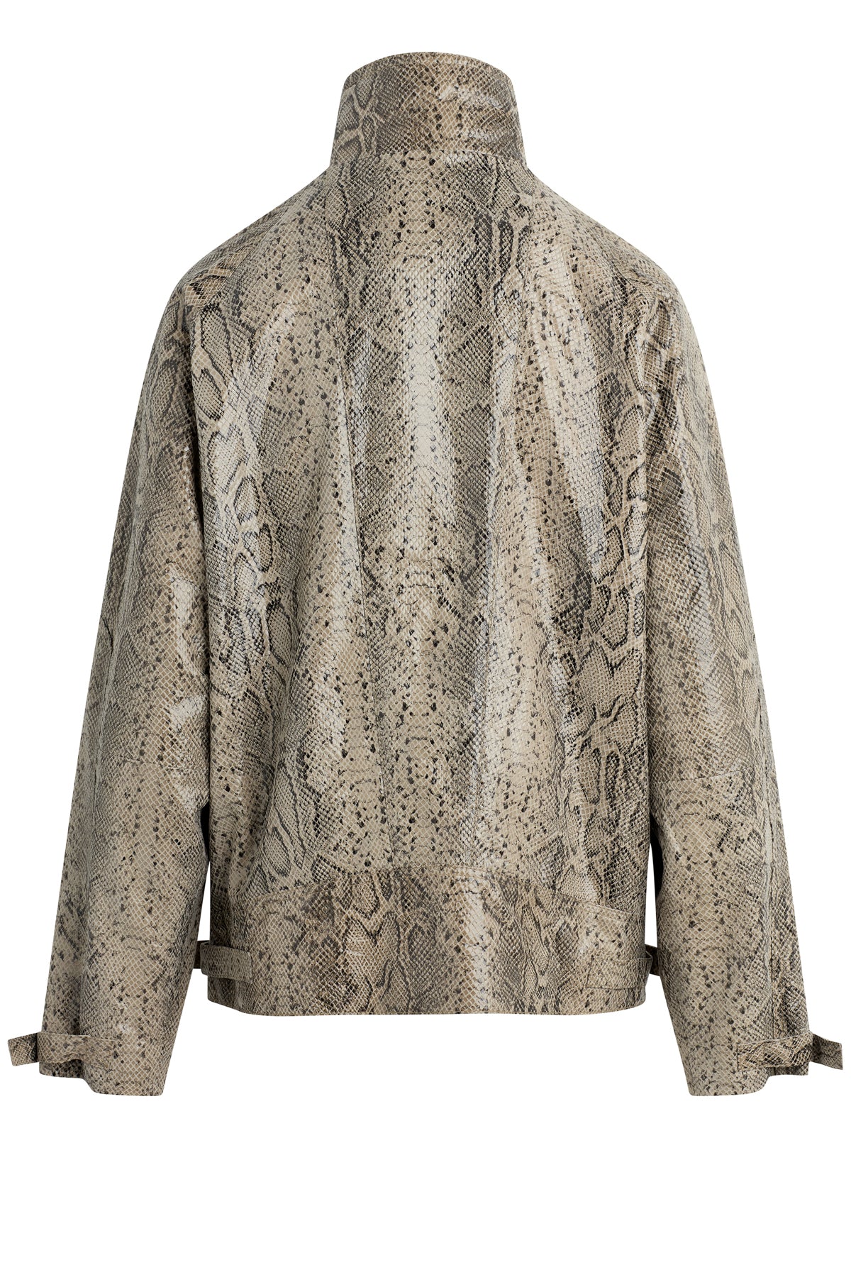 The Funnel Collar Jacket in Taupe Snake has a relaxed fit and is made of snake-printed foil on genuine leather. It is finished with side zip pockets and adjustable sliders at the sleeve opening and front waistband. -