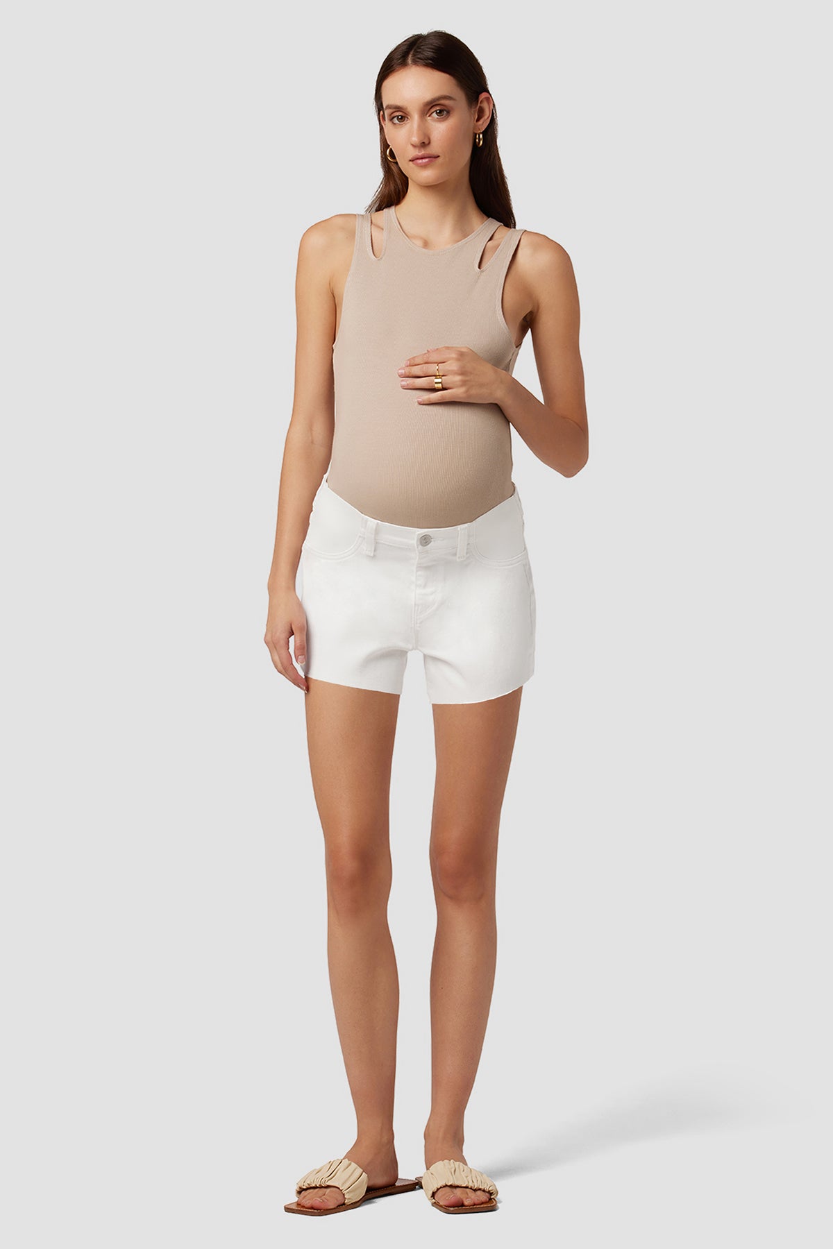 Designed with elastic panels for added comfort and support, our Gemma Maternity Short in White is a mid-rise, relaxed-fit pair crafted from premium comfort stretch denim with classic five-pocket details.