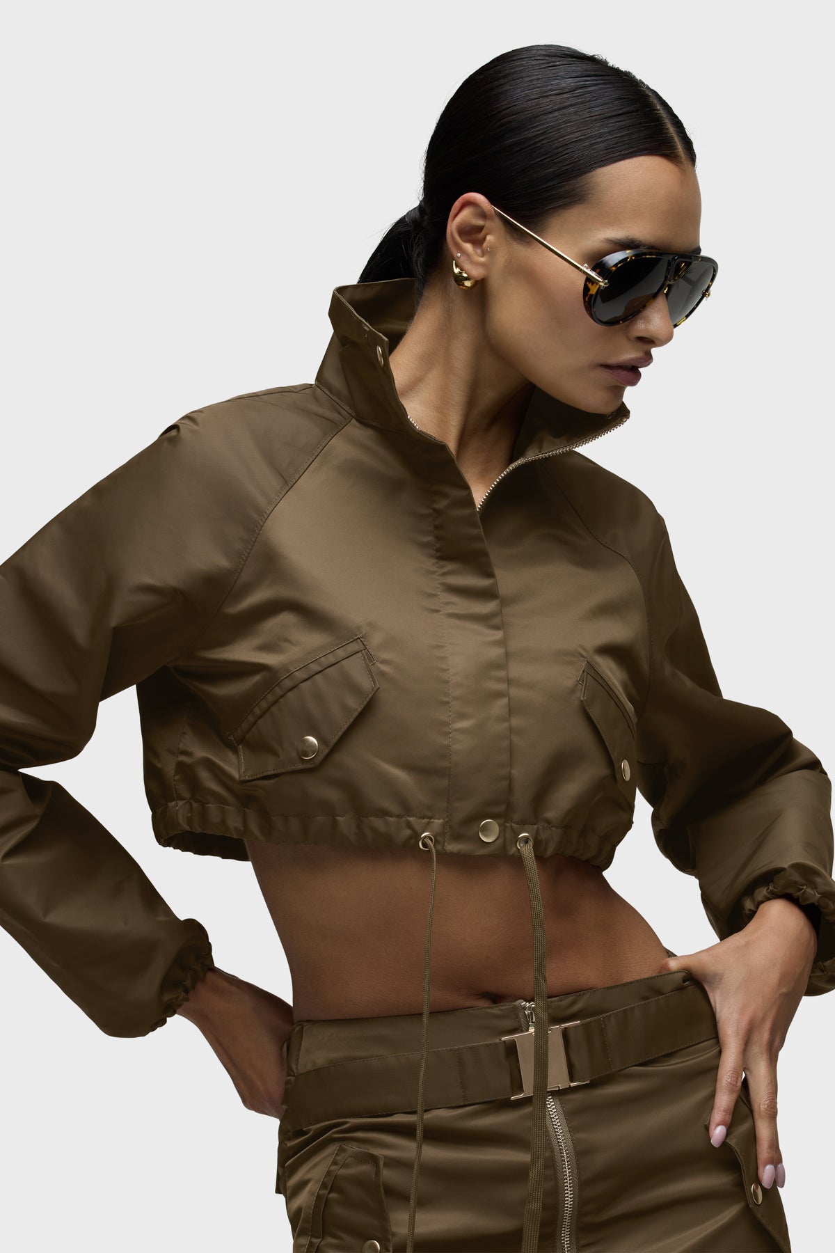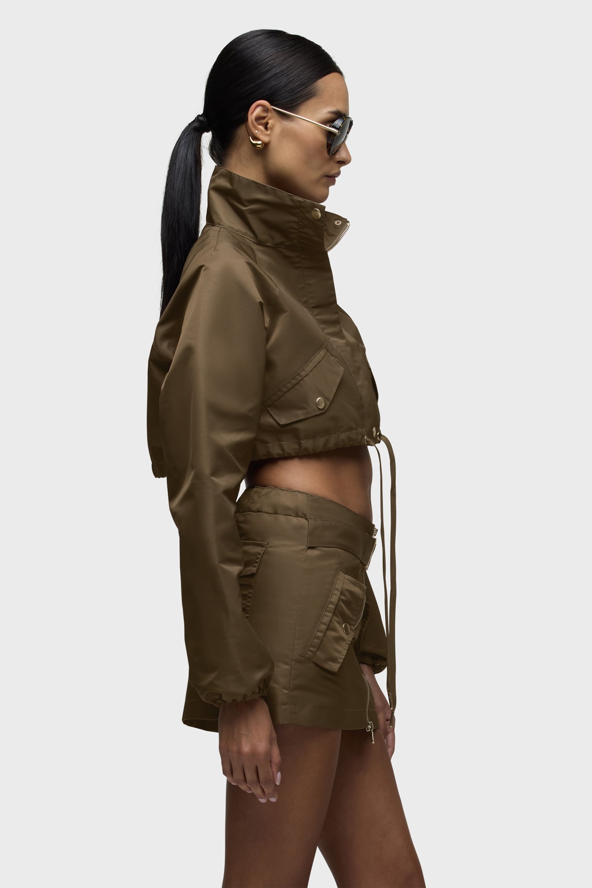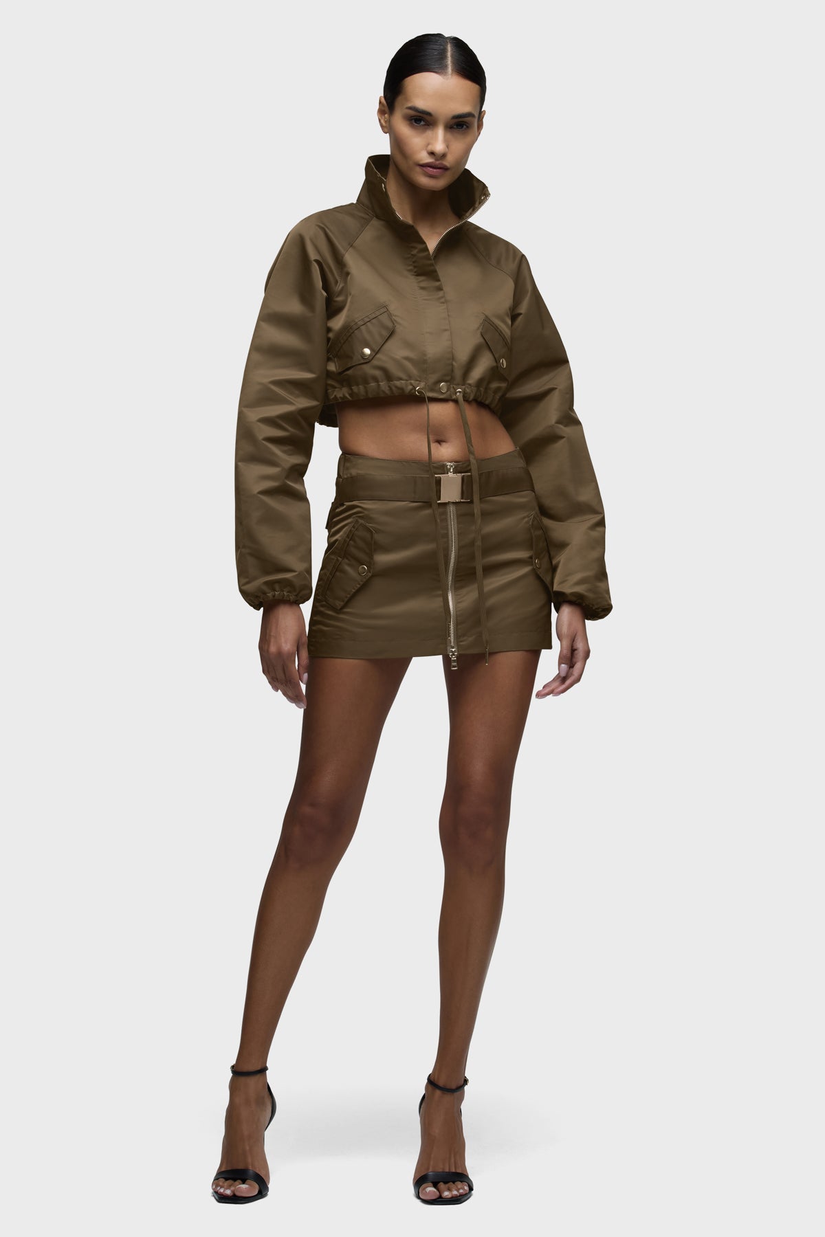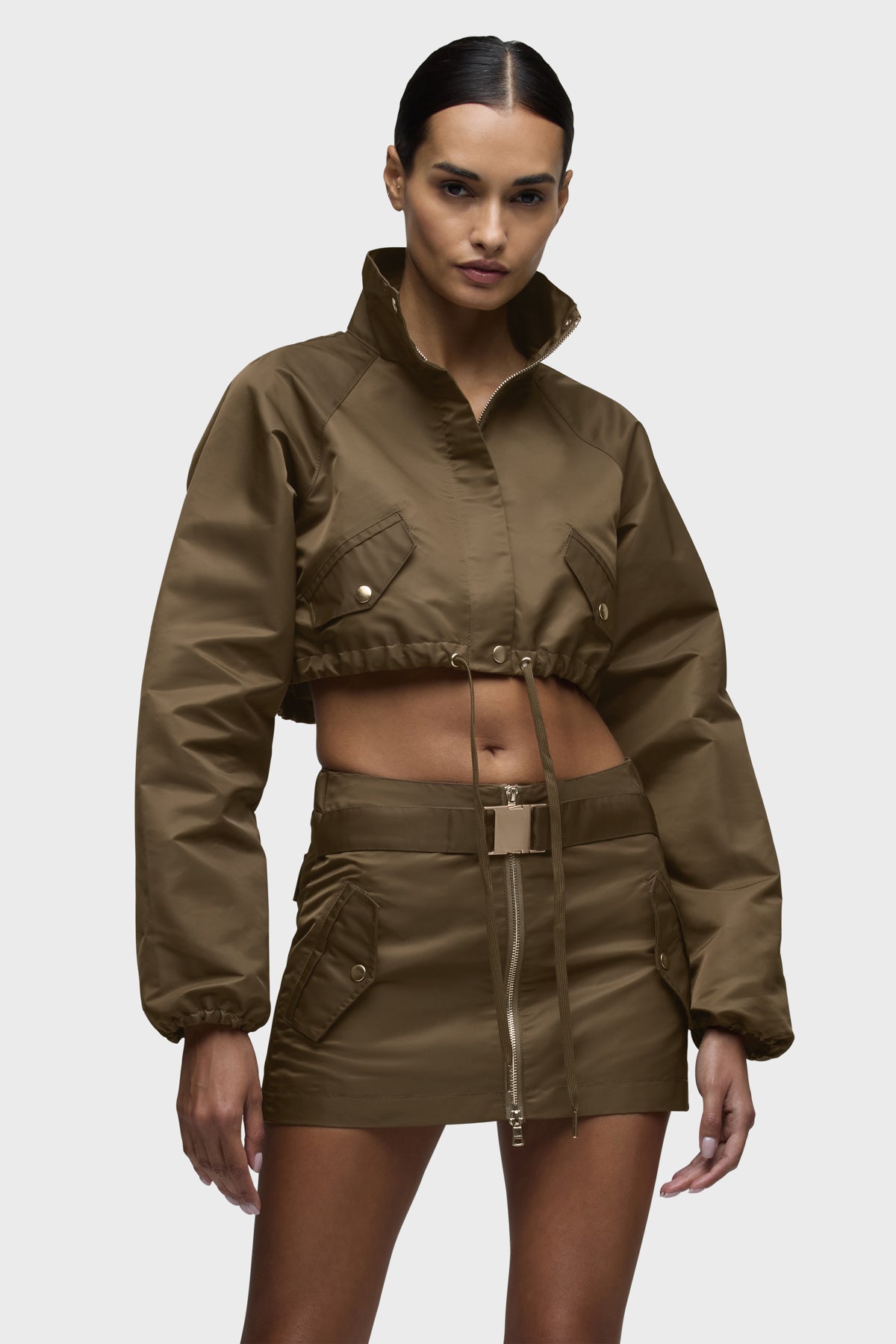 Part of our Brooks Nader collab capsule, the Grace Ann Cropped Jacket in Basin is a very cropped jacket with a funnel collar, long sleeves and center front zipper. This jacket is made from nylon fabric in an olive shade. It pairs great with the Grace Ann Micreaux Mini Skirt, or it can be worn by itself. This capsule was curated by model Brooks Nader and features her personal closet must-haves. -