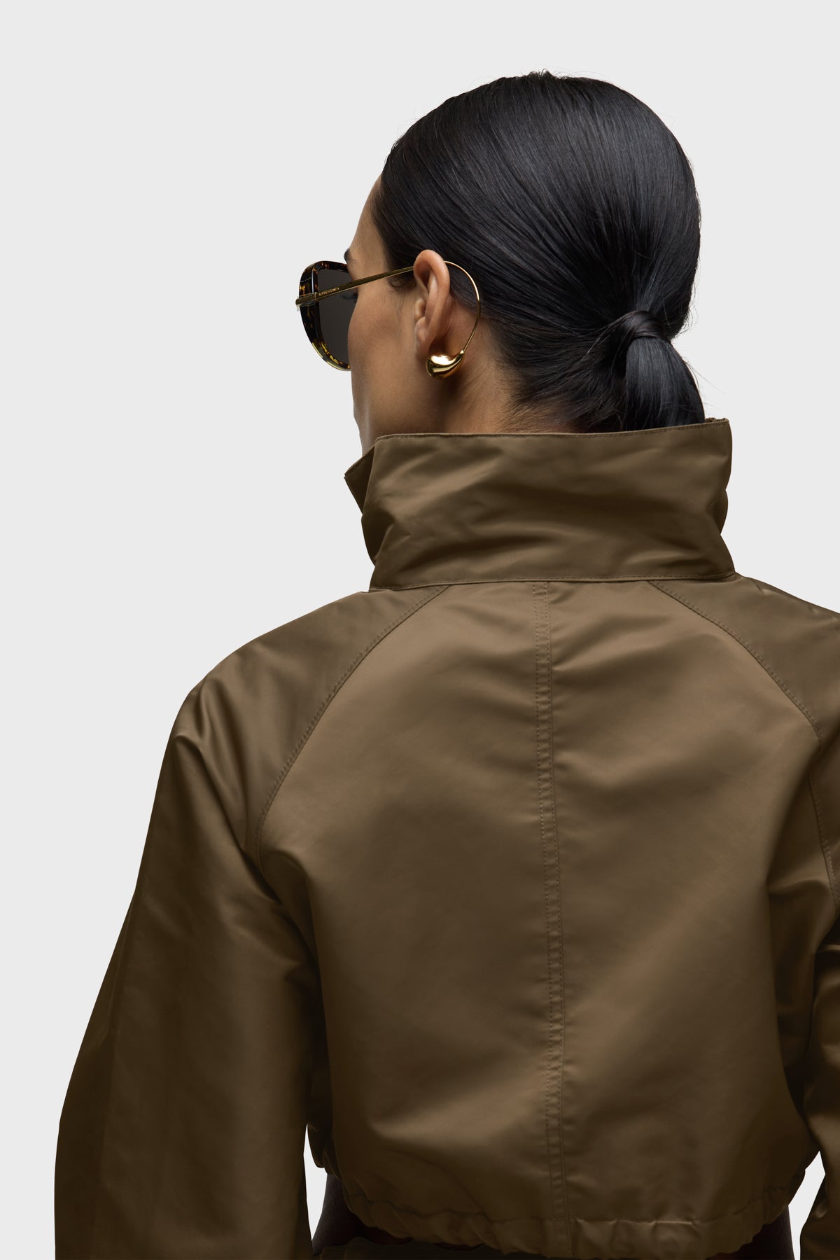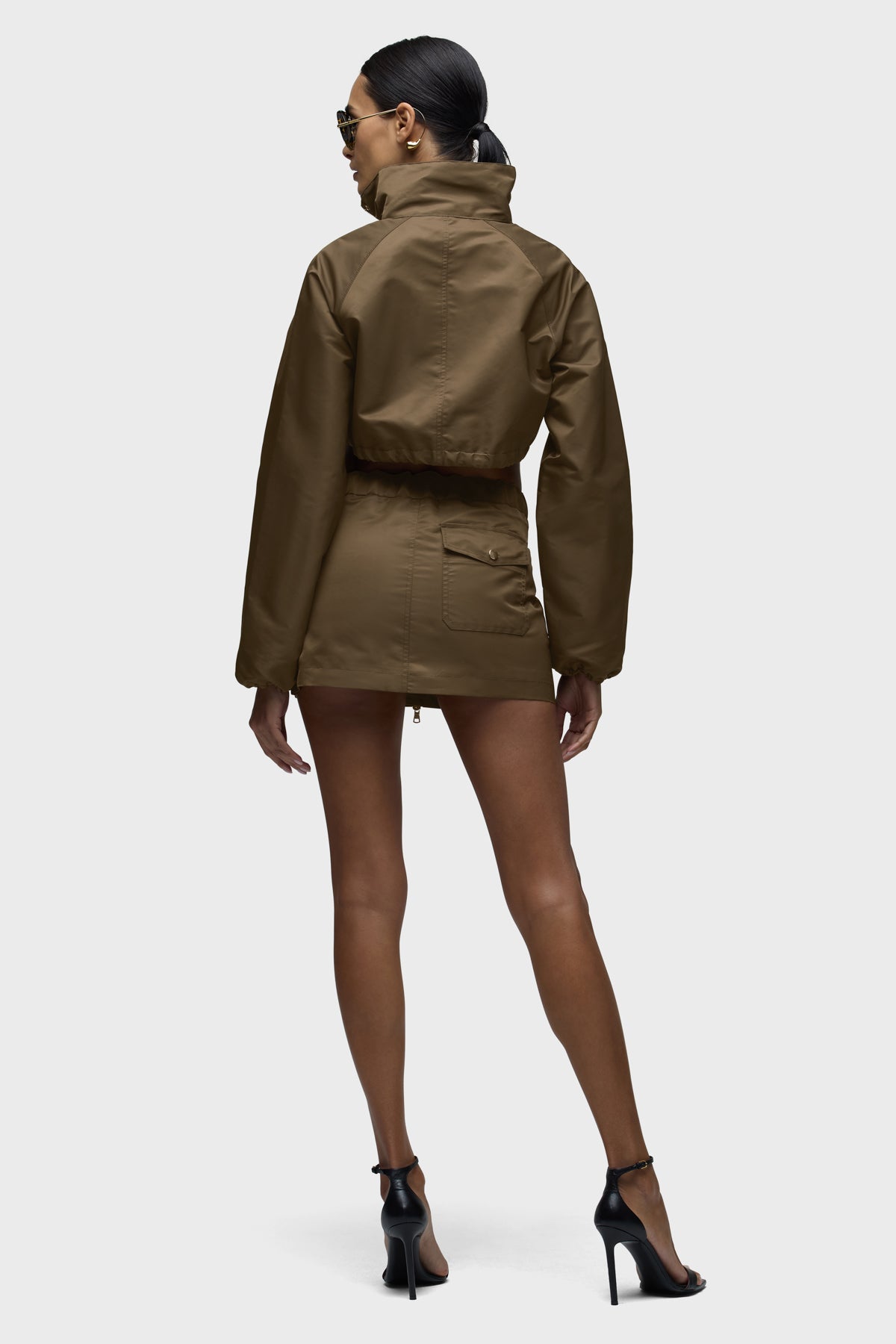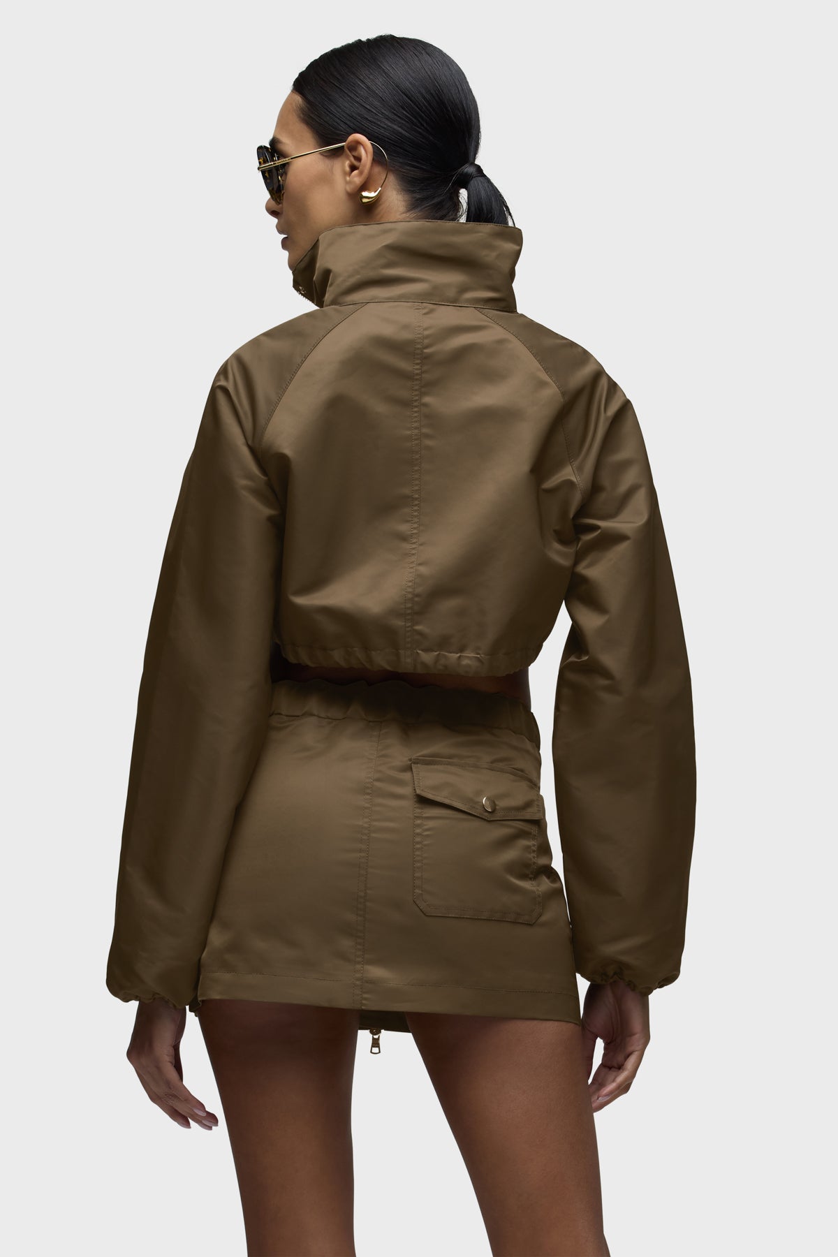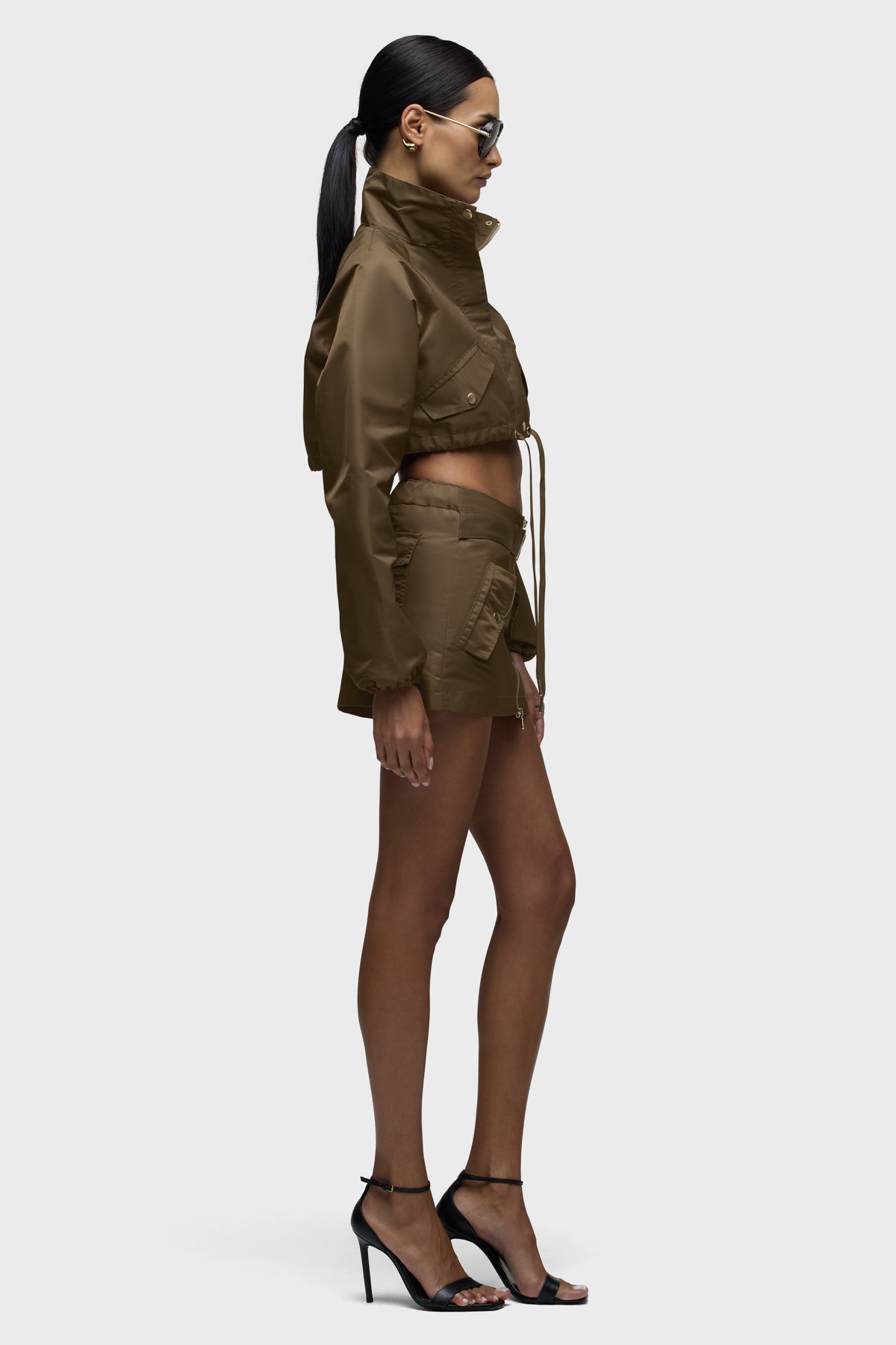 Part of our Brooks Nader collab capsule, the Grace Ann Cropped Jacket in Basin is a very cropped jacket with a funnel collar, long sleeves and center front zipper. This jacket is made from nylon fabric in an olive shade. It pairs great with the Grace Ann Micreaux Mini Skirt, or it can be worn by itself. This capsule was curated by model Brooks Nader and features her personal closet must-haves. -