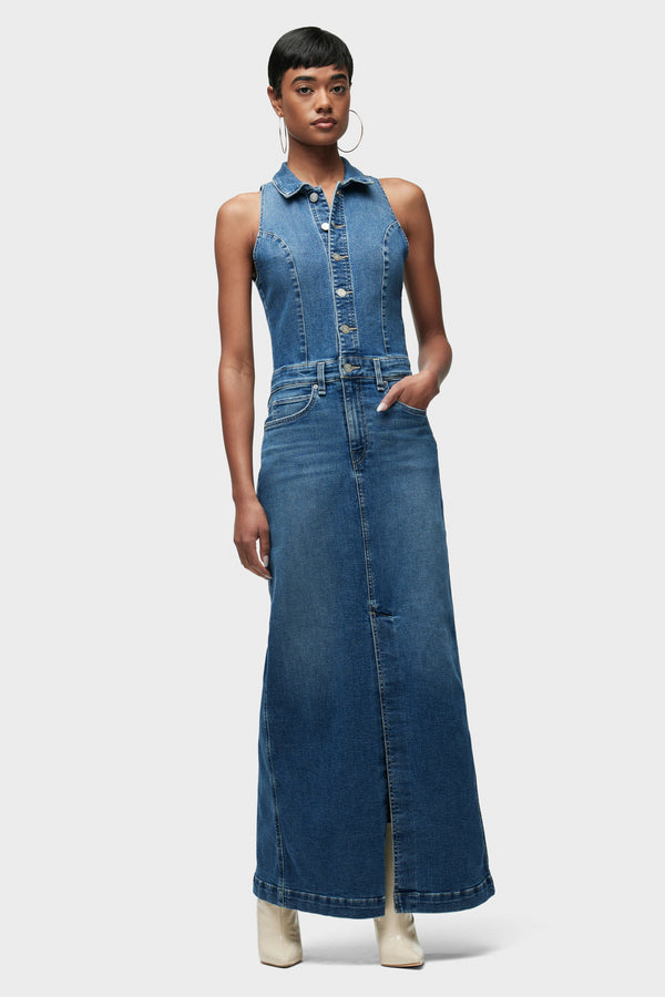 Our signature halter styling, now in a new maxi-length dress. The Halter Maxi Dress in medium-blue Riches features a pointed collar, button placket, five-pocket details, subtle edge grinding, and slits in the front and back.