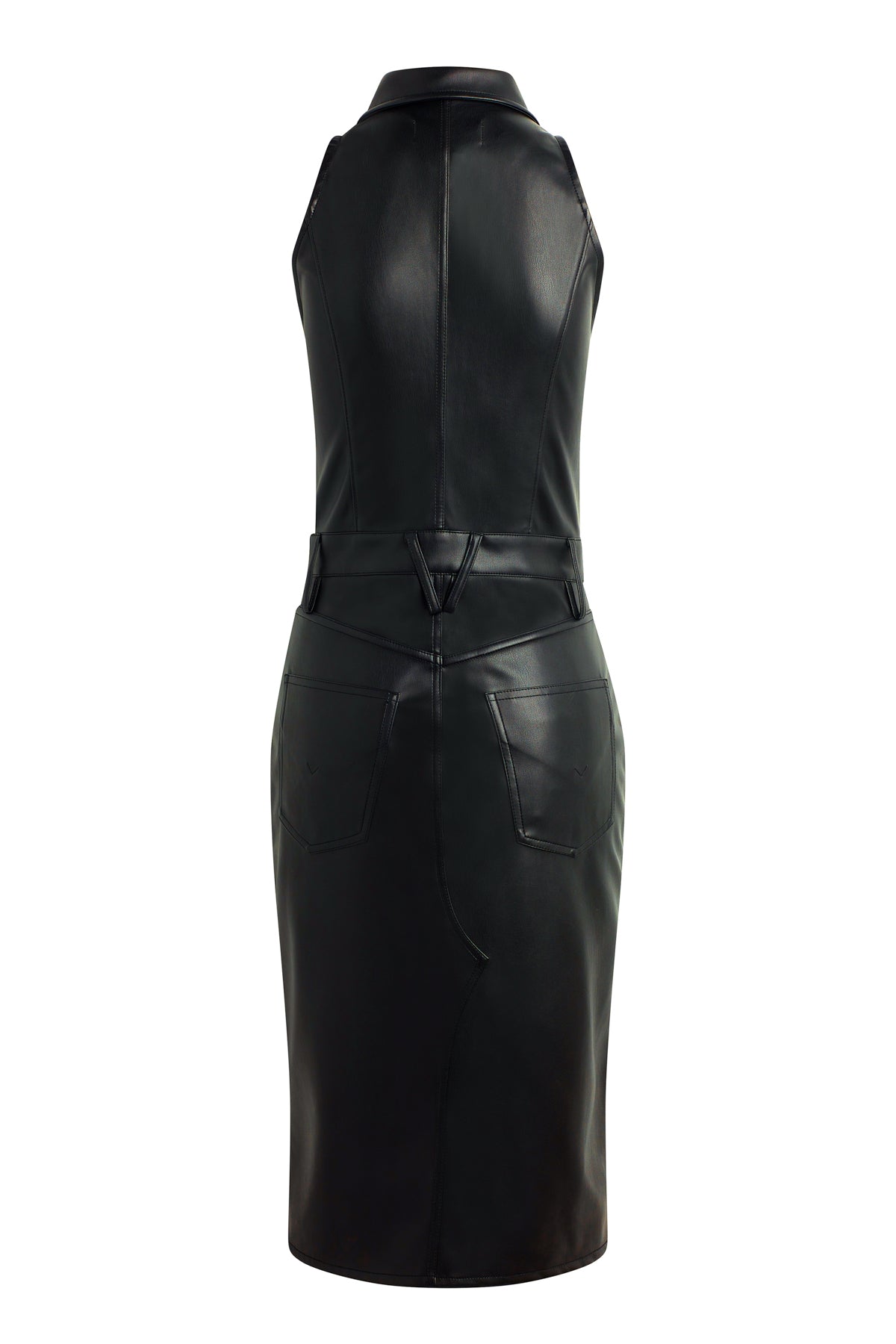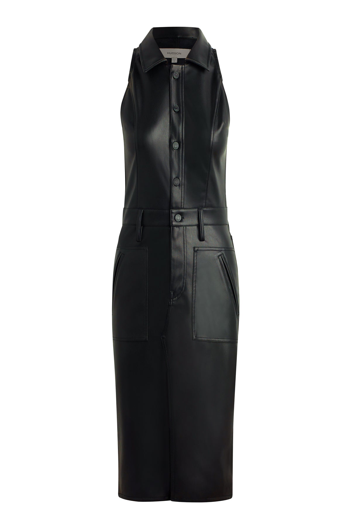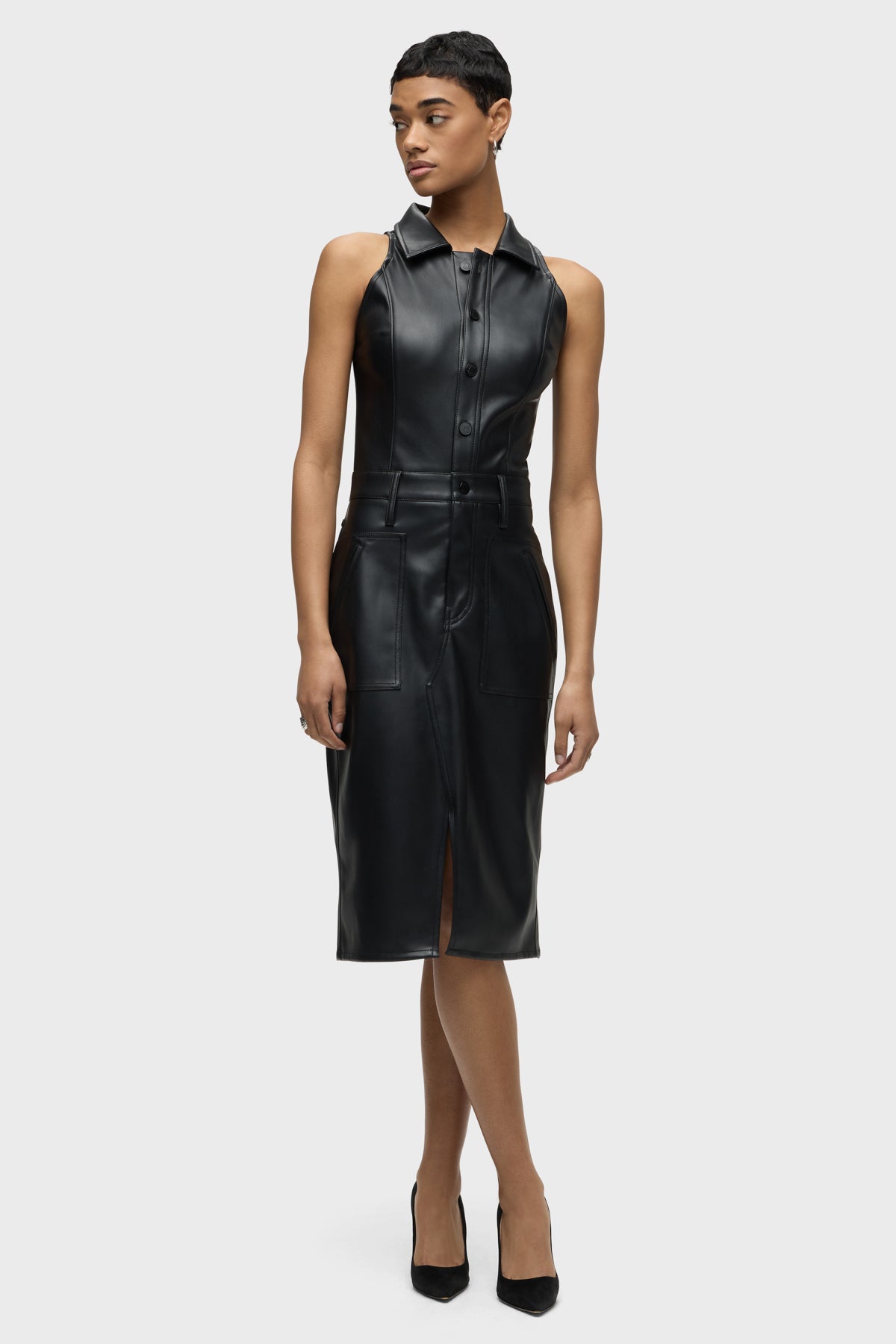 Our Halter Utility Dress in Black Illusion vegan leather features a midi length and sleeveless cut. Button front closure, pointed collar and front patch pockets finish the look. -
