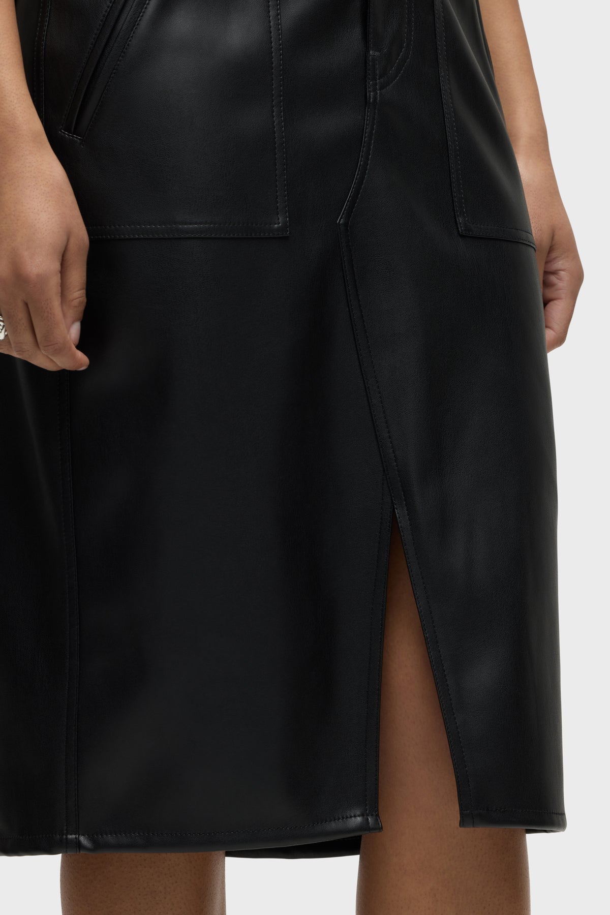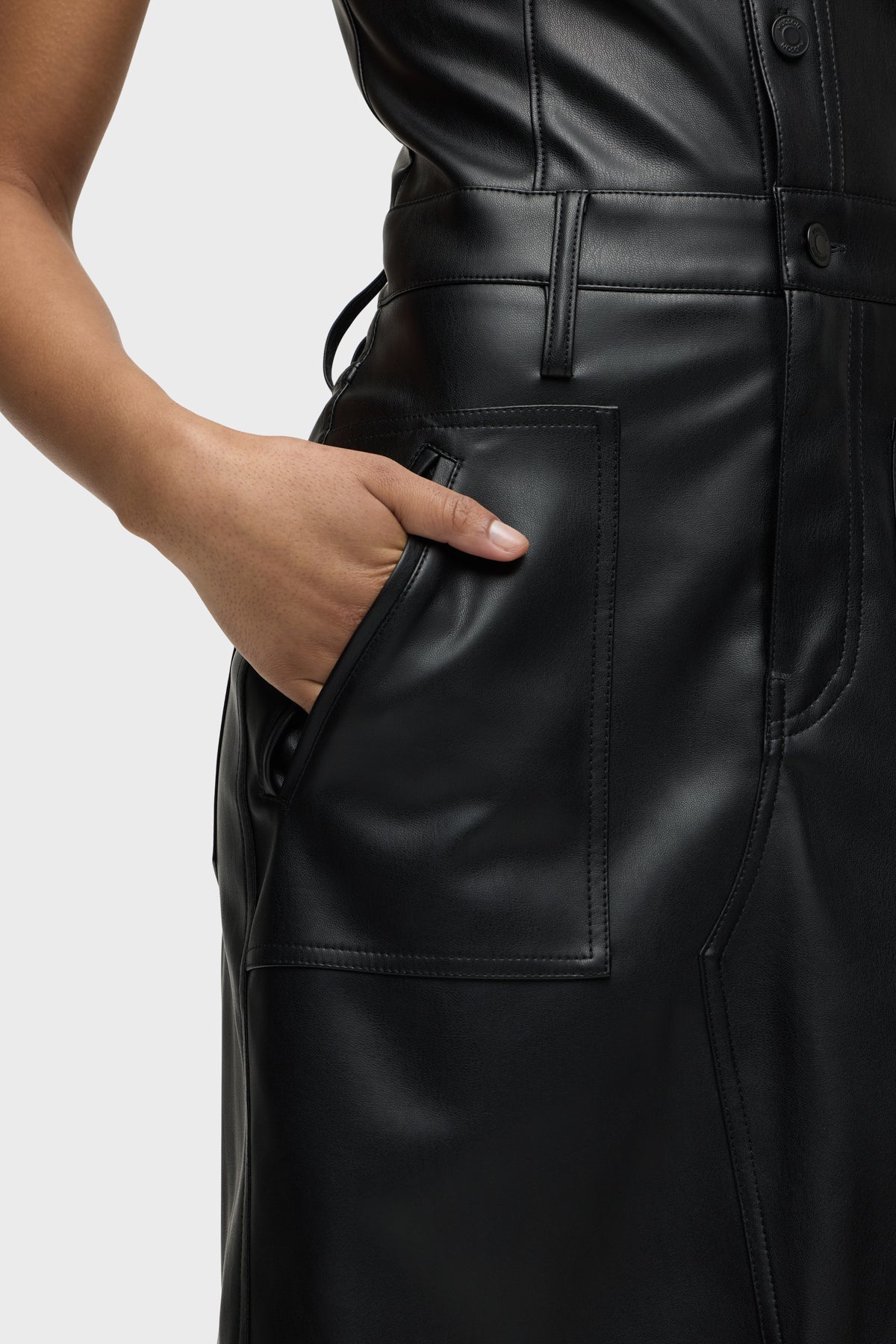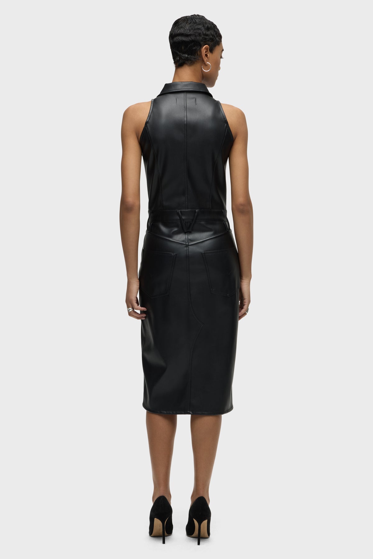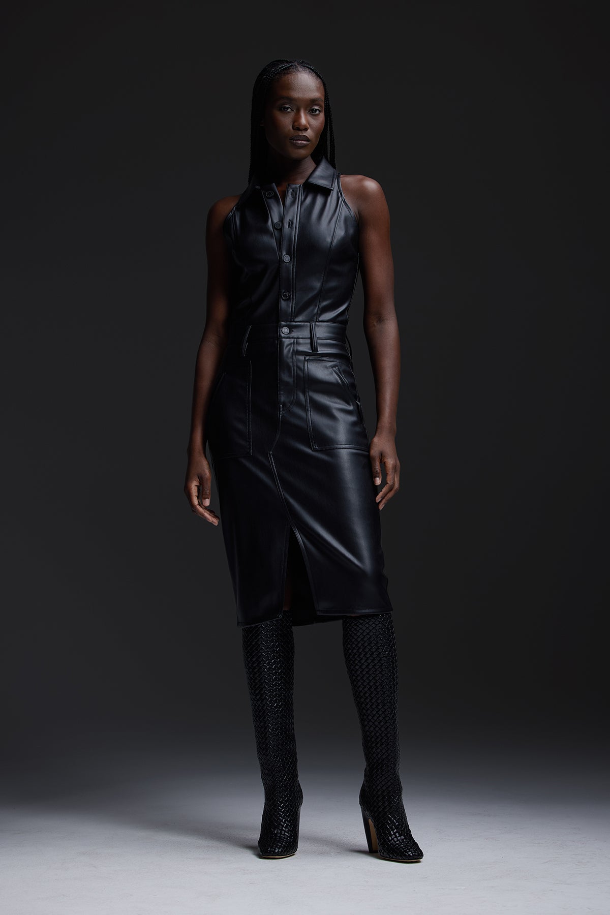 Our Halter Utility Dress in Black Illusion vegan leather features a midi length and sleeveless cut. Button front closure, pointed collar and front patch pockets finish the look. -