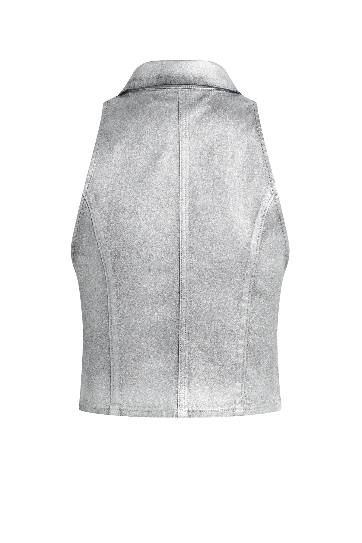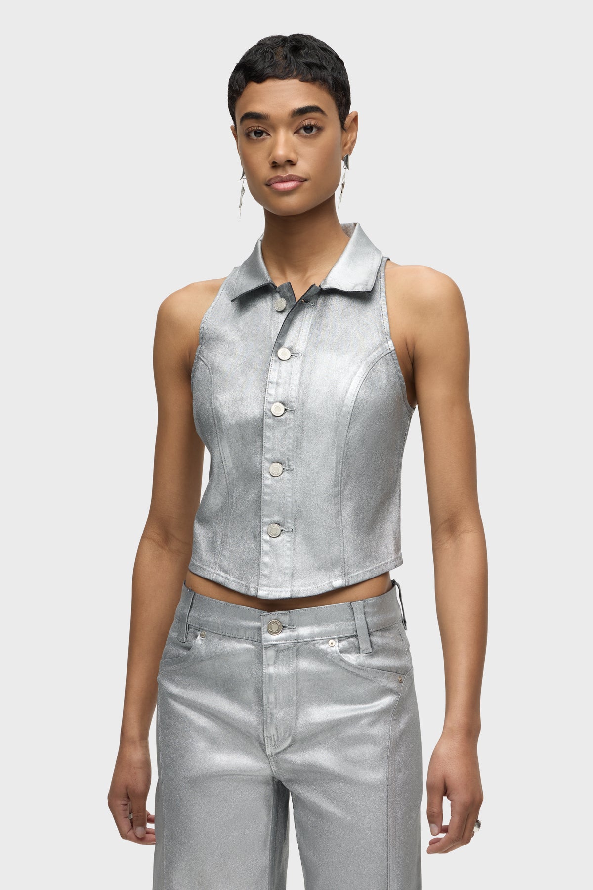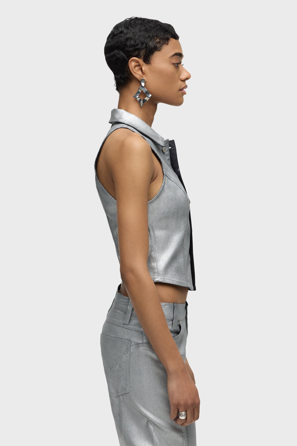 Our Halter Vest in Matte Silver Foil is a standout vest cut with a pointed collar and button up front. The overdyed black wash is finished with a soft silver foil coating. -