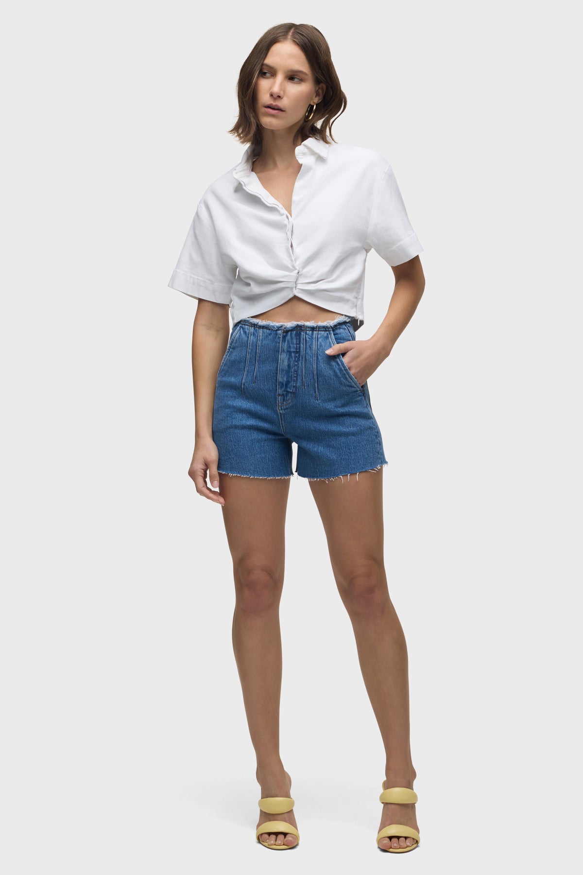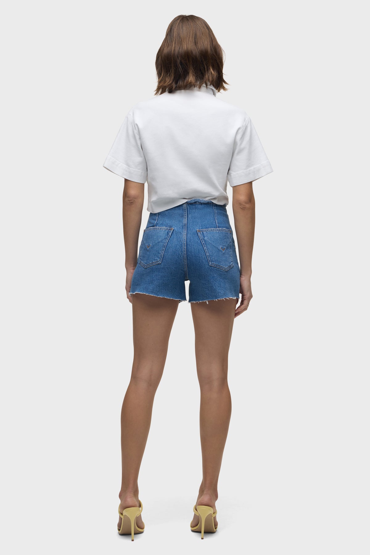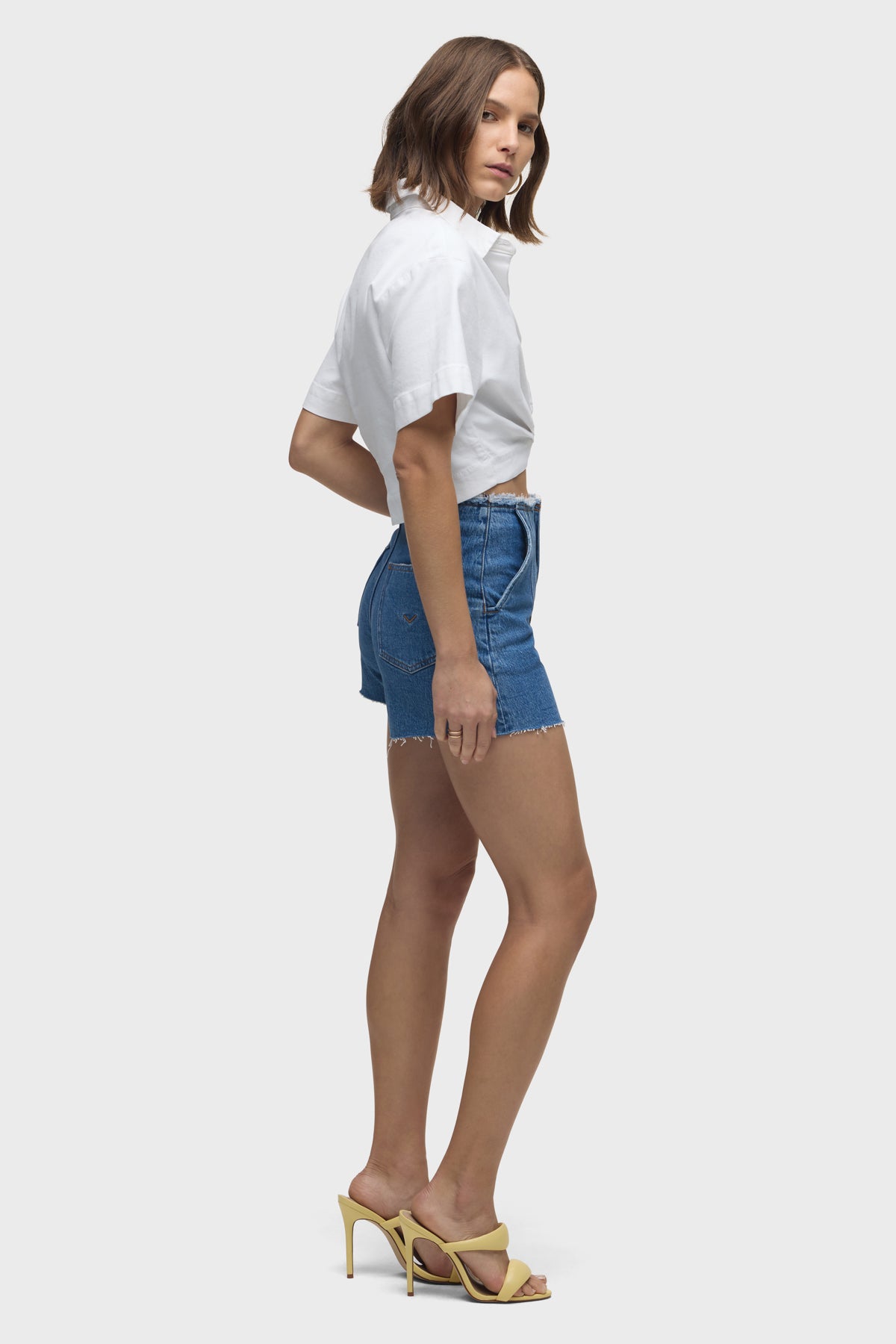 The Harlow Darted Short in Lookout is a high-rise style with a frayed waistband, darts, trouser pockets and a raw hem. This pair features a medium dark indigo wash with stone washing and edge grinding on premium comfort stretch denim. -