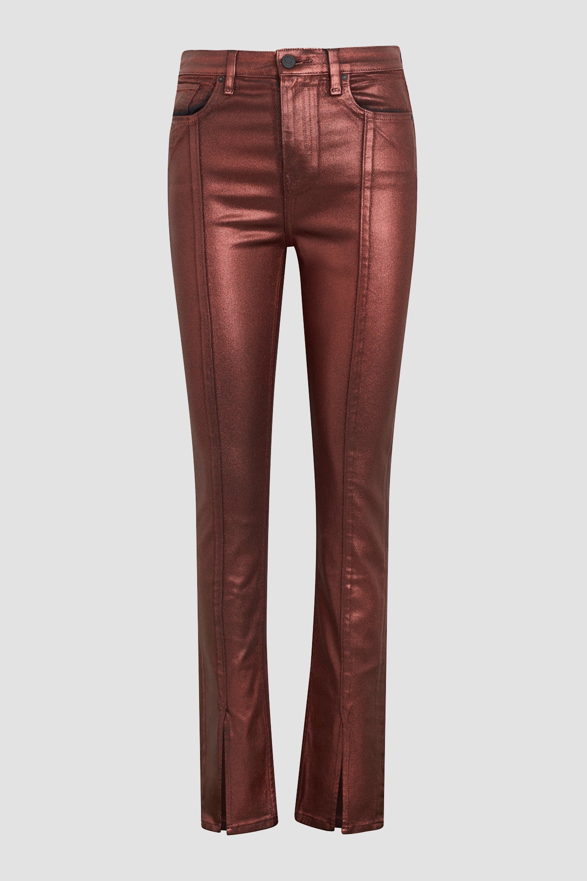 Our Harlow Ultra High-Rise Cigarette Jean in Cinnamon Glitter is cut with a slim, cropped silhouette with a shimmery flare and front slit hem. -