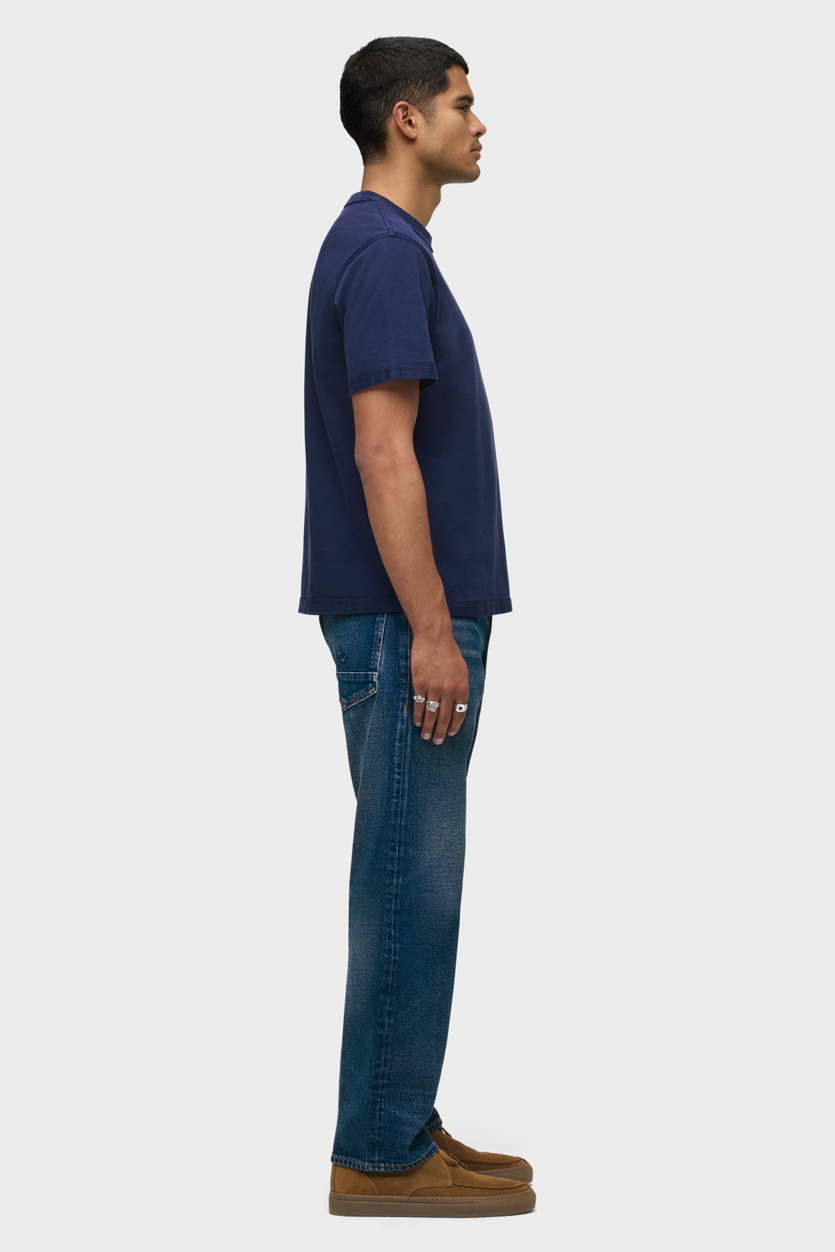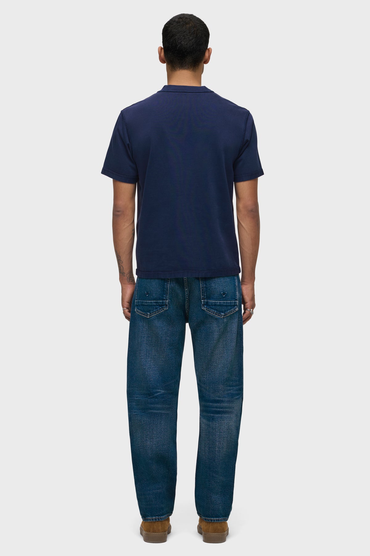 Our Heavyweight Tee is made from 100% cotton in a navy shade with a slightly cropped, boxy fit and a ribbed crew neckline. The tee is finished with reverse-seam details and stone washed to give a soft feel and worn-in look. -