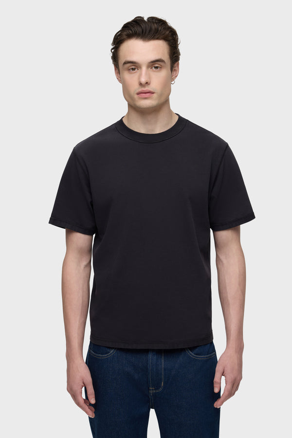 Our new Heavy Weight Tee in Forest Black is made from 100% cotton with a slightly boxy fit. The crew neckline is ribbed and the tee is finished with reverse seam details. Stone washed to give a soft feel and worn-in look. -