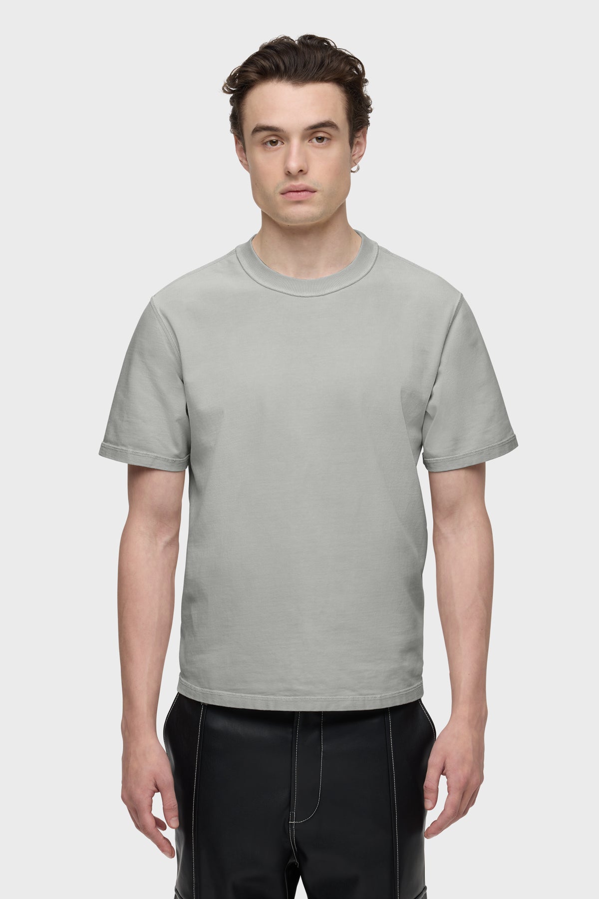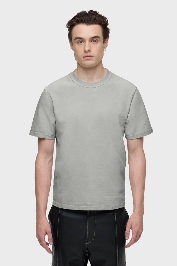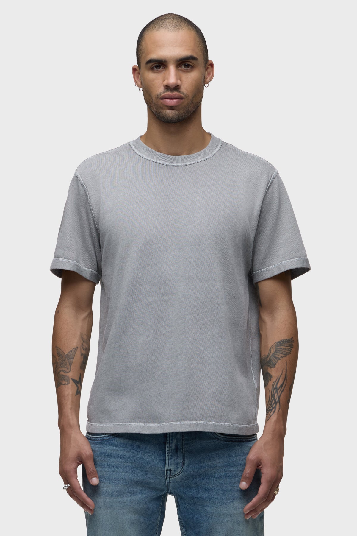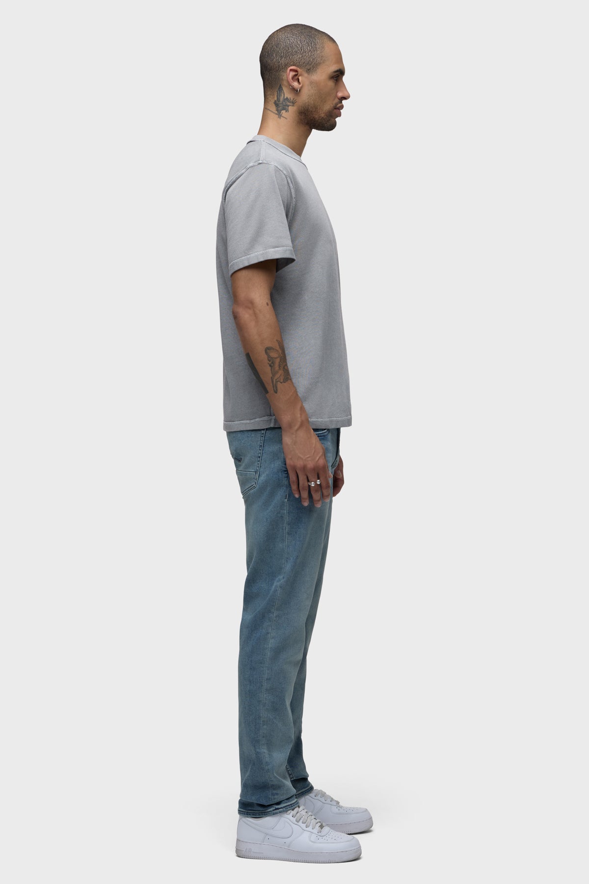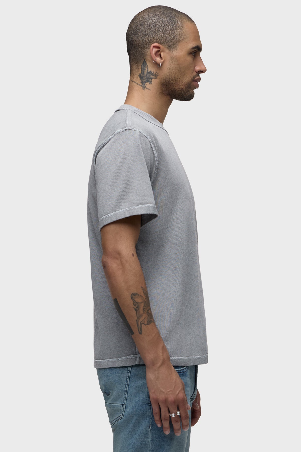 Our new Heavy Weight Tee in Lead is made from 100% cotton with a slightly boxy fit. The crew neckline is ribbed and the tee is finished with reverse seam details. Stone washed to give a soft feel and worn-in look. -