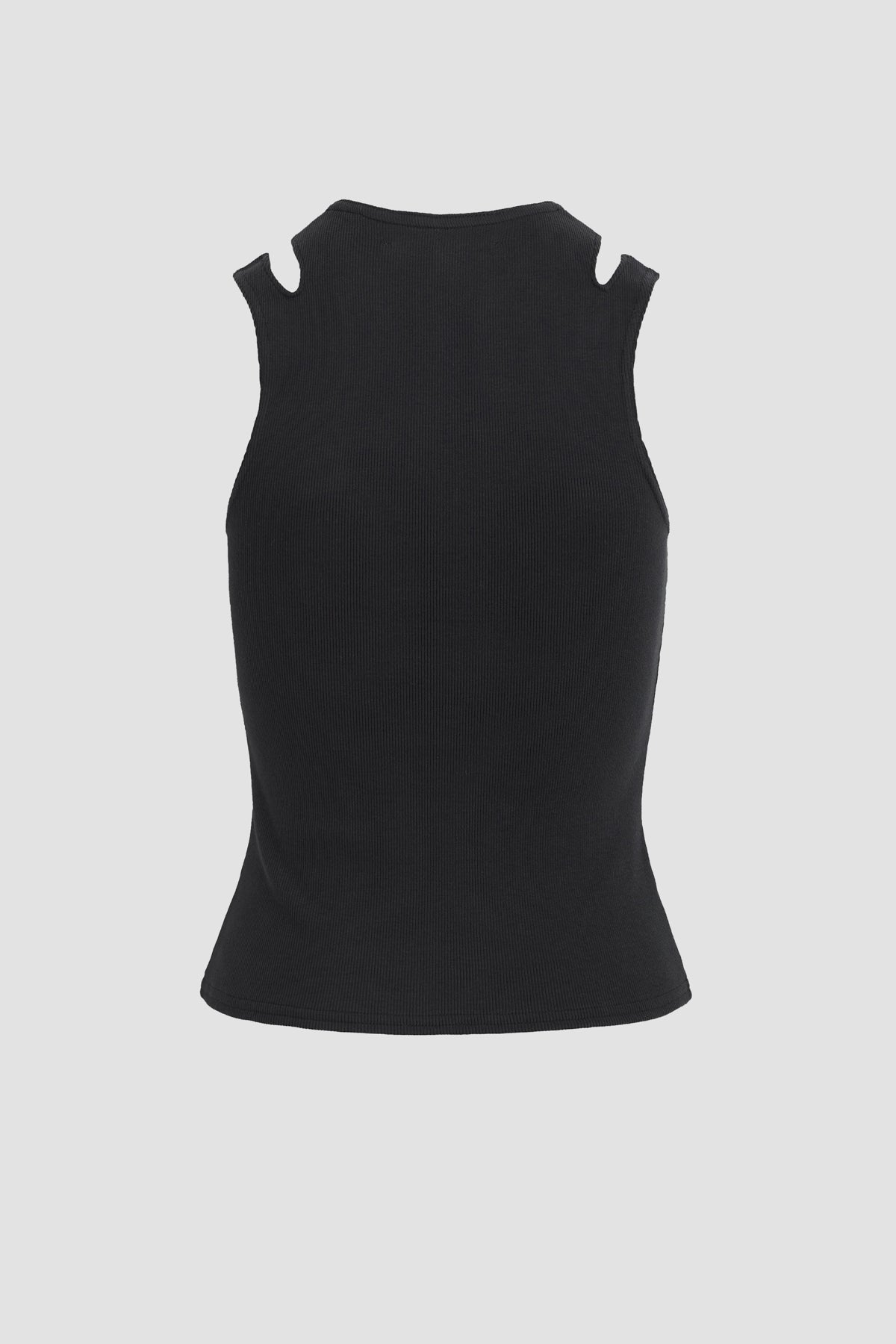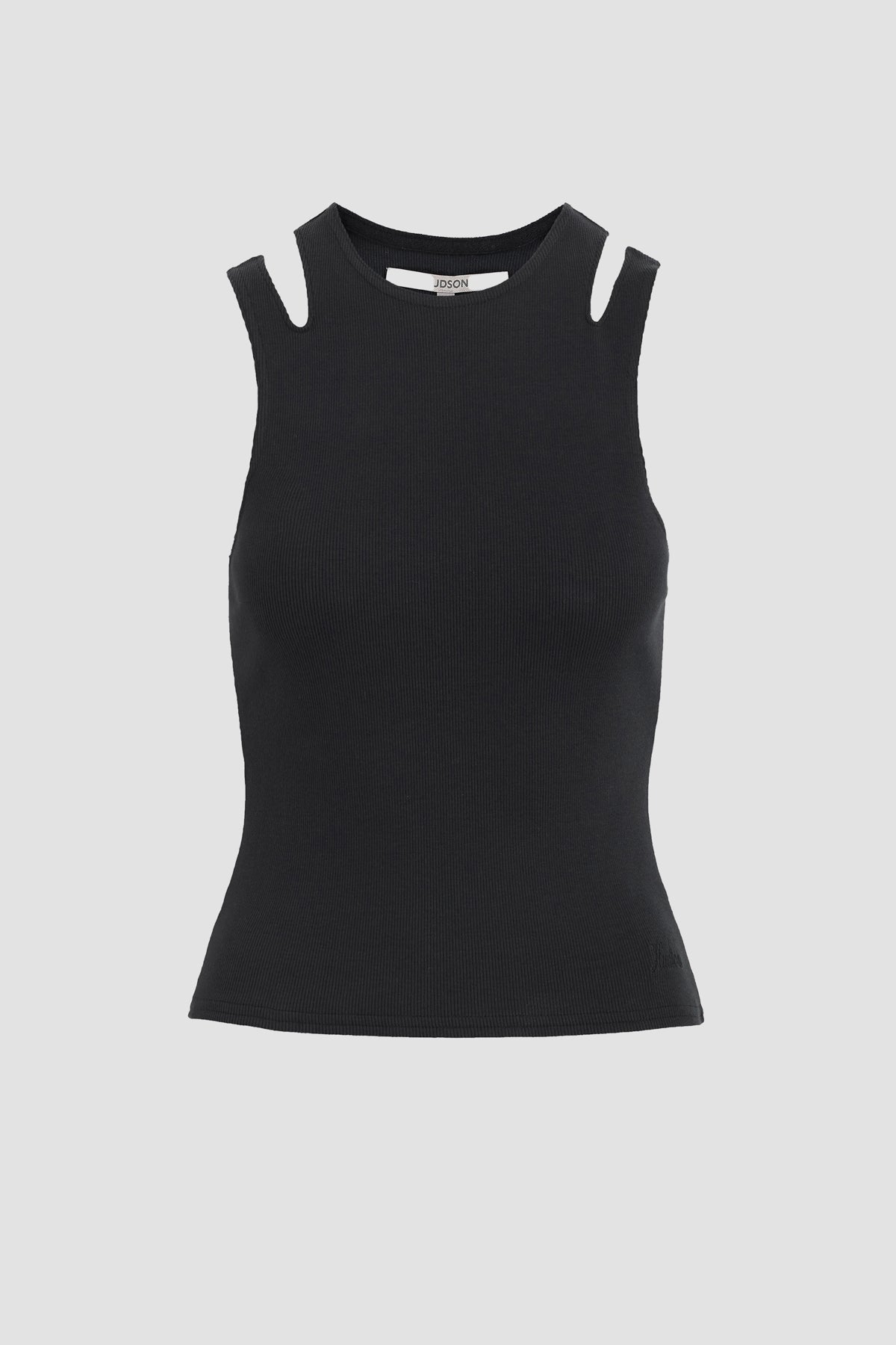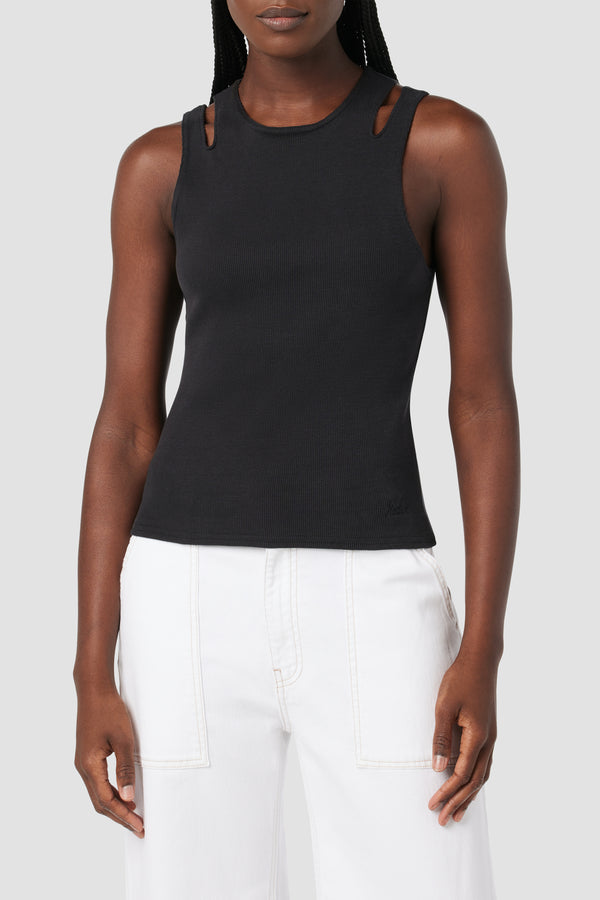 Simplicity stepped up. Our ribbed Cut Out Tank in Black is made from soft cotton and features cutouts on the shoulders and Hudson embroidery at hem. -