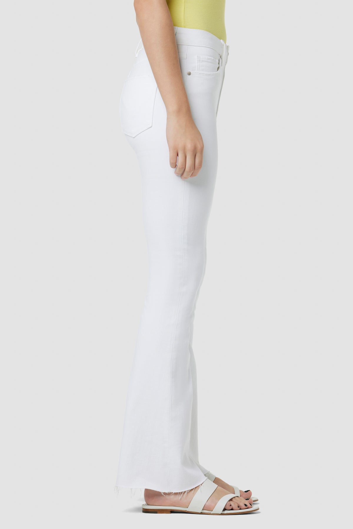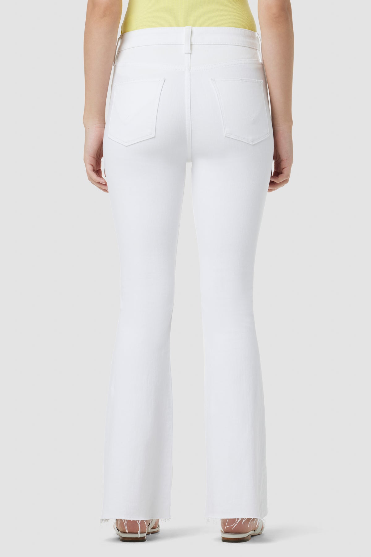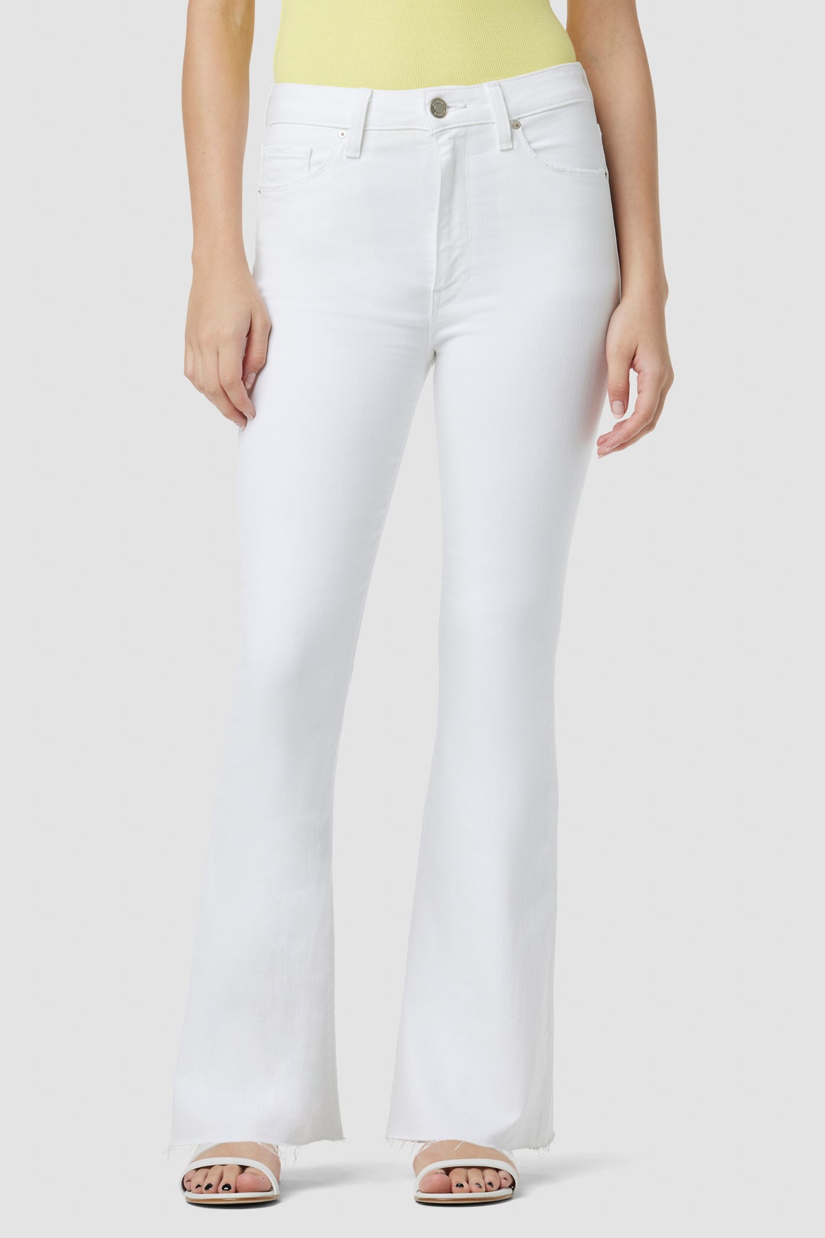 Our Holly High-Rise Flare Barefoot Jean in Spring White is cut with a shorter inseam to hit below the ankle from premium super stretch denim. It features an elevated waistline, classic five-pocket details, and a fitted leg that breaks at the knee. -