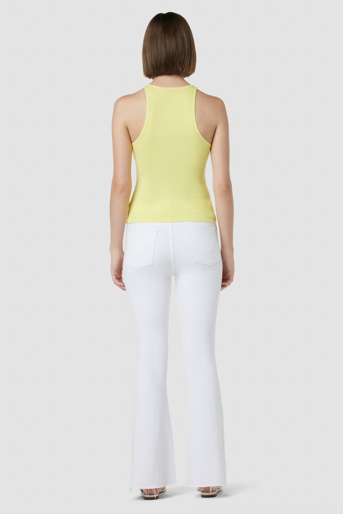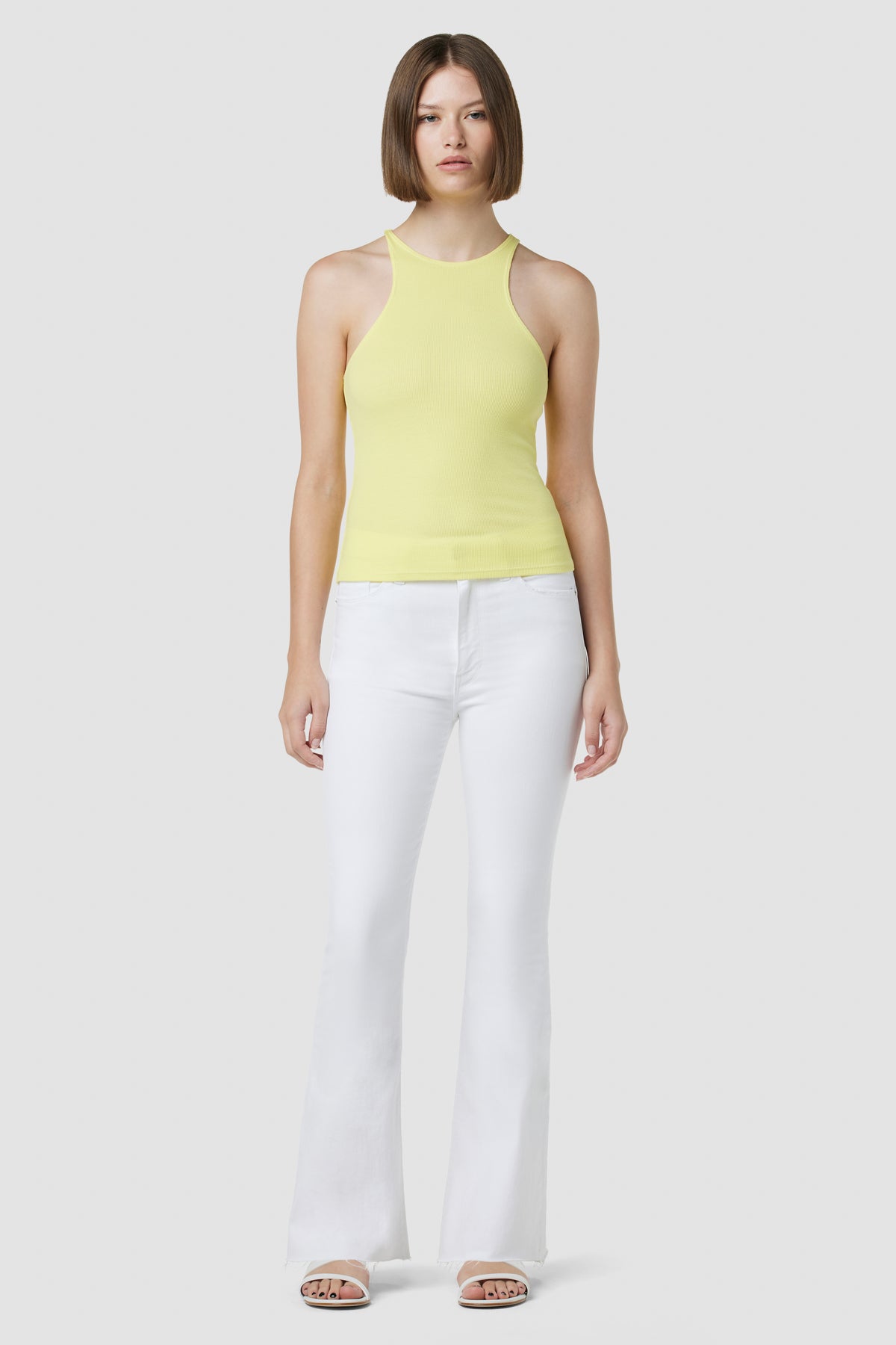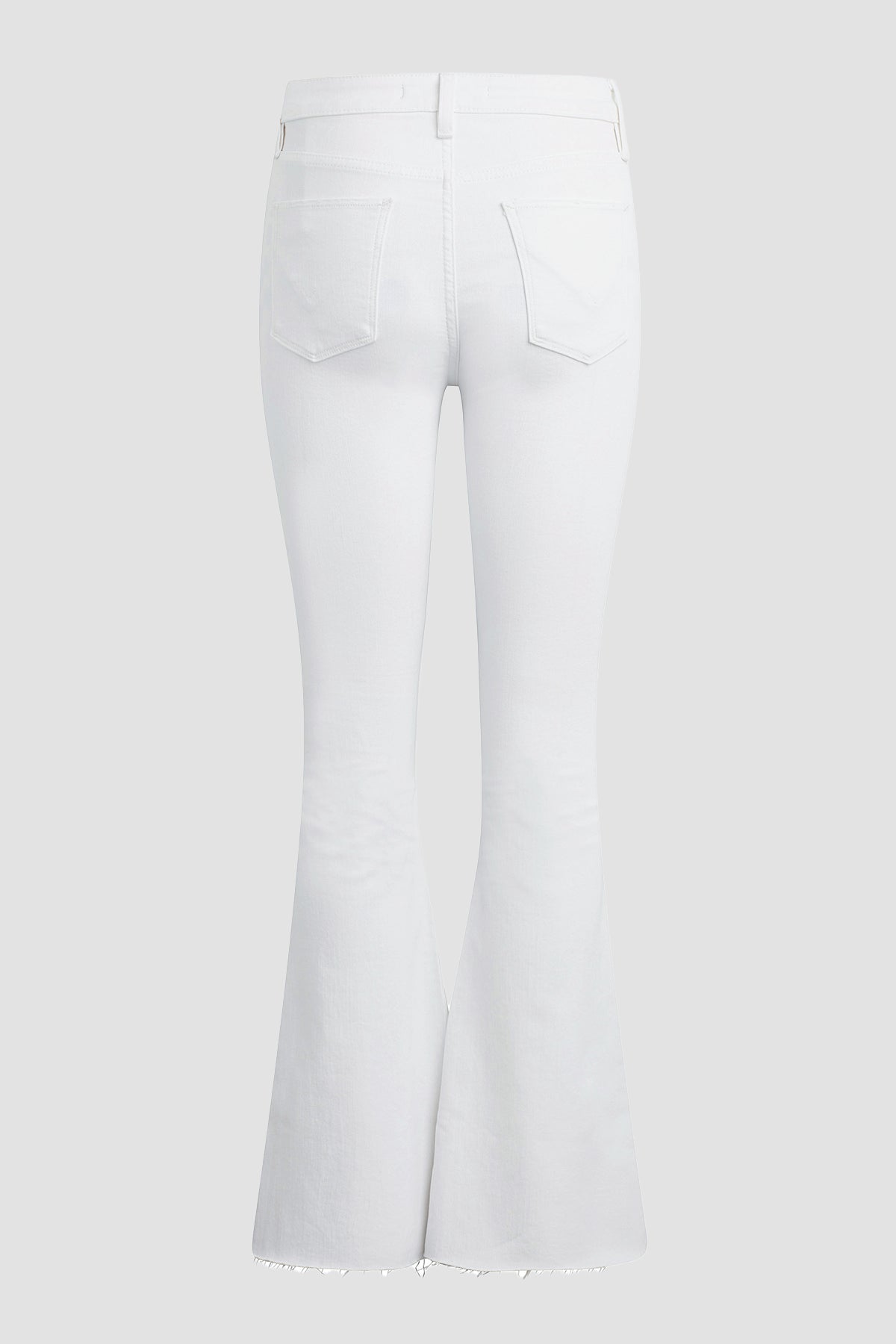 Our Holly High-Rise Flare Barefoot Jean in Spring White is cut with a shorter inseam to hit below the ankle from premium super stretch denim. It features an elevated waistline, classic five-pocket details, and a fitted leg that breaks at the knee. -