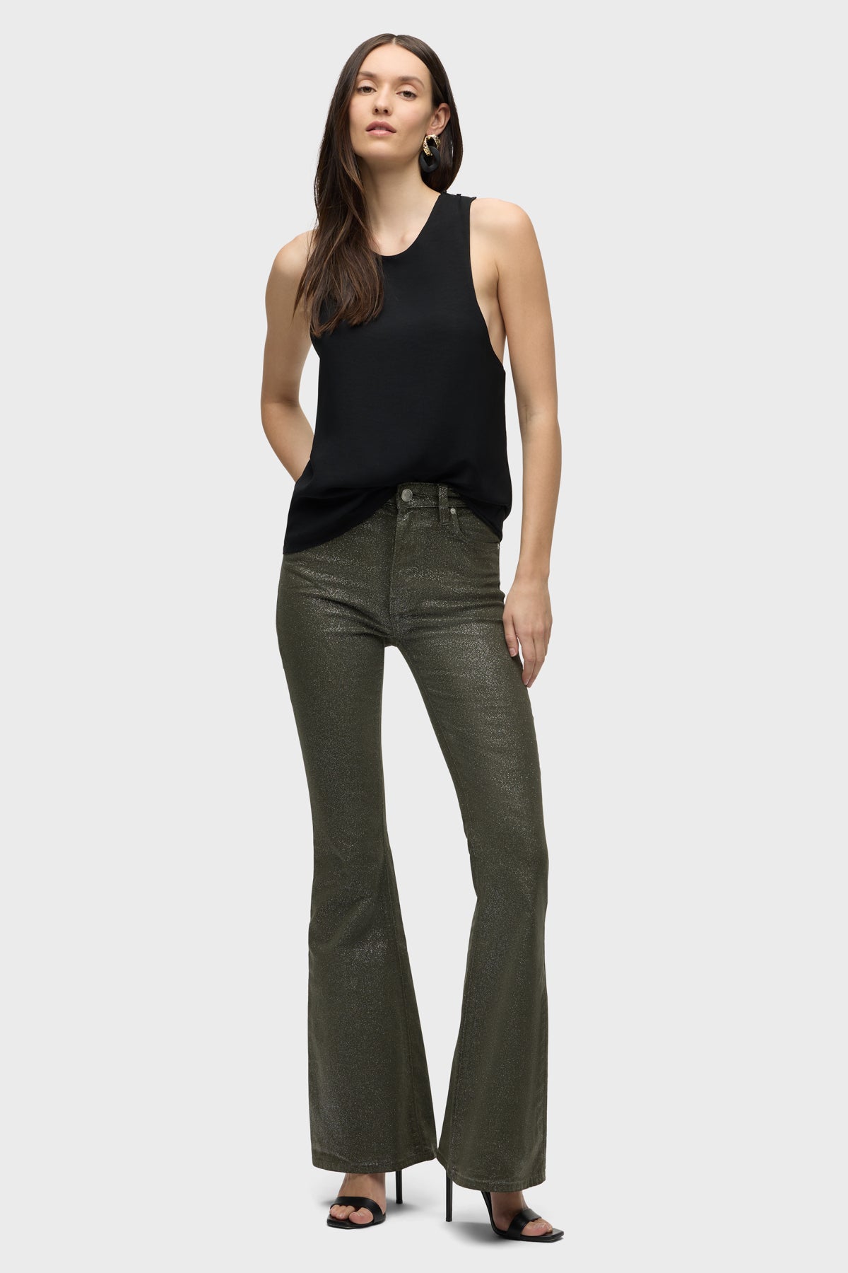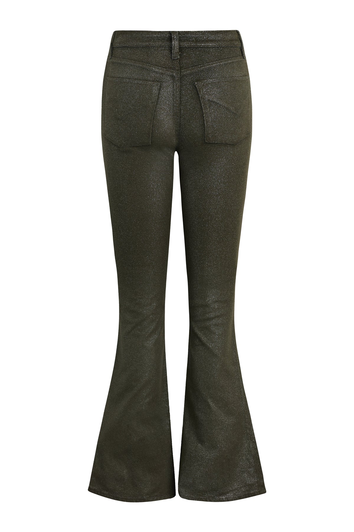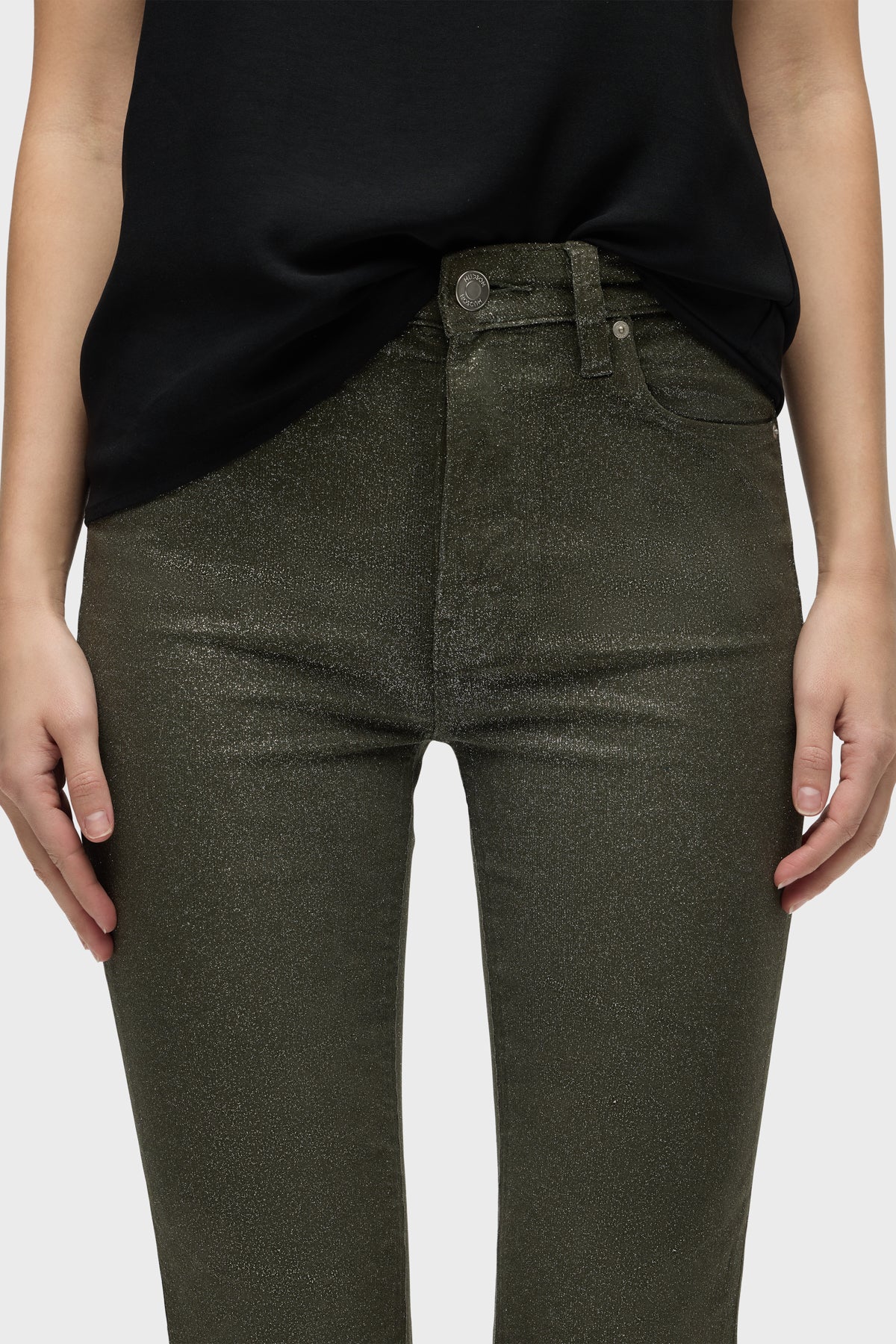 Our Holly High-Rise Flare Jean in over-dyed Cypress Glitter is cut from soft and buttery corduroy with premium comfort stretch. It features an elevated waistline, classic five-pocket details, a flared leg and soft clear coating with glitter. -