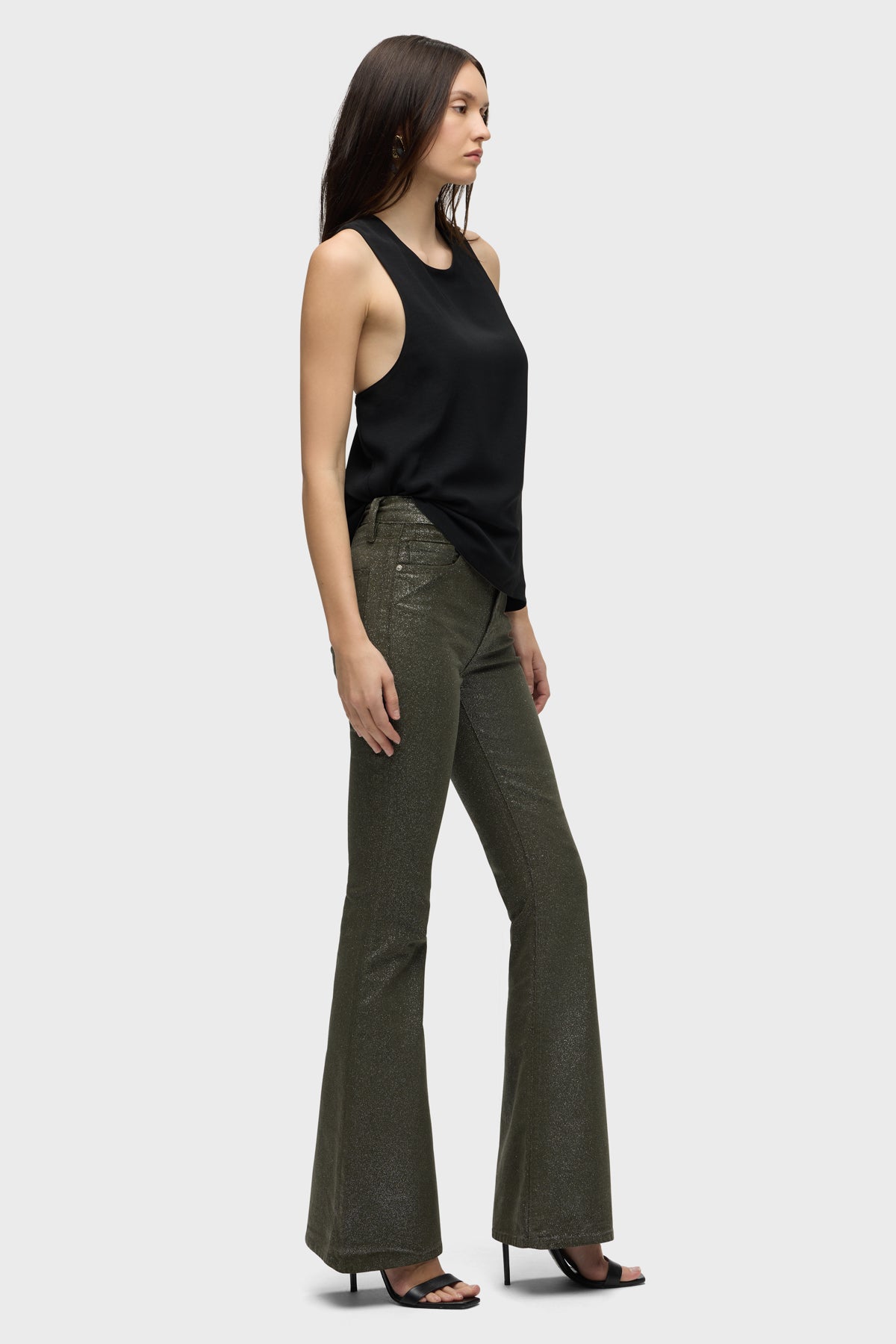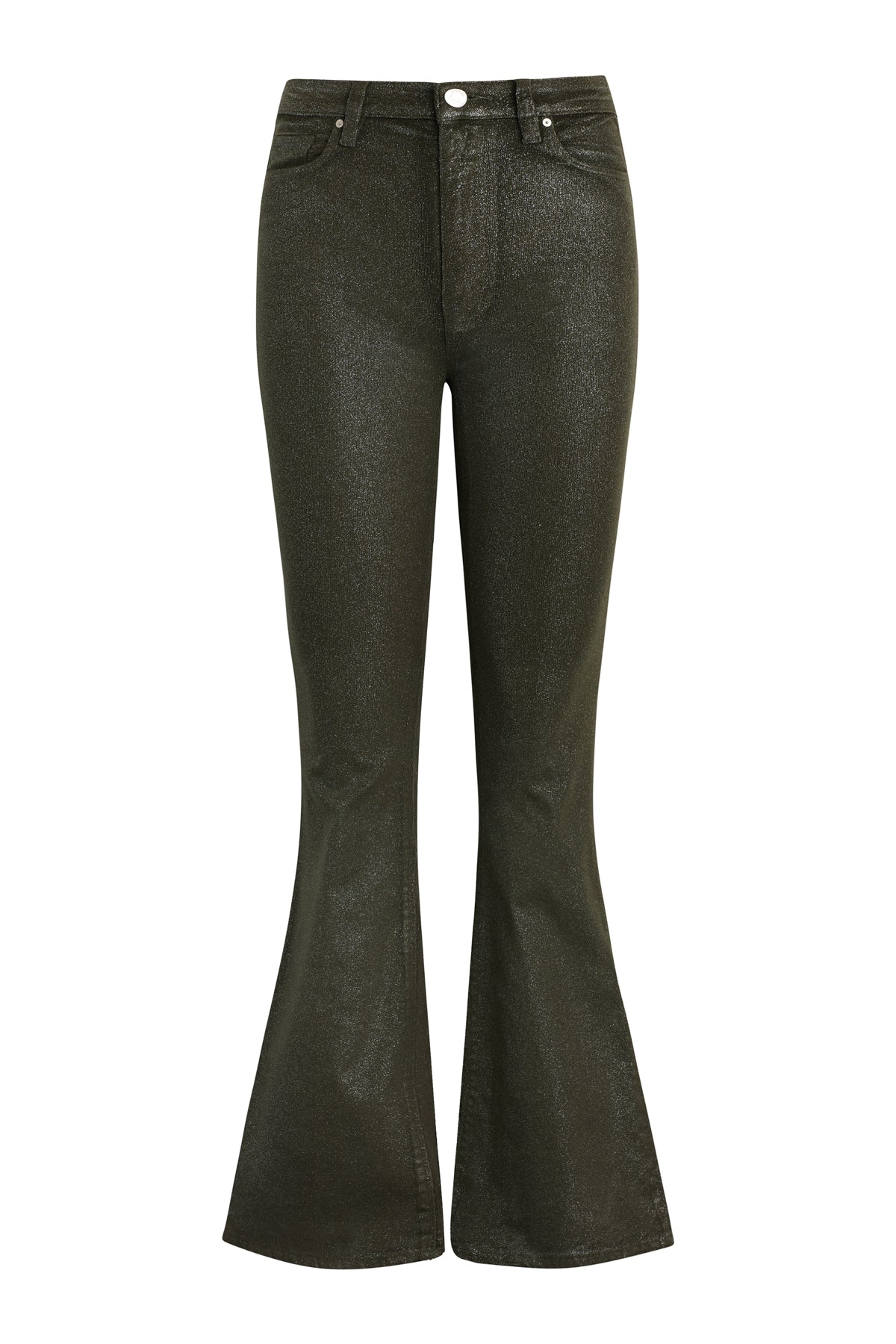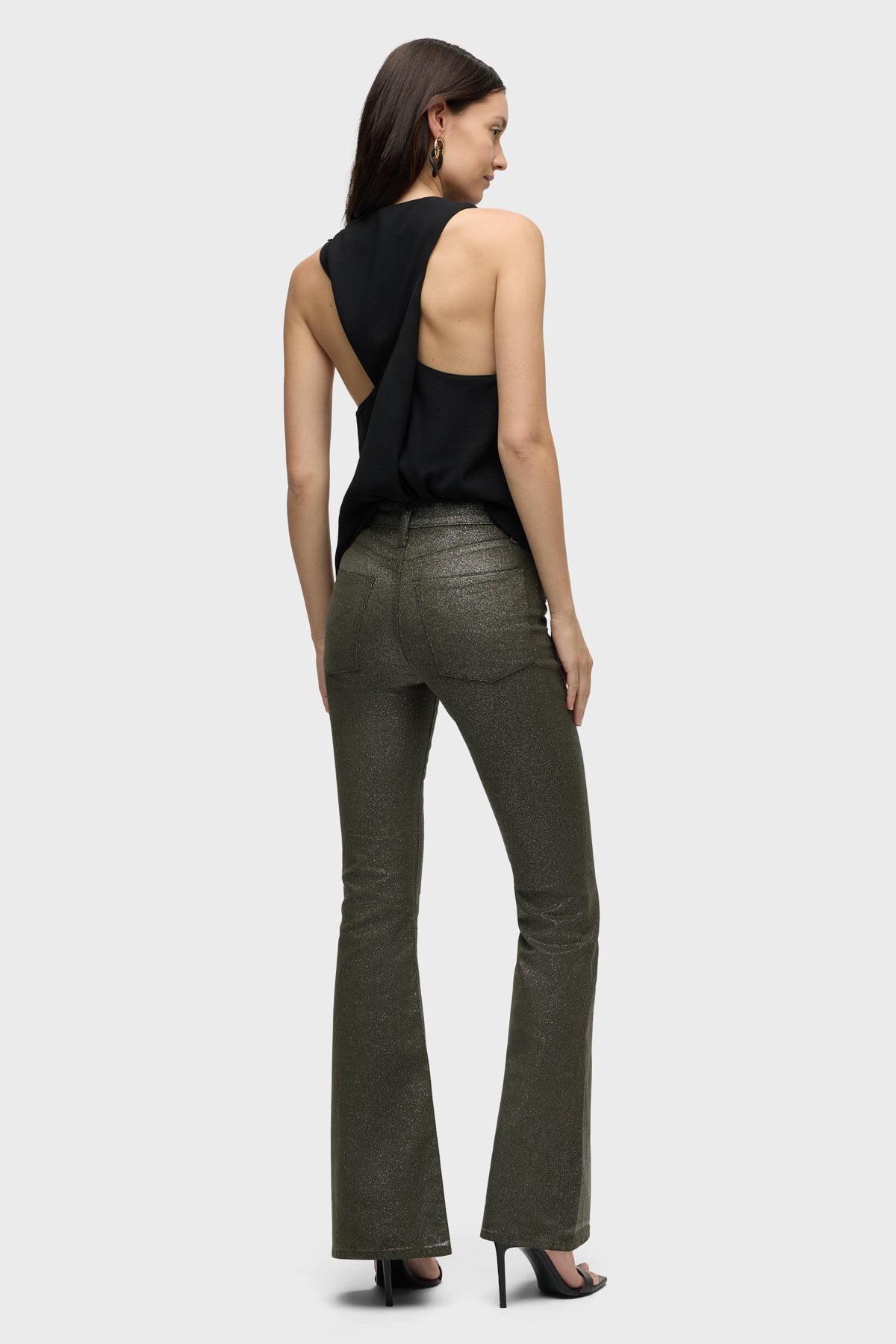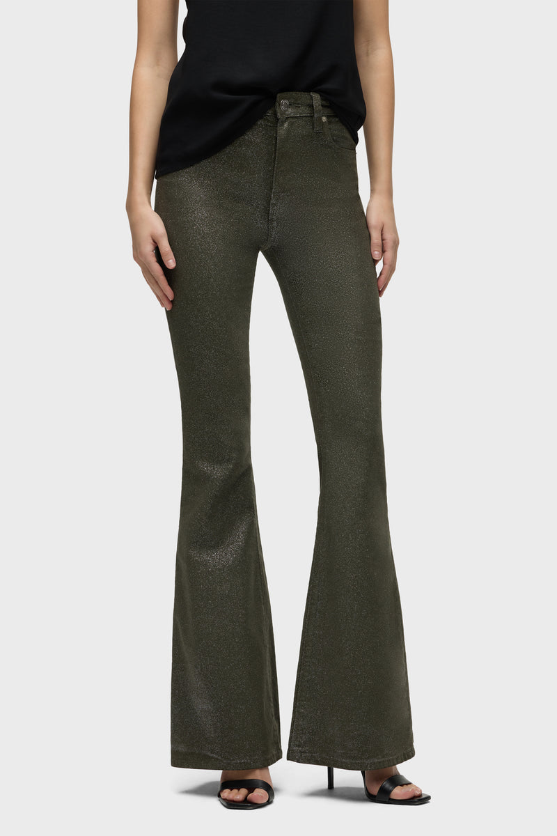 Our Holly High-Rise Flare Jean in over-dyed Cypress Glitter is cut from soft and buttery corduroy with premium comfort stretch. It features an elevated waistline, classic five-pocket details, a flared leg and soft clear coating with glitter. -