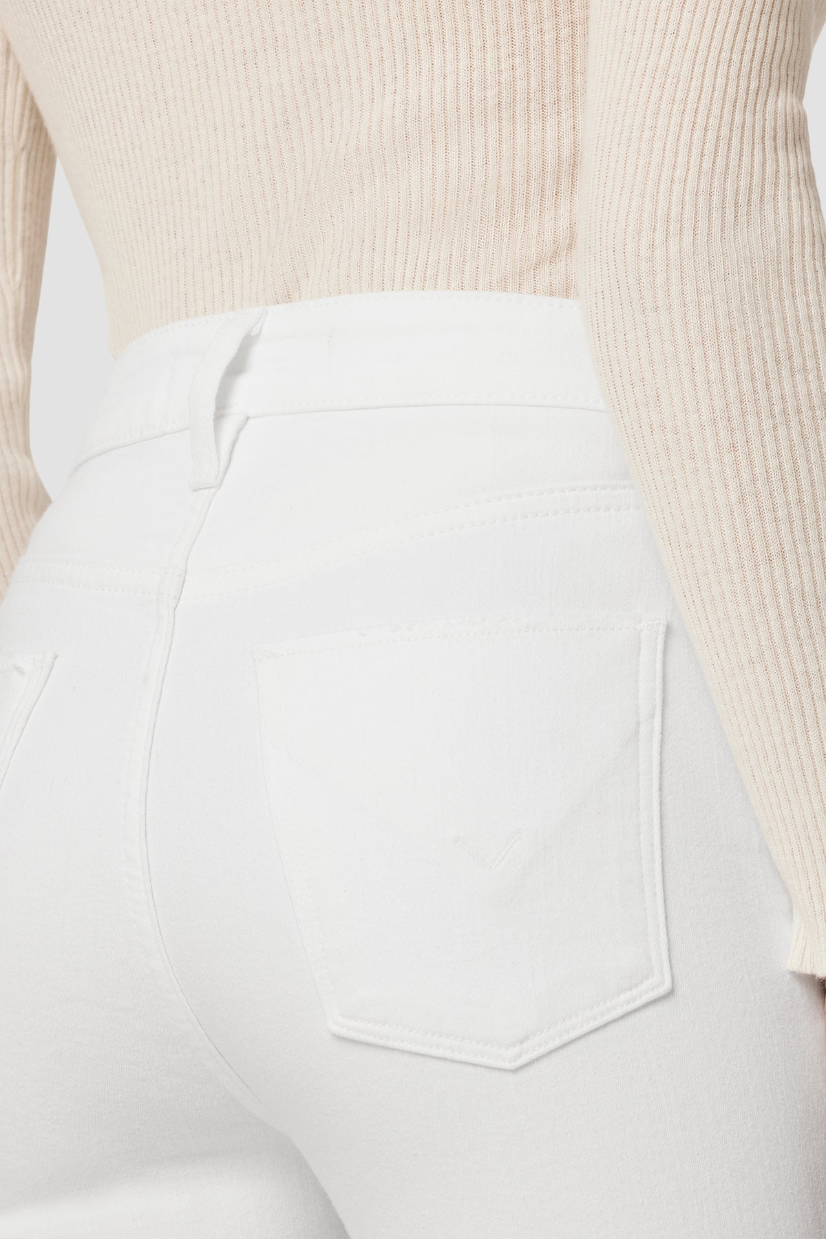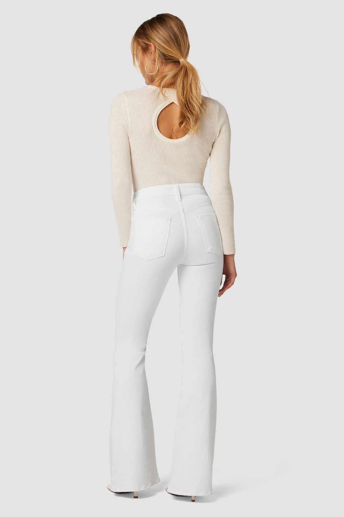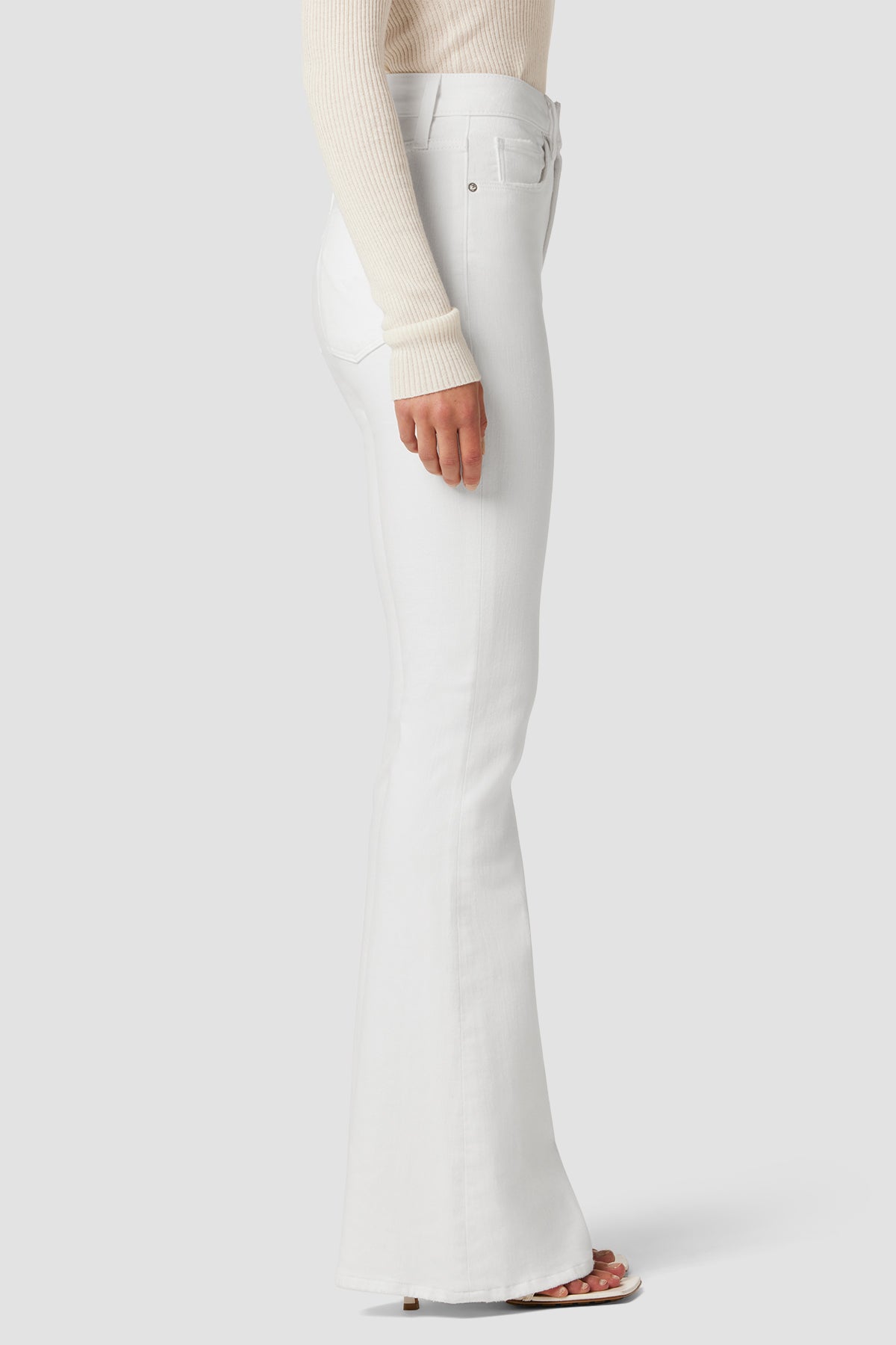 Our Holly High-Rise Flare Petite Jean in White is cut with a shorter inseam from premium super stretch denim. It features an elevated waistline, classic five-pocket details, and a fitted leg that breaks at the knee. As part of our Eco-Forward initiative, this garment is made with eco-friendly materials and innovative technology to soften our impact on Earth. -