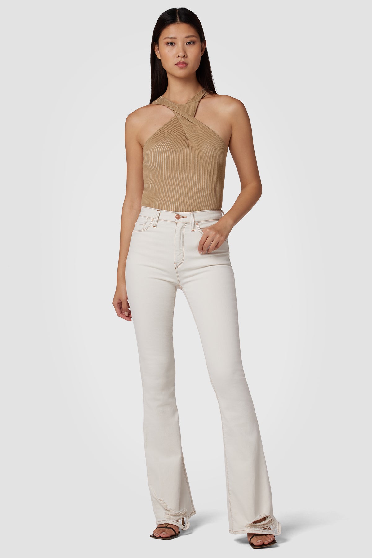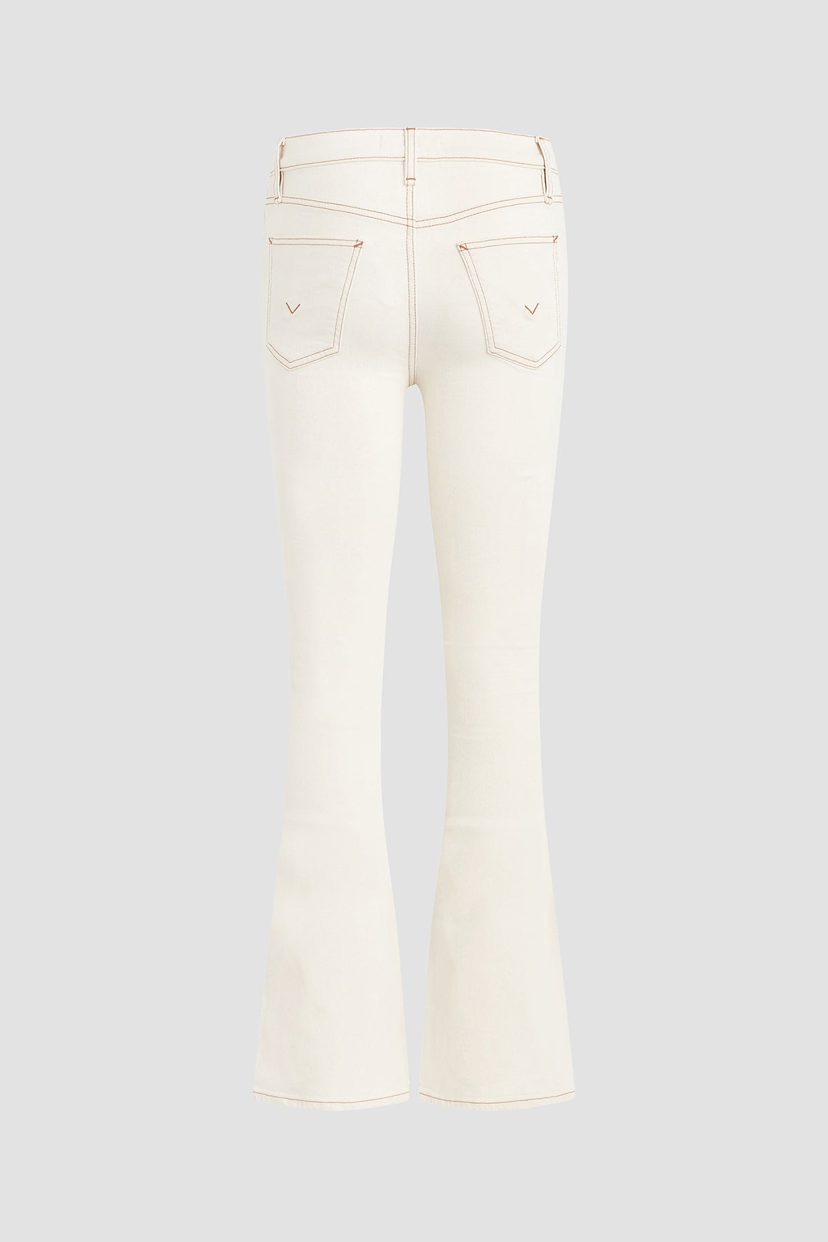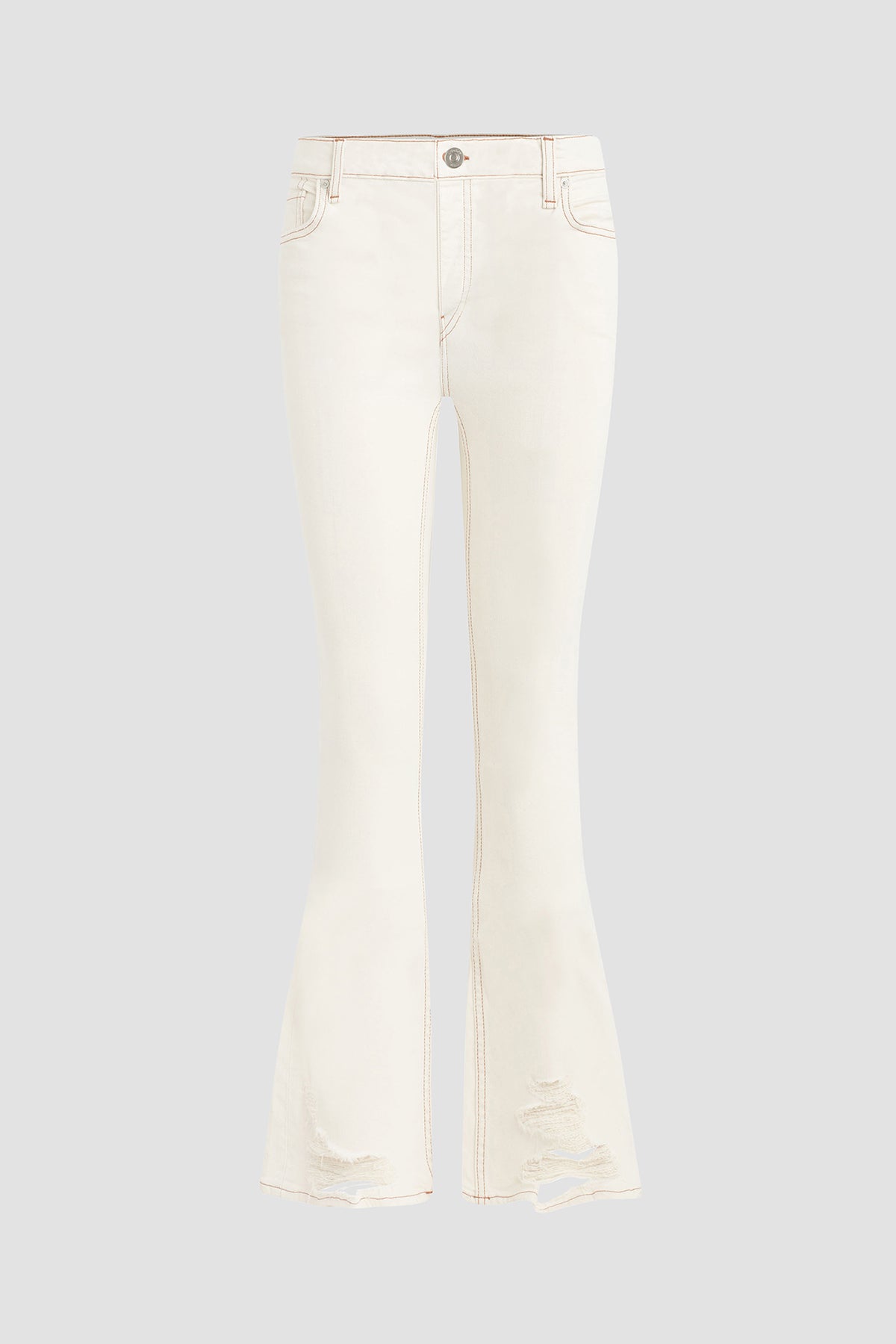 Our Holly High-Rise Flare Jean in Soft Ecru is cut from premium comfort stretch denim with vintage-feel distressing at the hems. Features an elevated waistline, classic five-pocket details, and a fitted leg that breaks at the knee. -
