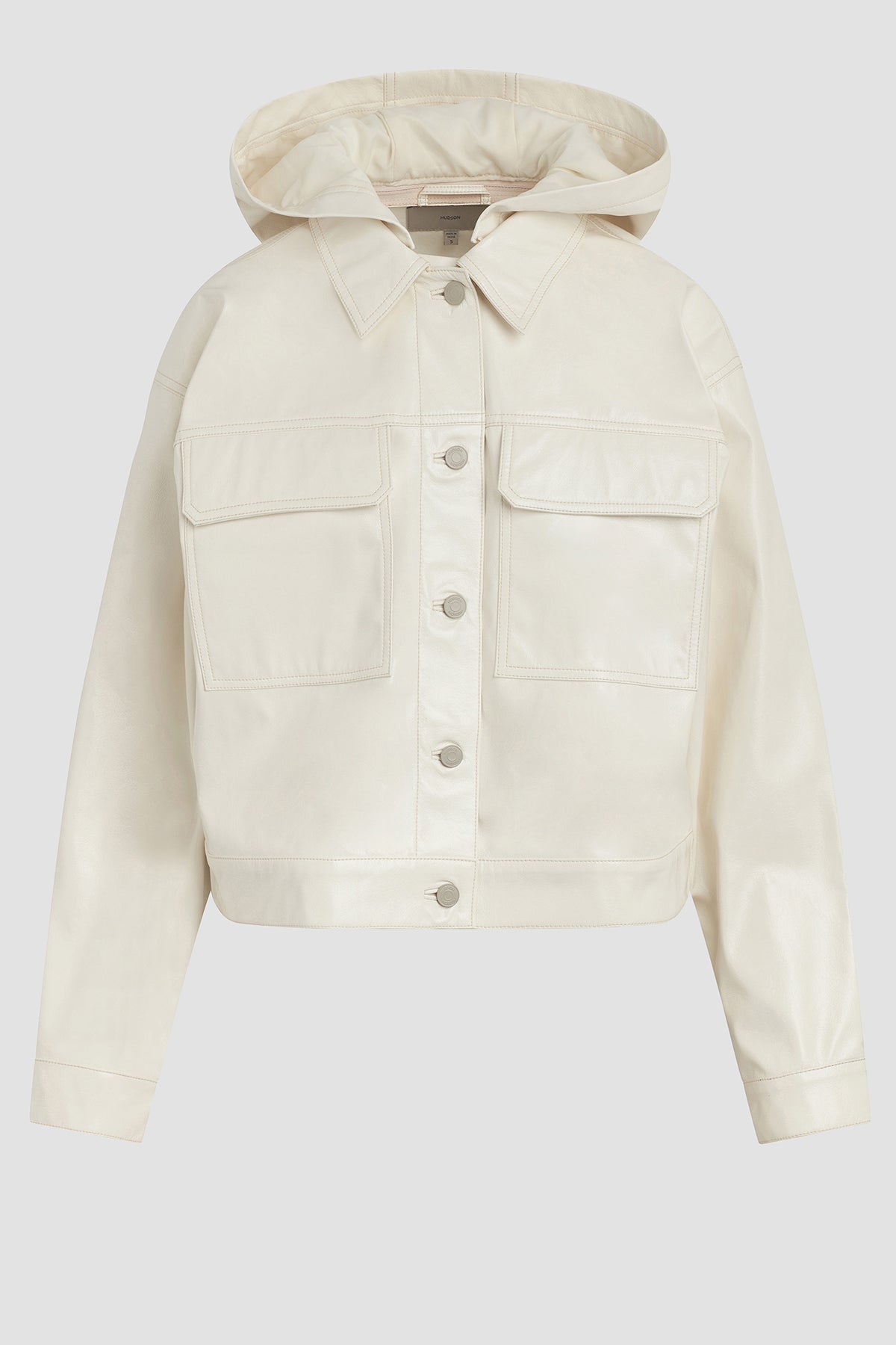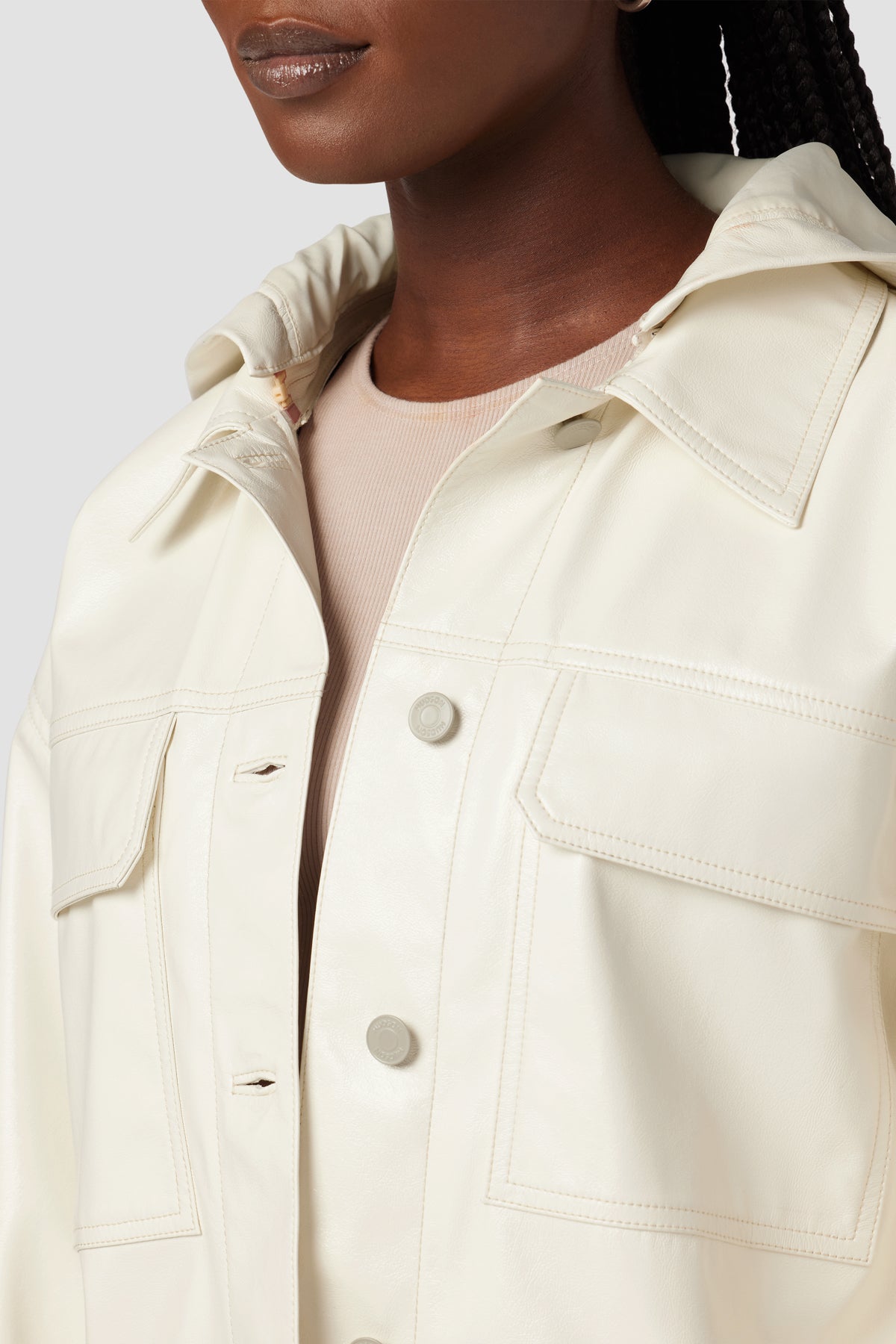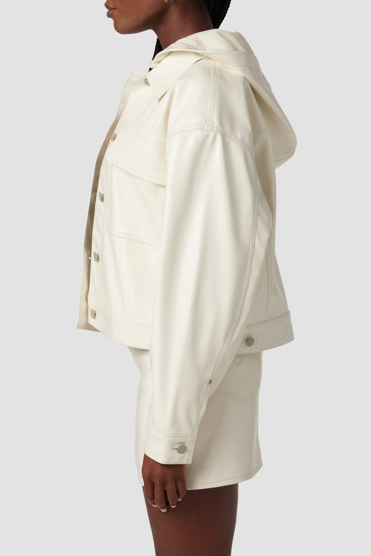 Our Hoodie Swing Trucker Jacket in Patent Egret is crafted from our vegan Illusion Leather. Front flap pockets and detachable hood finish the look. -