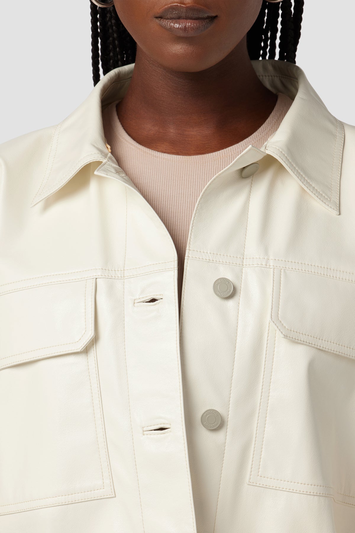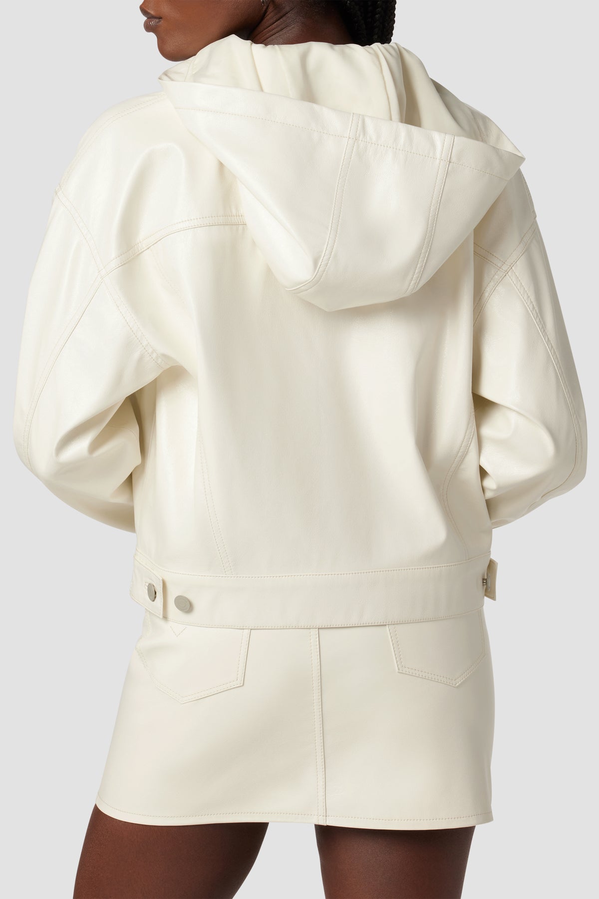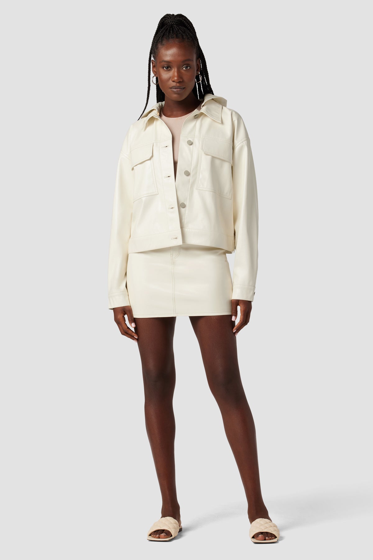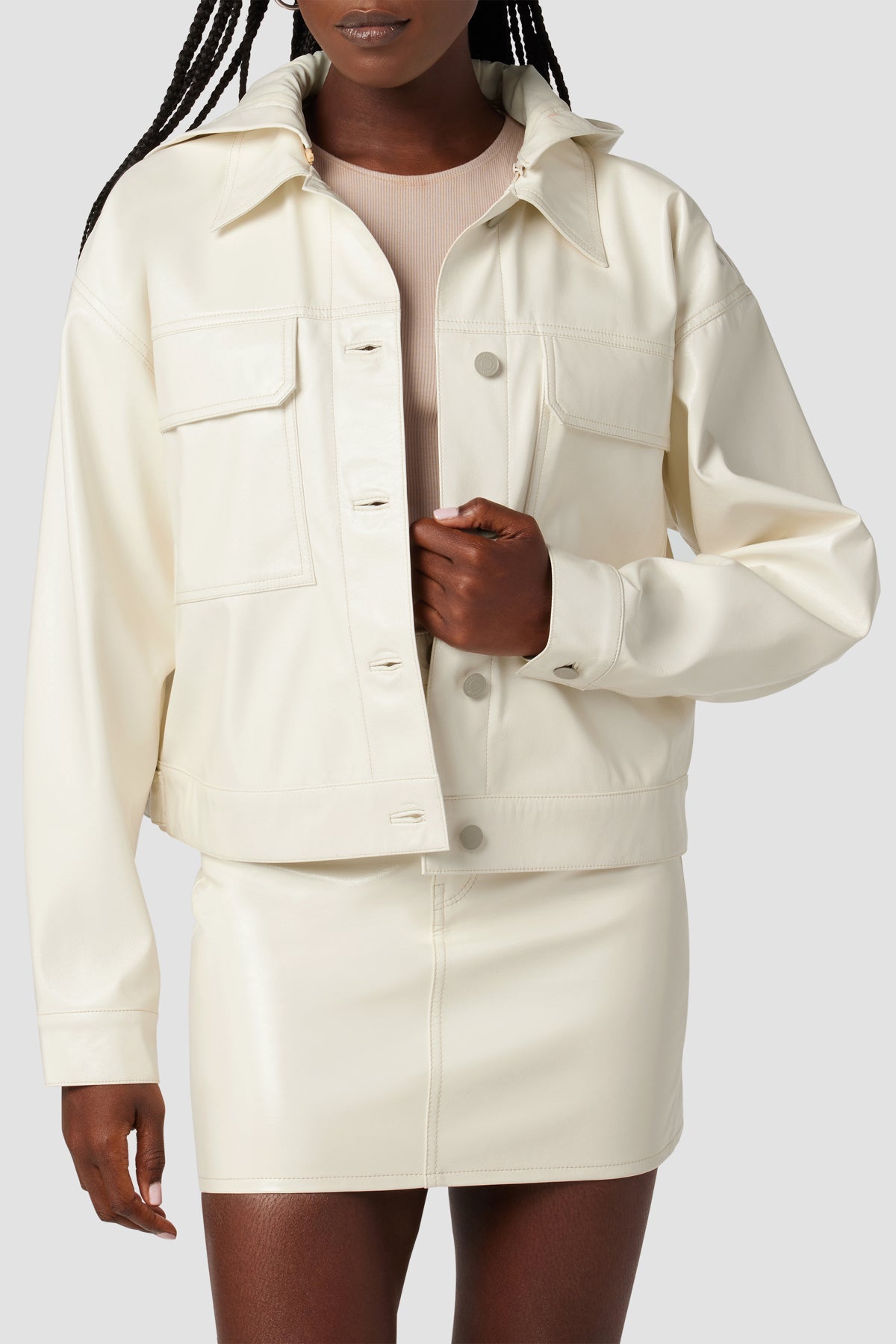 Our Hoodie Swing Trucker Jacket in Patent Egret is crafted from our vegan Illusion Leather. Front flap pockets and detachable hood finish the look. -