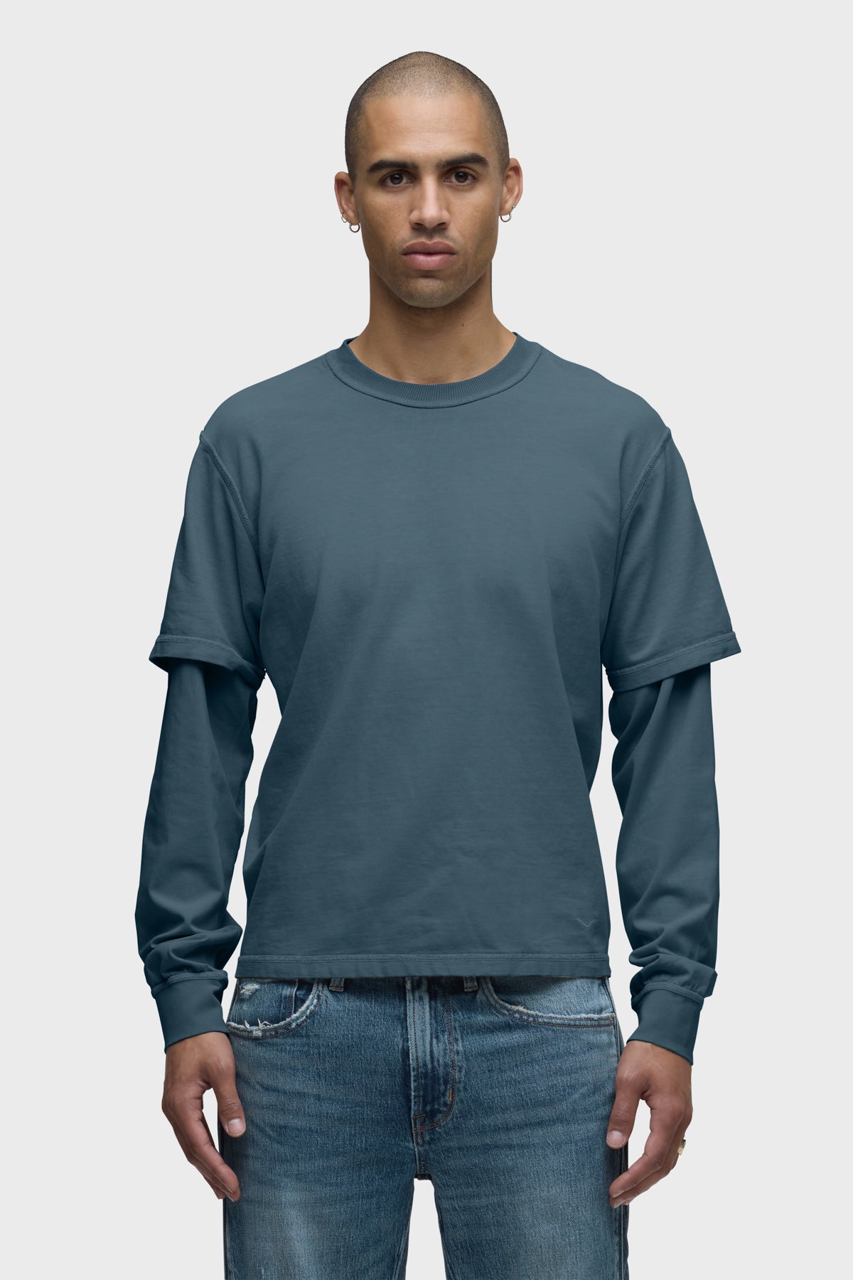 The Hybrid Long Sleeve Tee is made from heavyweight cotton jersey in Meteor, a light blue shade. The style features the throwback combo of a relaxed-fit short sleeve tee layered over a lightweight cotton jersey long sleeve tee. -