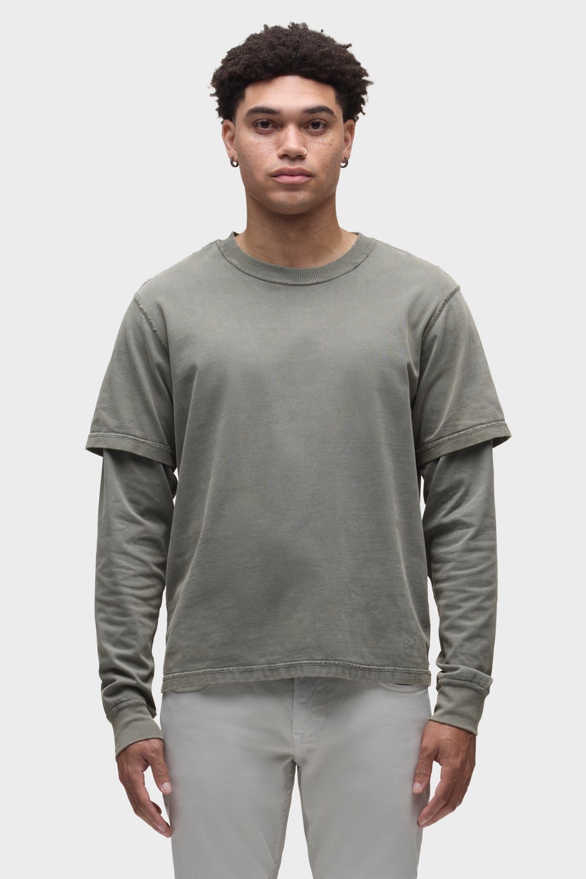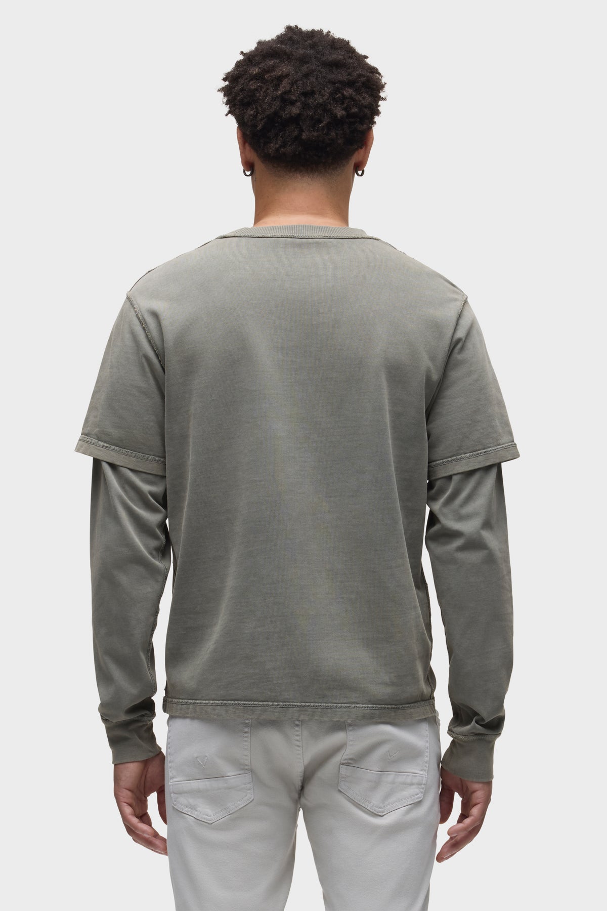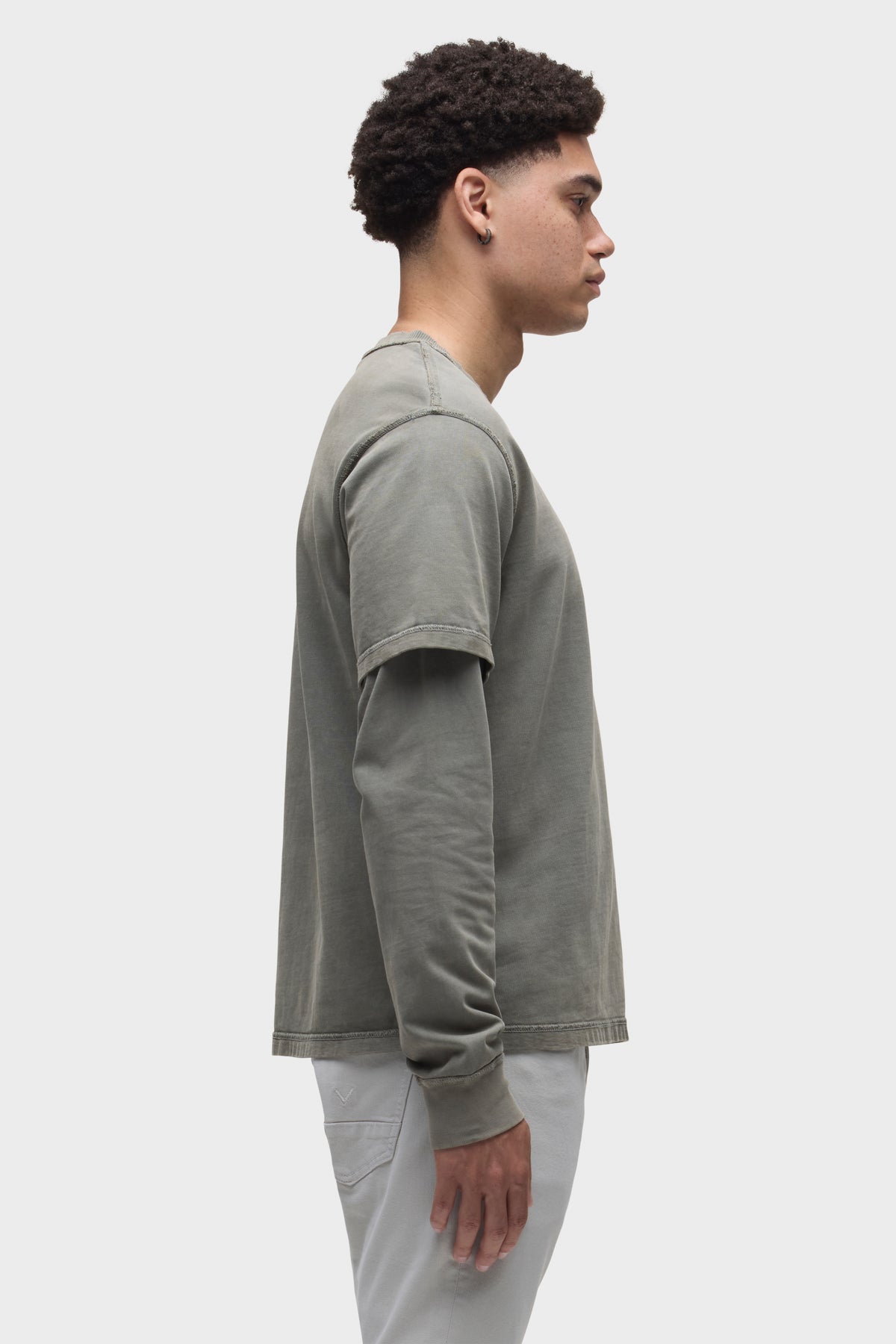 The Hybrid Long Sleeve Tee is made from heavyweight cotton jersey in Stone Grey, a distressed, overdyed dark grey shade with subtle acid washing and edge grinding. The style features the throwback combo of a relaxed-fit short sleeve tee layered over a lightweight cotton jersey long sleeve tee. -