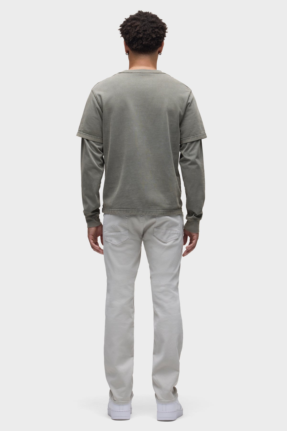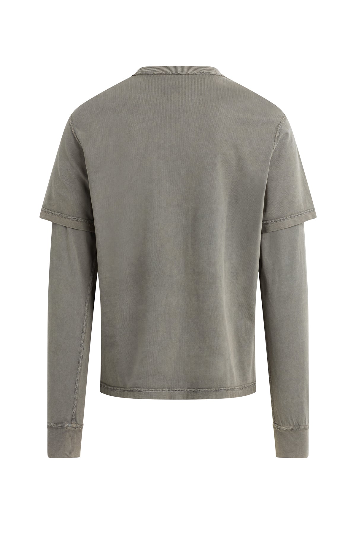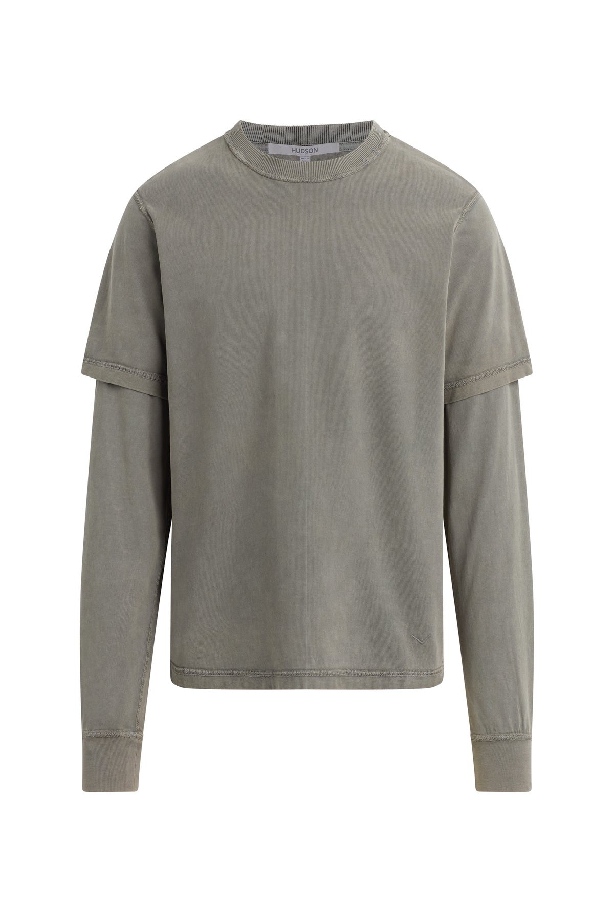The Hybrid Long Sleeve Tee is made from heavyweight cotton jersey in Stone Grey, a distressed, overdyed dark grey shade with subtle acid washing and edge grinding. The style features the throwback combo of a relaxed-fit short sleeve tee layered over a lightweight cotton jersey long sleeve tee. -