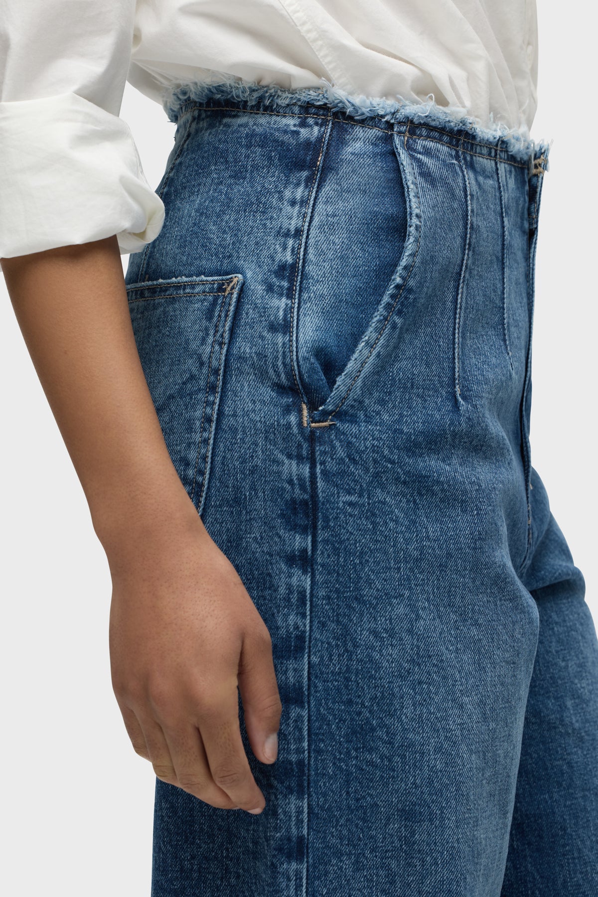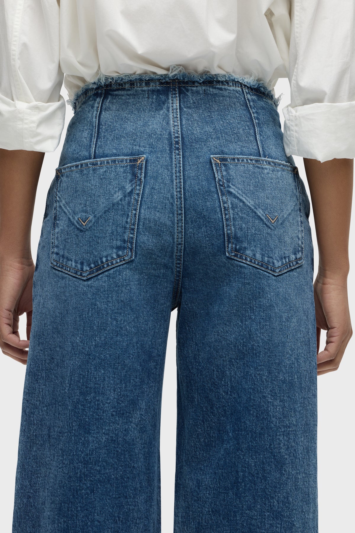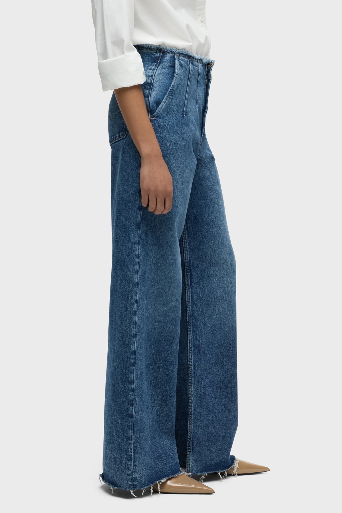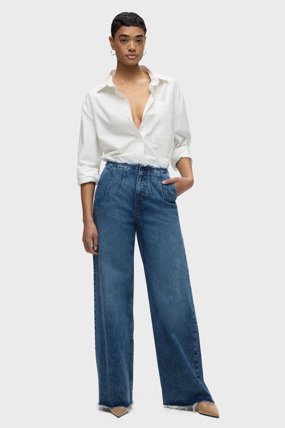 Our James High-Rise Darted Wide Leg Jean in medium-indigo Mallorca wash is cut from Italian premium comfort stretch denim with an elevated waist and wide leg. It's finished with front darts, a frayed-edge waistband, grinding along the edges, a raw hem and trouser pockets. -
