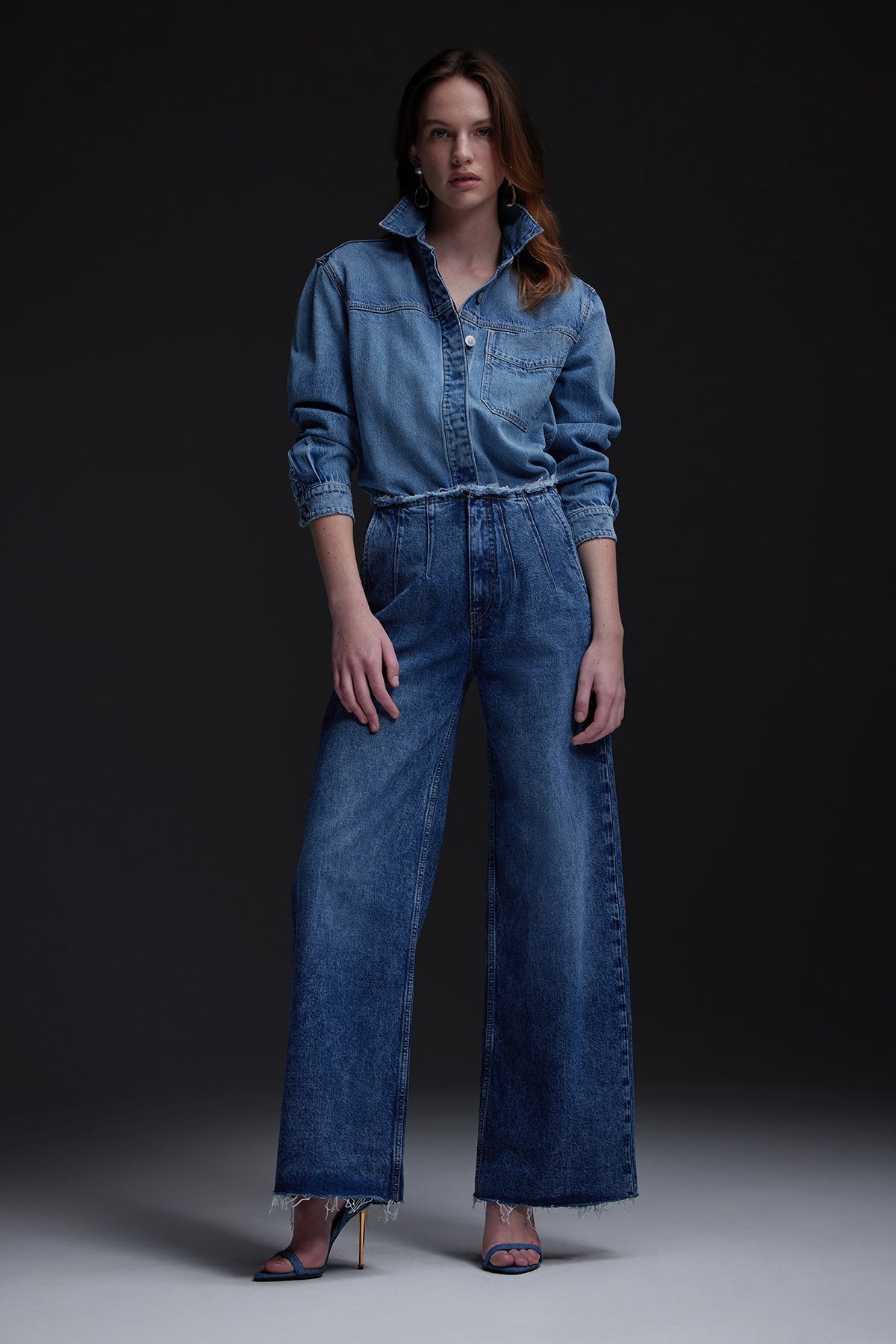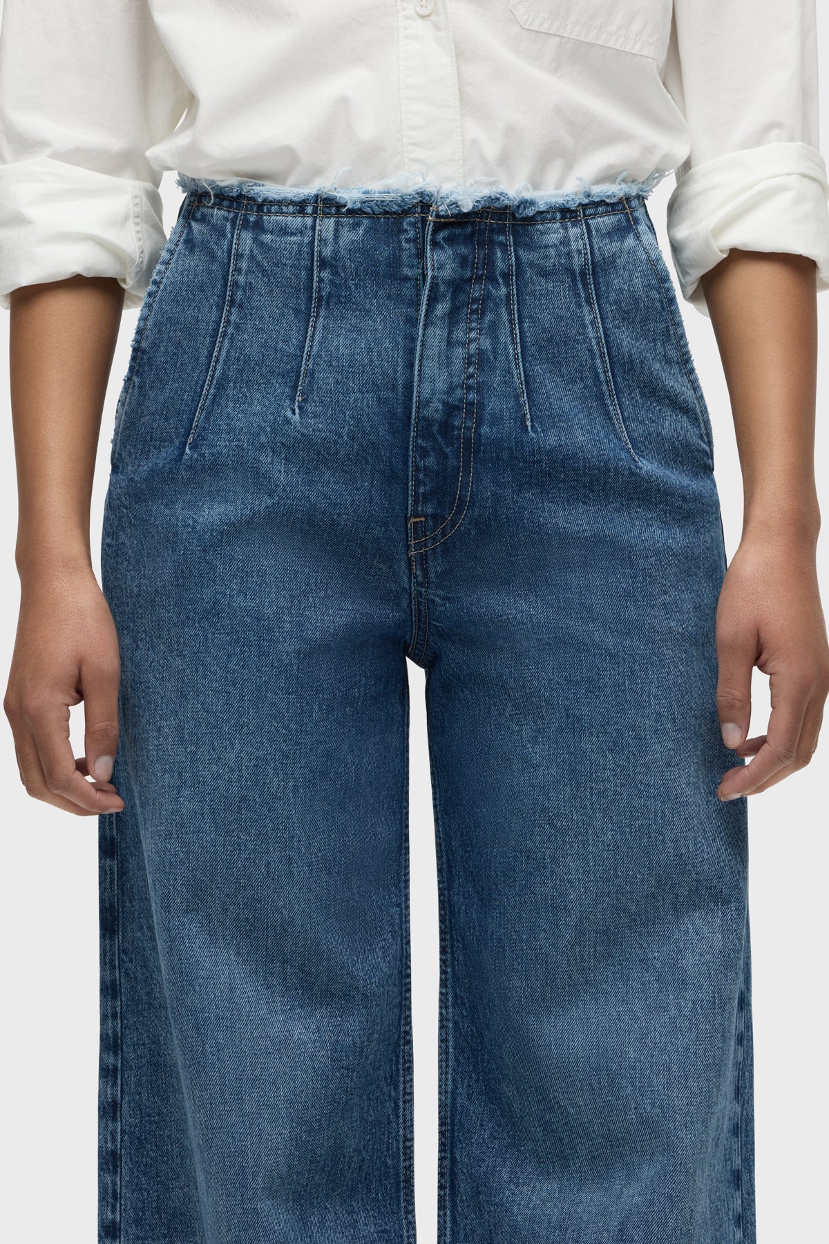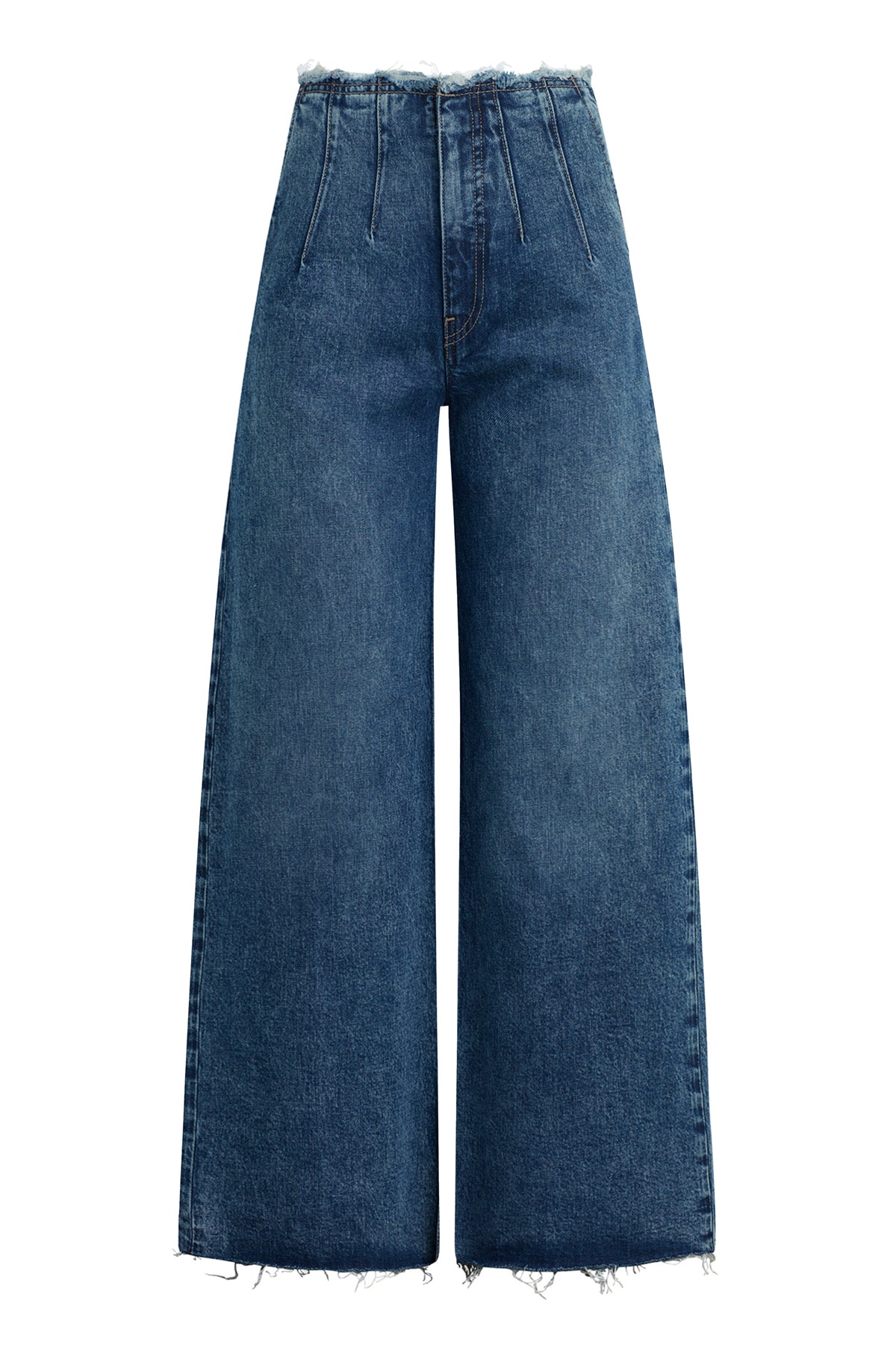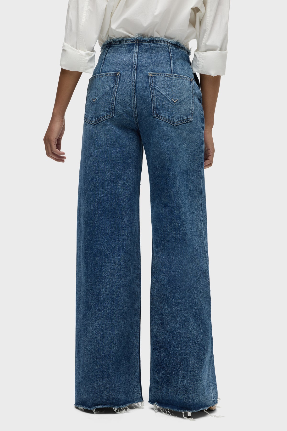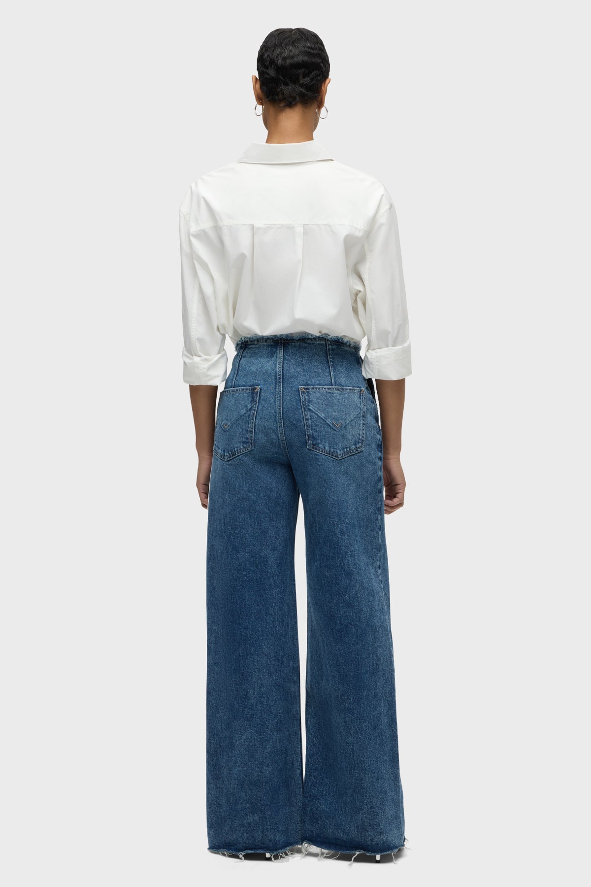 Our James High-Rise Darted Wide Leg Jean in medium-indigo Mallorca wash is cut from Italian premium comfort stretch denim with an elevated waist and wide leg. It's finished with front darts, a frayed-edge waistband, grinding along the edges, a raw hem and trouser pockets. -