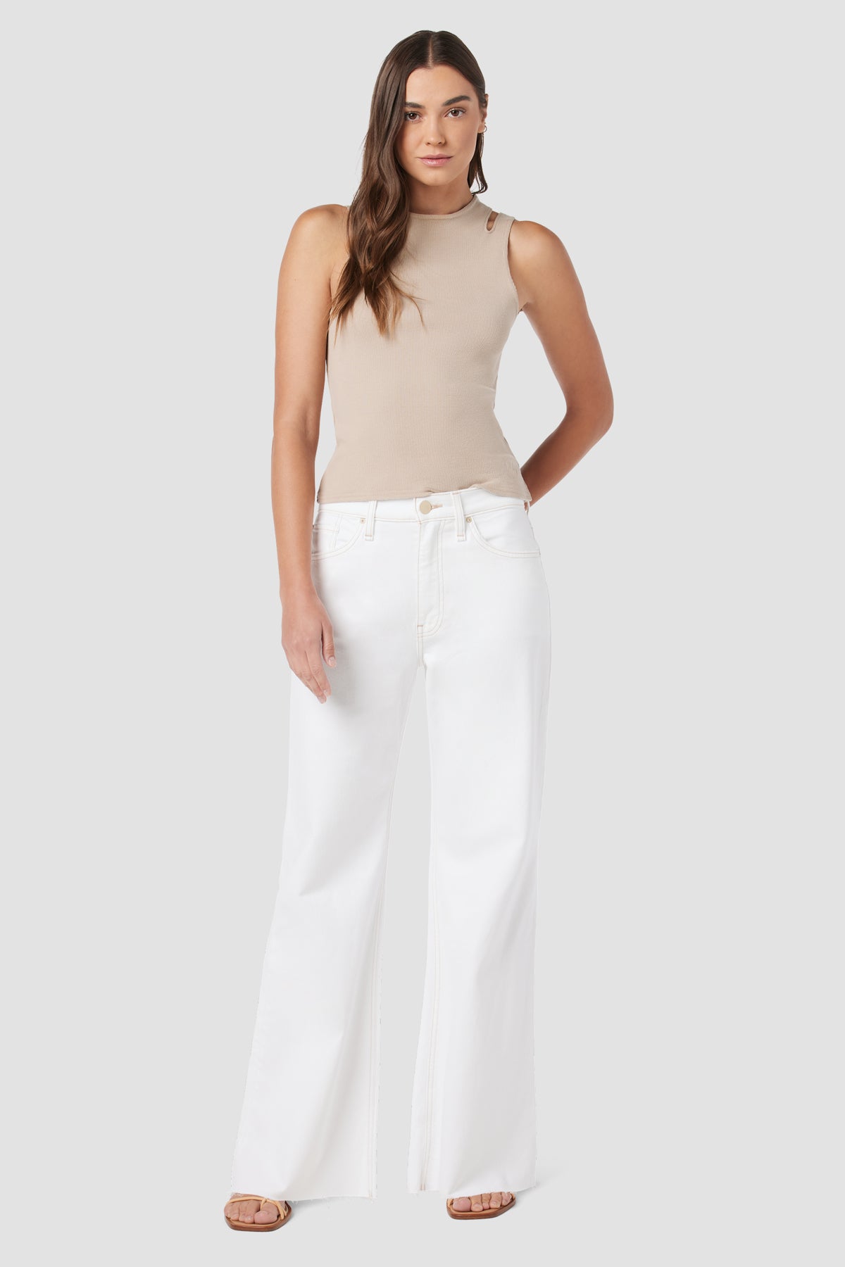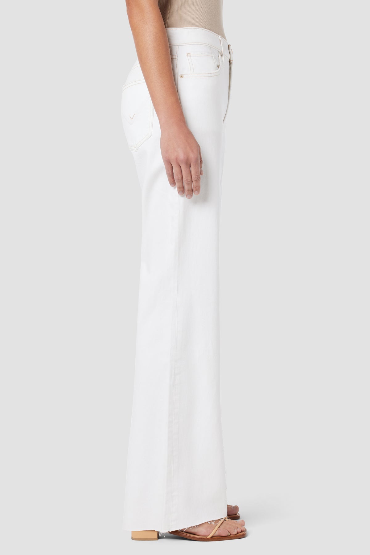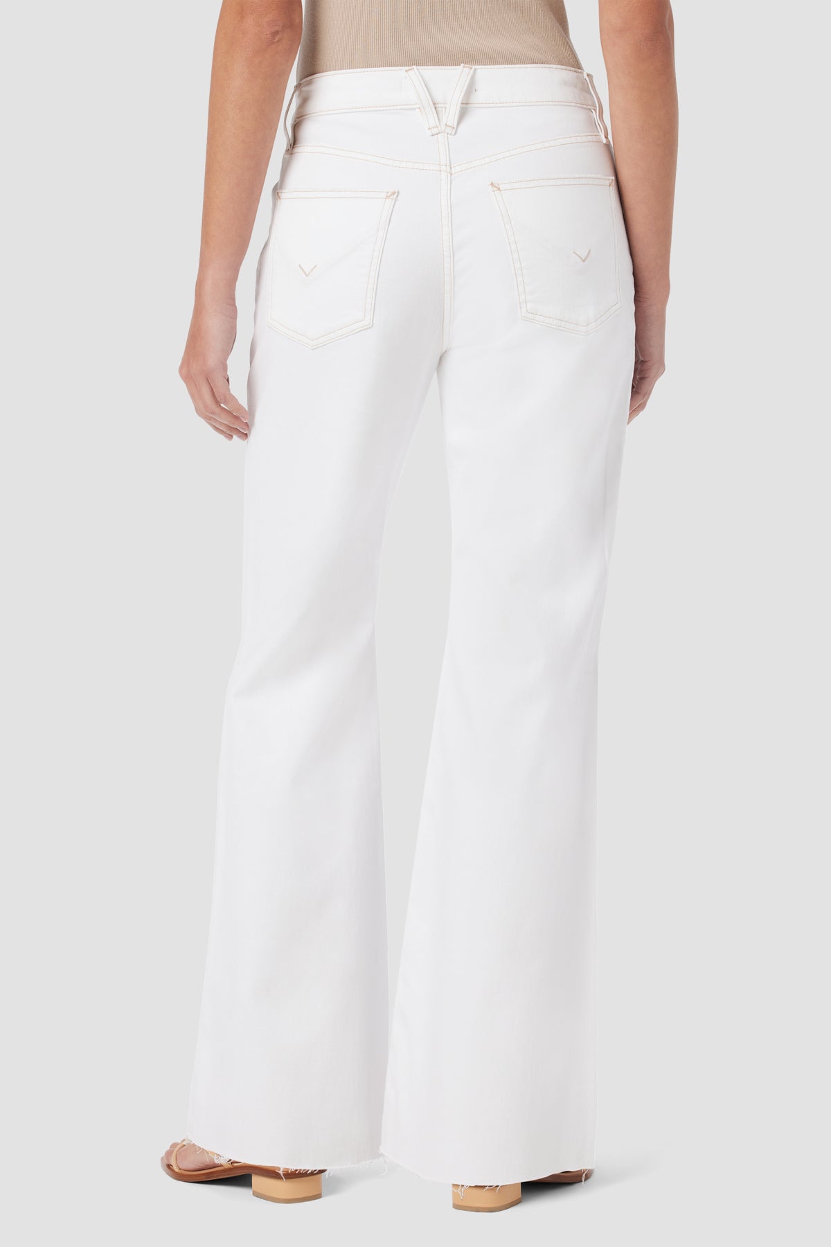 Our Jodie High-Rise Flare Jean in White is cut for a roomy fit with a wide-leg flare from our comfort stretch denim that offers flexibility. Complete with classic five pocket details and a raw hem. -