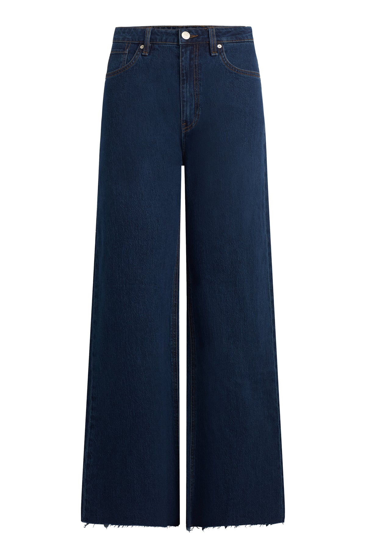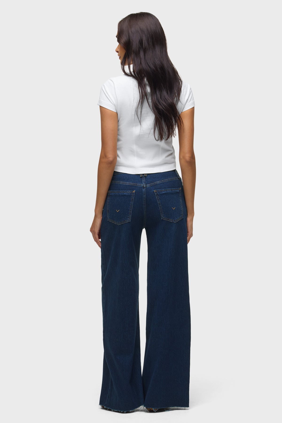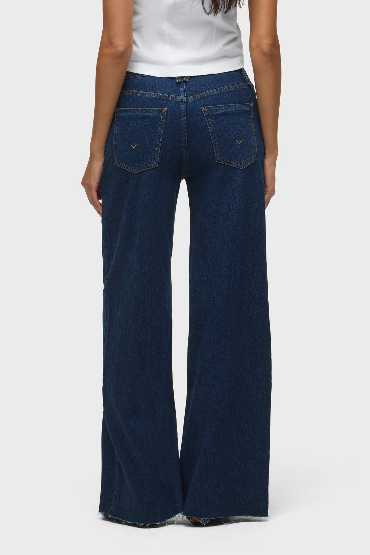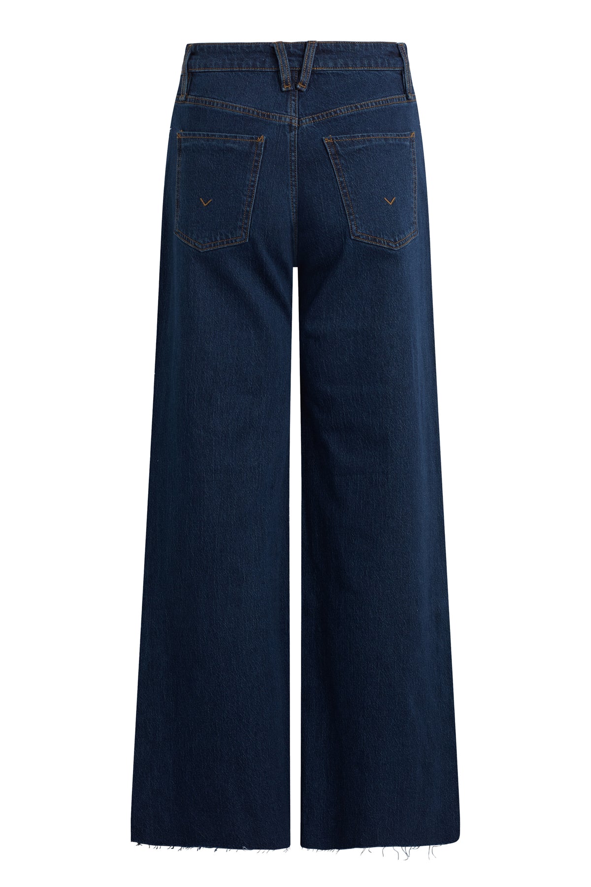 Our Jodie Loose Fit Wide Leg Jean in Moxie has a flattering, roomy fit with a 32" inseam. This pair is made of true comfort stretch denim in a dark indigo wash with a raw hem. -