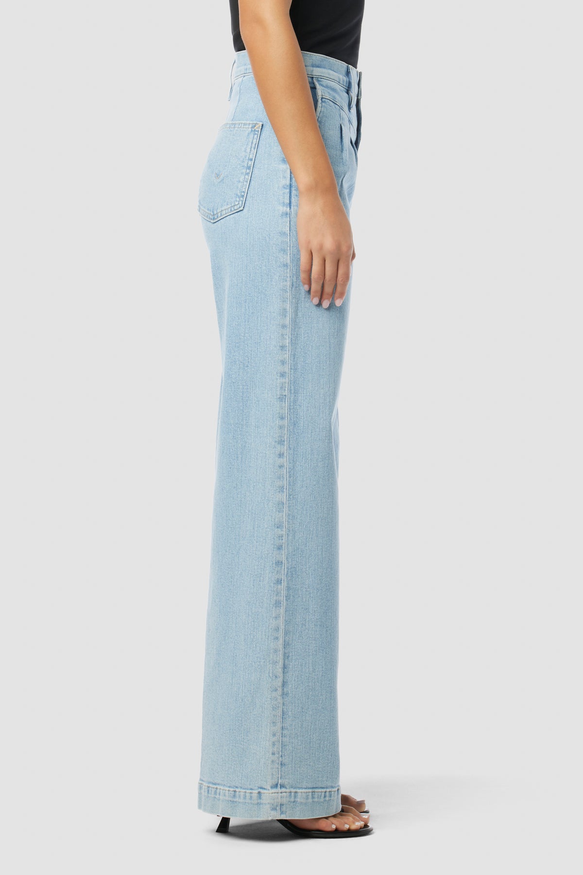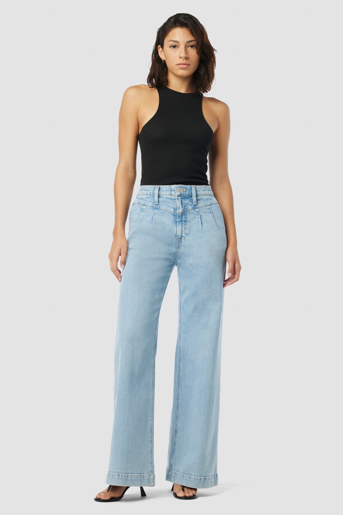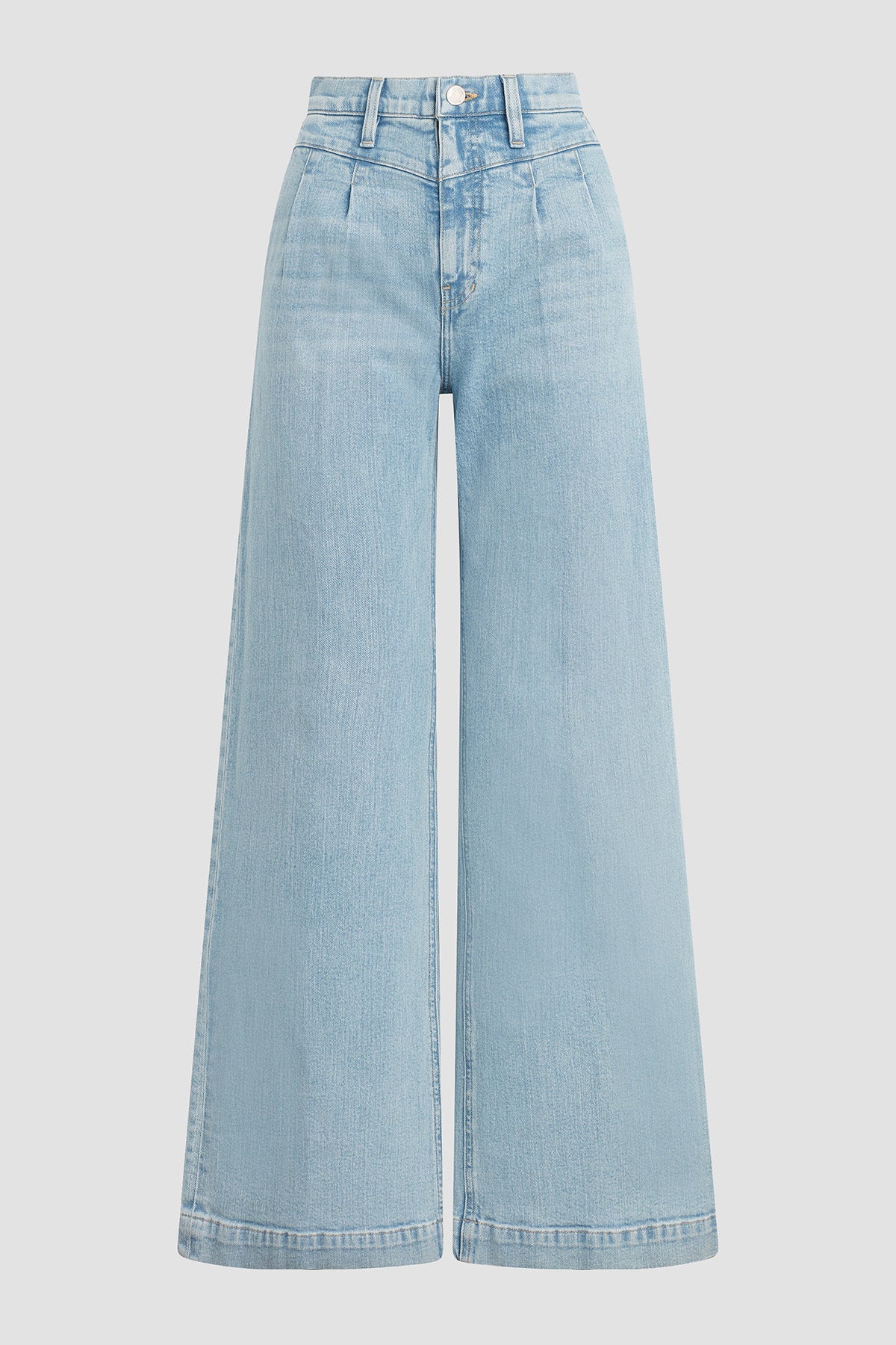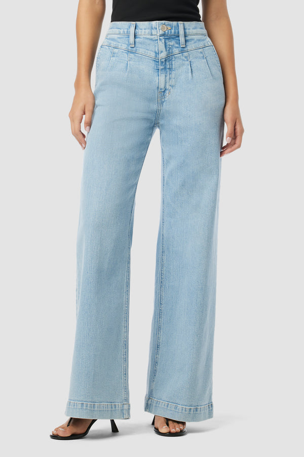 The Jodie Pleated Front Yoke Wide Leg in Carousel has a high rise with a wide leg. The light blue wash is finished front pleating for a dressy denim. -