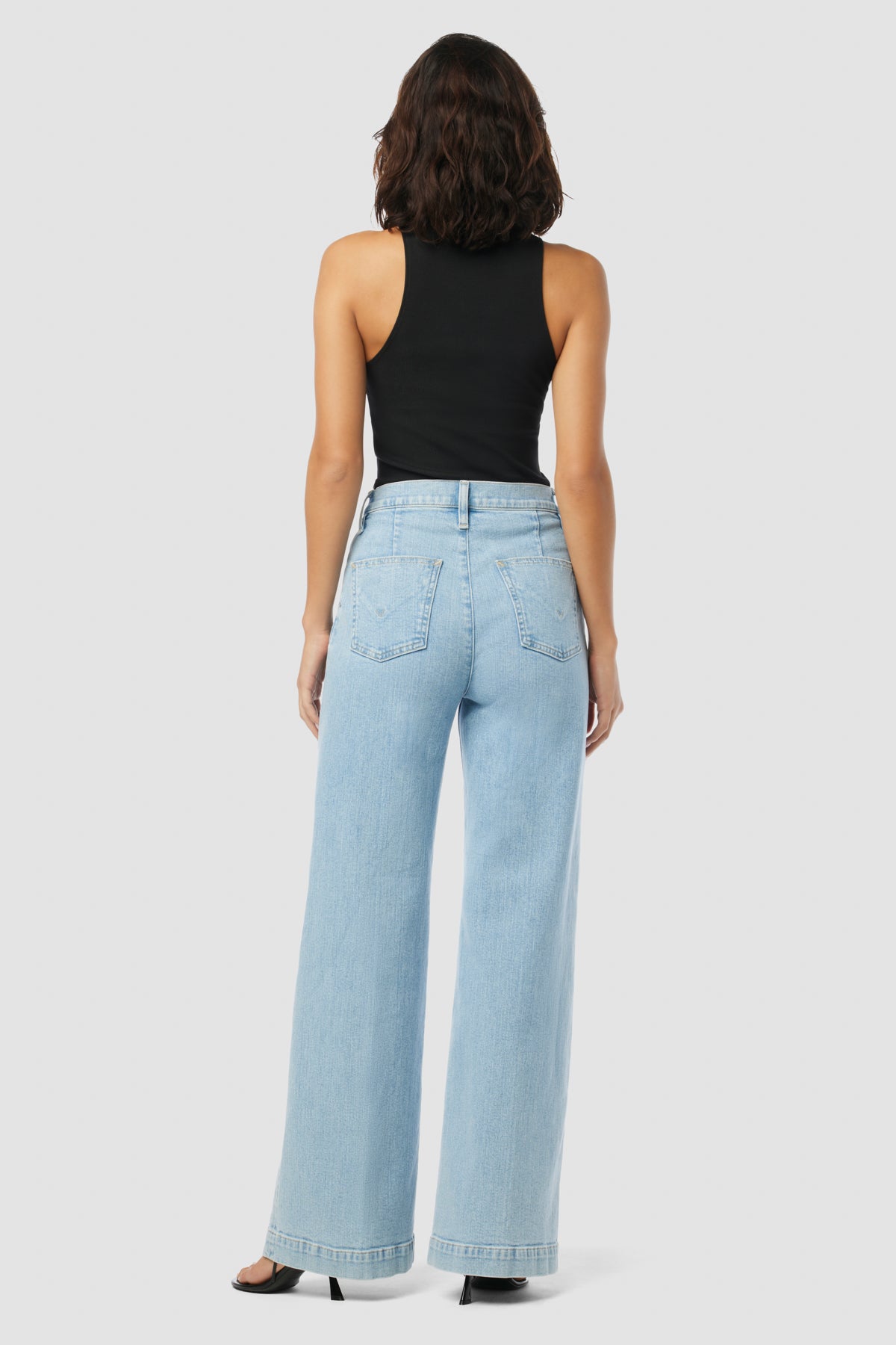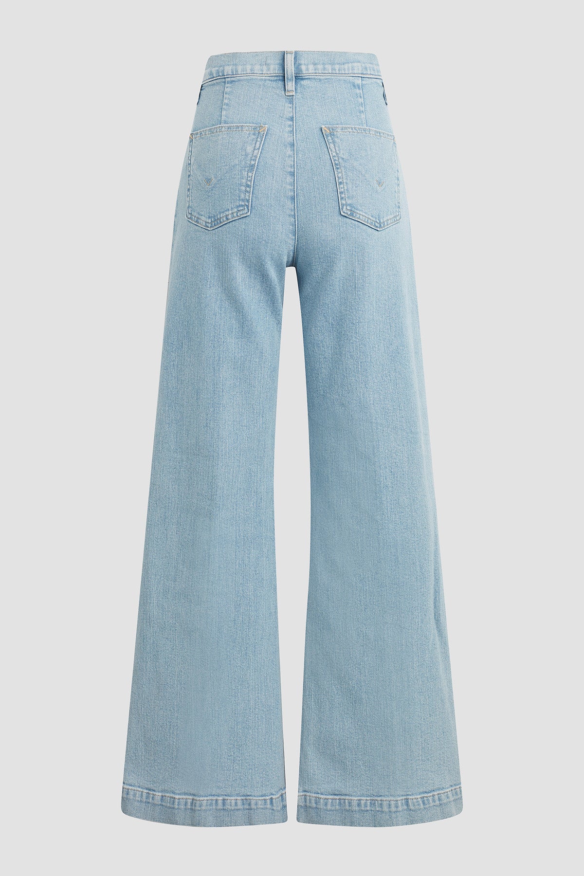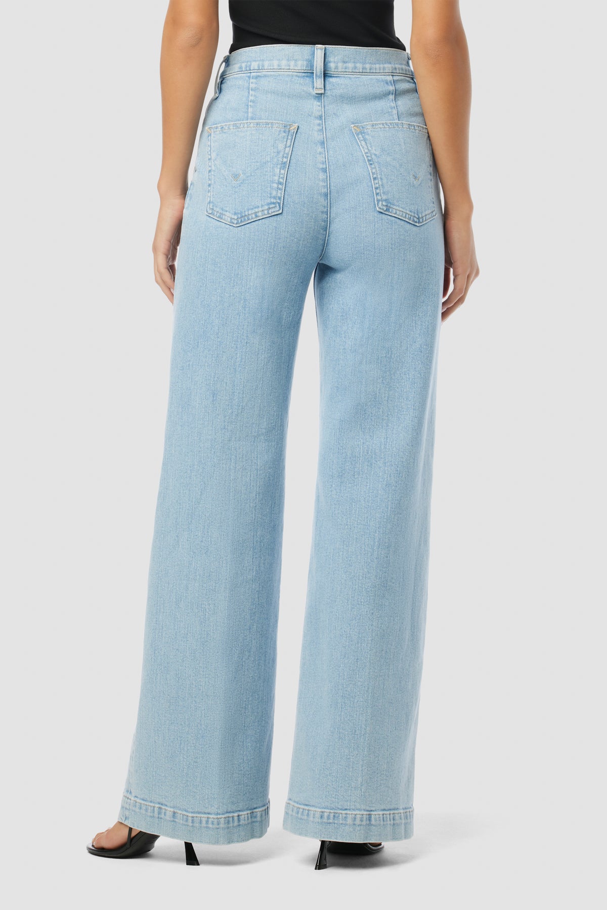 The Jodie Pleated Front Yoke Wide Leg in Carousel has a high rise with a wide leg. The light blue wash is finished front pleating for a dressy denim. -
