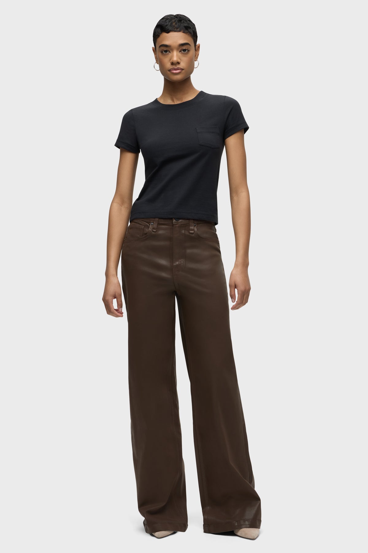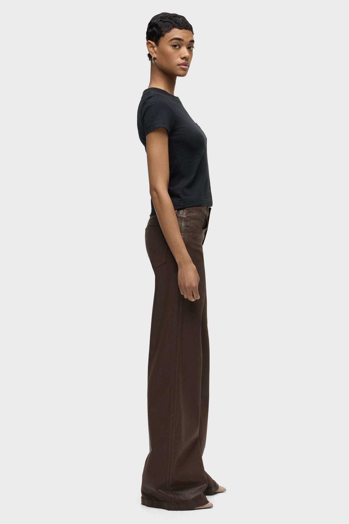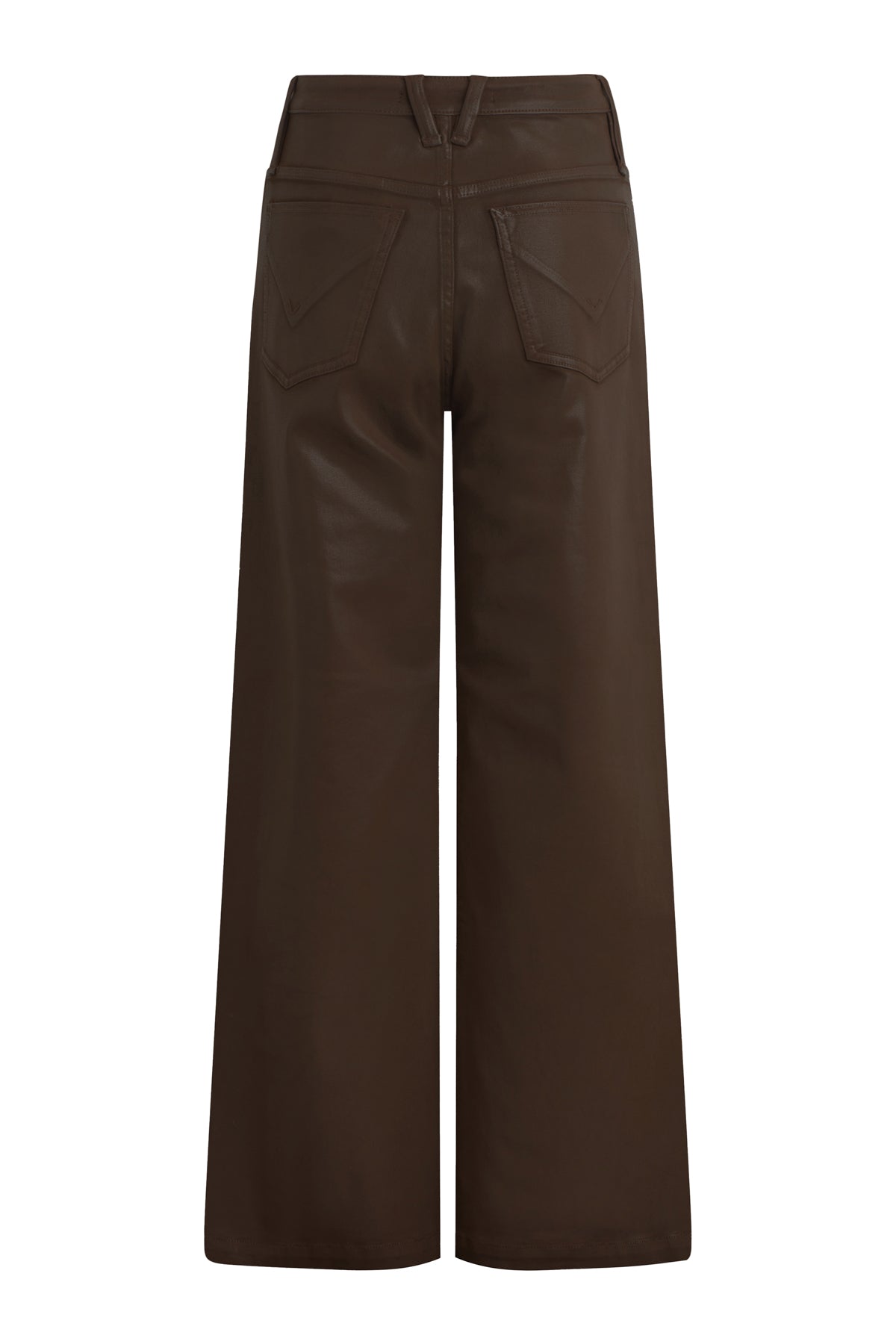 Our Jodie High-Rise Wide Leg Jean in Bracken Coated is cut in a stretch fabric for must-own, roomy fit. Finished with 32" inseam, the pair has classic five-pocket details in chocolate brown with a coating for luxe sheen. -